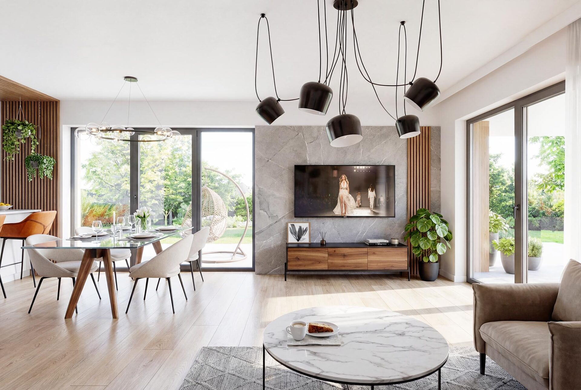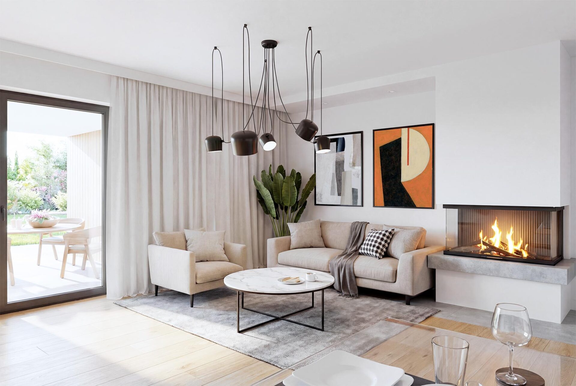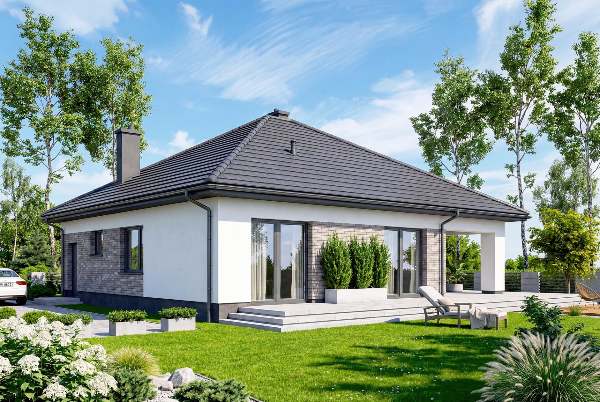 Duża, słoneczna część dzienna oddzielona została od wejścia wygodnym wiatrołapem z szafą. Otwarty salon z kominkiem, jadalnią i kuchnią stanowią serce domu i miejsce wspólnego spędziania czasu z najbliższymi. Przy kuchni przewidziano miejsce na wyspę barową oraz zamkniętą spiżarnię stanowiącą dodatkowe miejsce do przechowywania. Z tyłu domu znajduje się rozległy, zadaszony taras, stanowiący idealne miejsce do letniego spędzania czasu na świeżym powietrzu. Na wydzieloną korytarzem strefę nocną składają się trzy komfortowe sypialnie, w tym jedna z garderobą. W pełni wyposażona łazienka z wanną i prysznicem posiada wydzielone miejsce na pralkę w zabudowie.