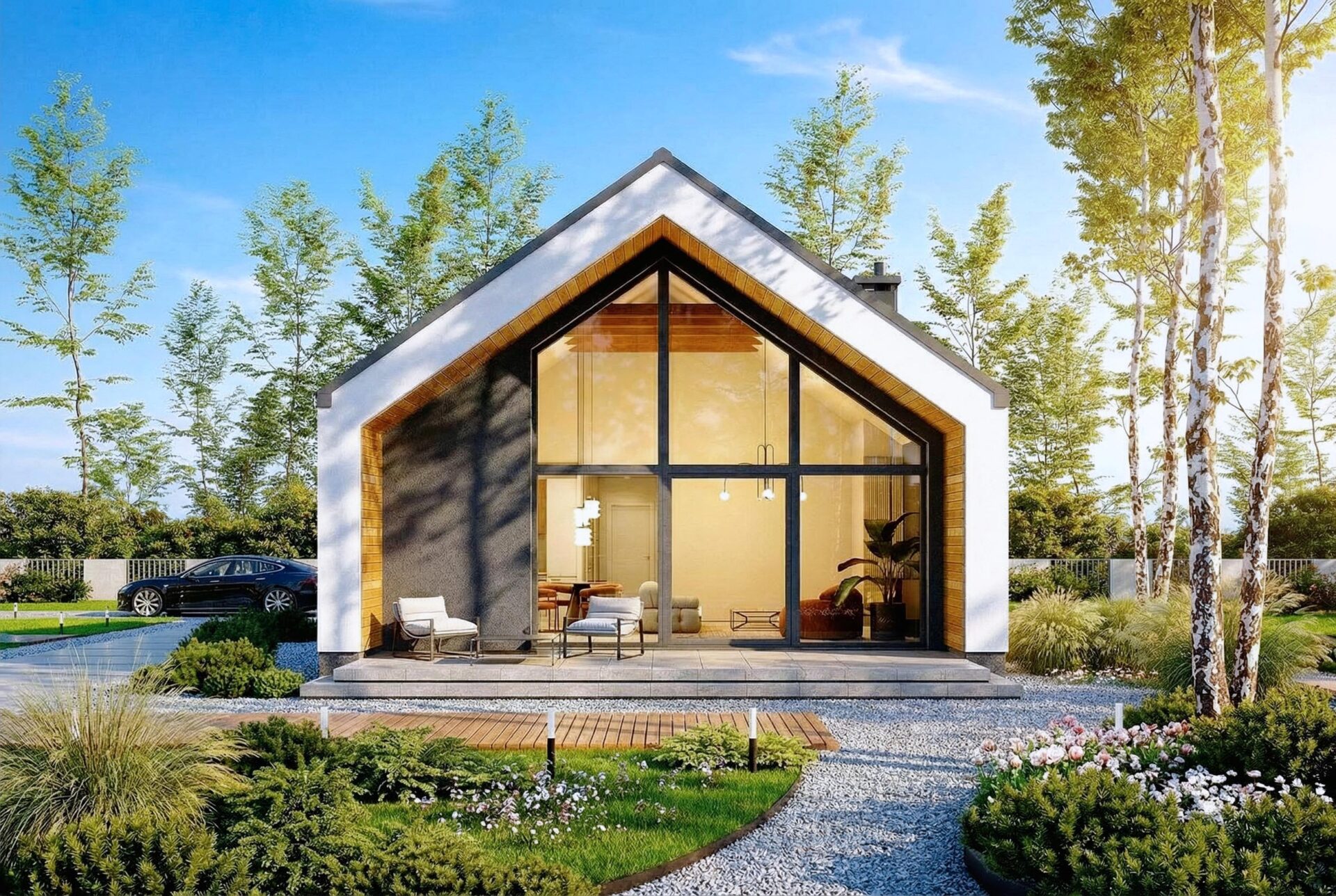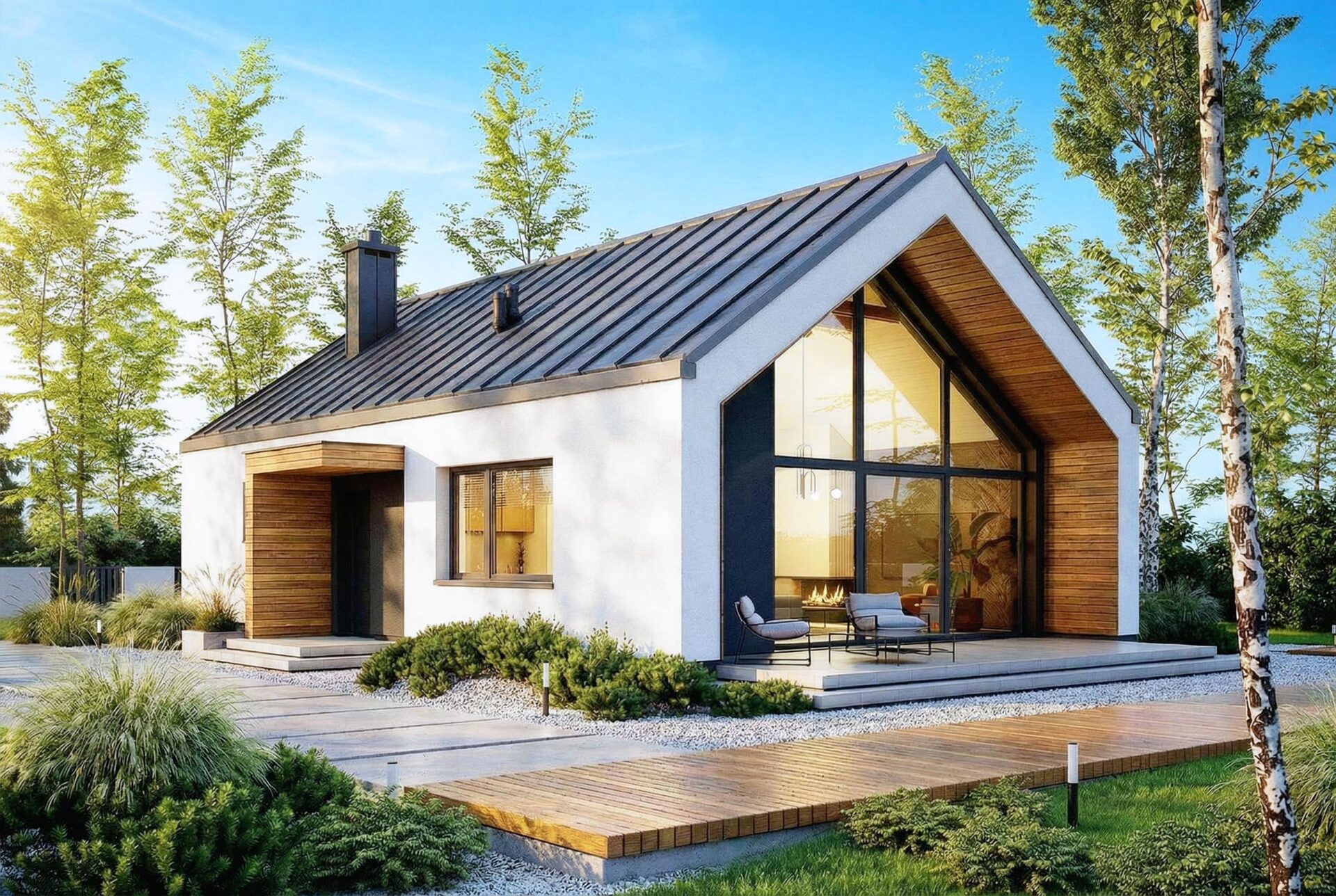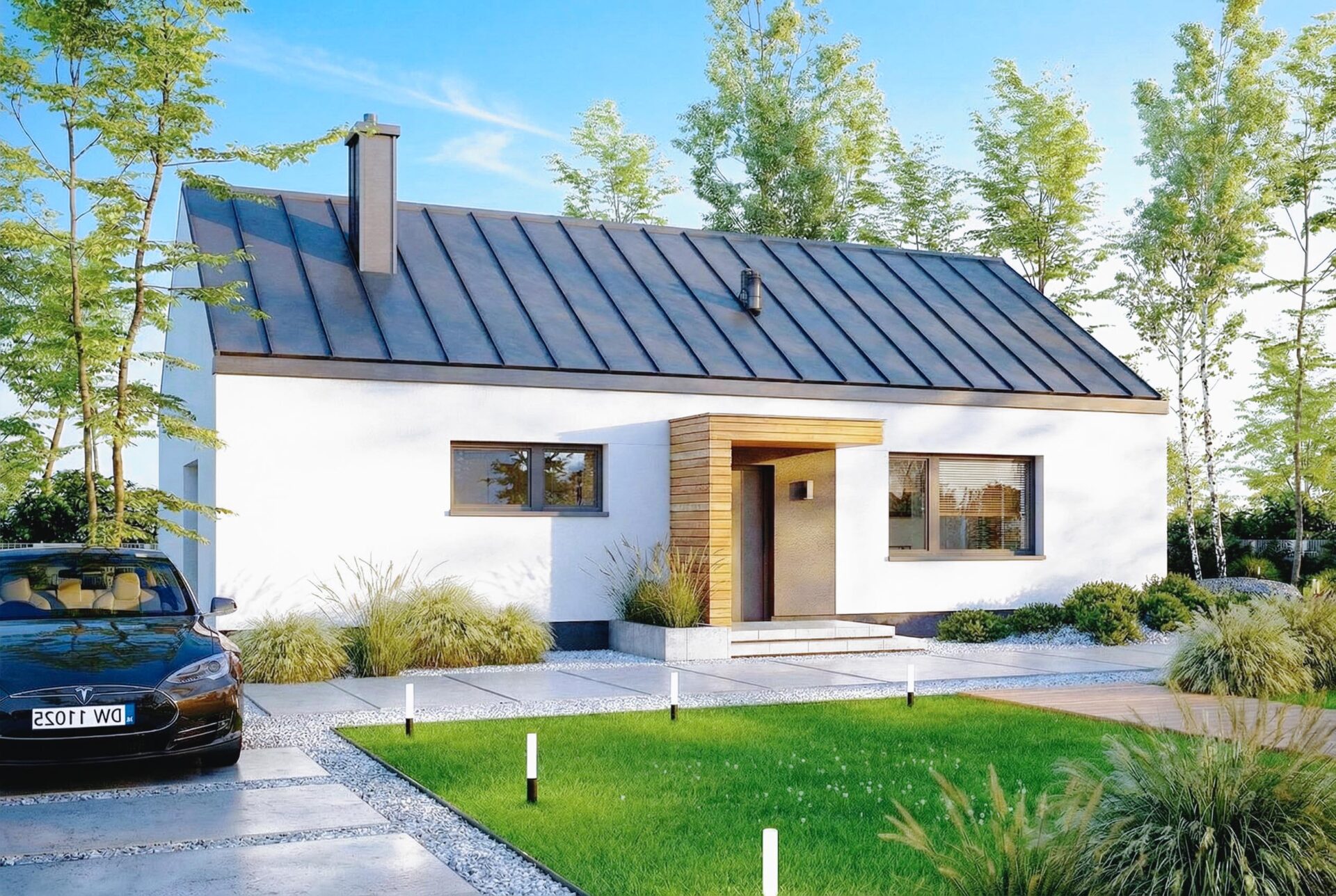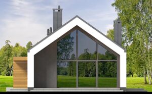 Armonia to propozycja domu w stylu nowoczesnej stodoły. Nowoczesny budynek o dwuspadowym, bezokapowym dachu wyróżnia się efektowną formą i atrakcyjnie przeszkloną elewacją ogrodową, która nadaje mu lekkości. Antracytowy tynk i drewno harmonijnie współgrają ze sobą, tworząc spójną kompozycję. Rozległe przeszklenia sięgające połaci dachu to jeden z największych atutów domu, wypełniając wnętrze światłem i harmonijnie łączą je z otoczeniem.