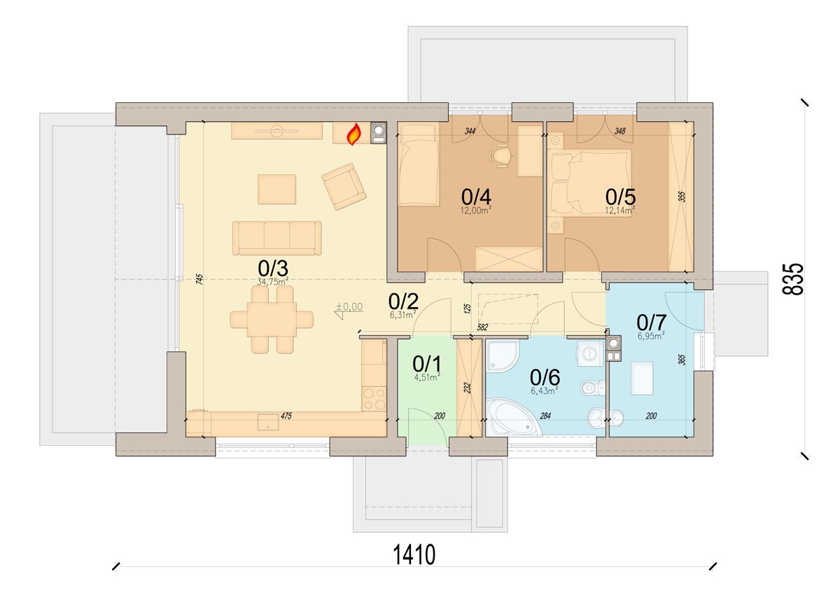 Przemyślany układ pomieszczeń zapewnia maksymalny komfort codziennego użytkowania – przestronny salon z jadalnią i kominkiem tworzy serce domu, sprzyjające wspólnemu spędzaniu czasu. Kuchnia oferuję dużą powierzchnię blatu roboczego. Dwie wygodne sypialnie gwarantują prywatność i spokój. Przy nich znajduje się przestronna łazienka z wanną oraz prysznicem. Kotłownia posiada dodatkowe drzwi zewnętrze zwiększając komfort użytkowania. Zaprojektowano w niej ogrzewanie na paliwo stałe, oraz instalację gazową co ułatwi na etapie adaptacji zmianę źródła ogrzewania na gazowe. Aby można było wykorzystać poddasze, w korytarzu zaprojektowano otwór w stropie na schody spuszczane.