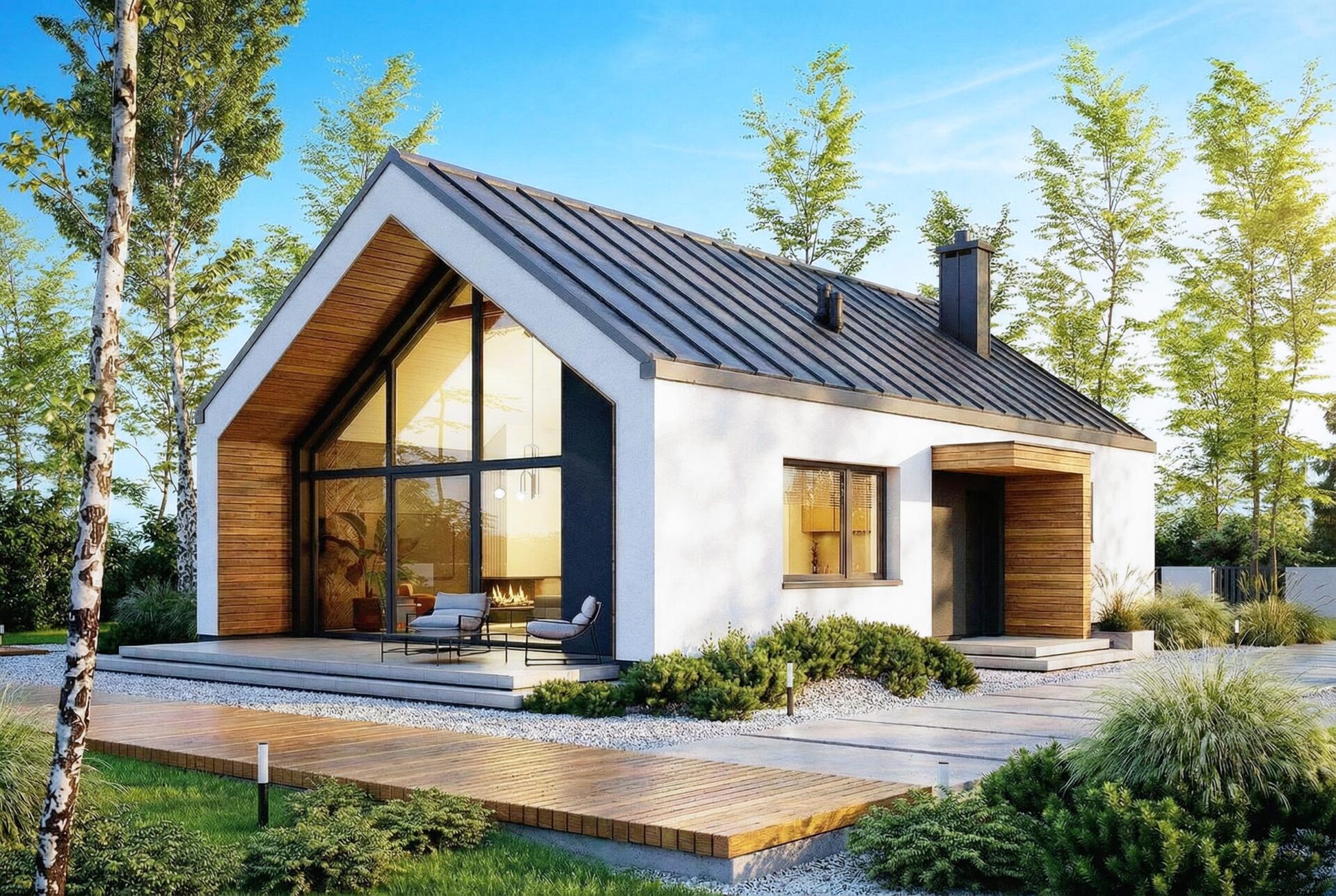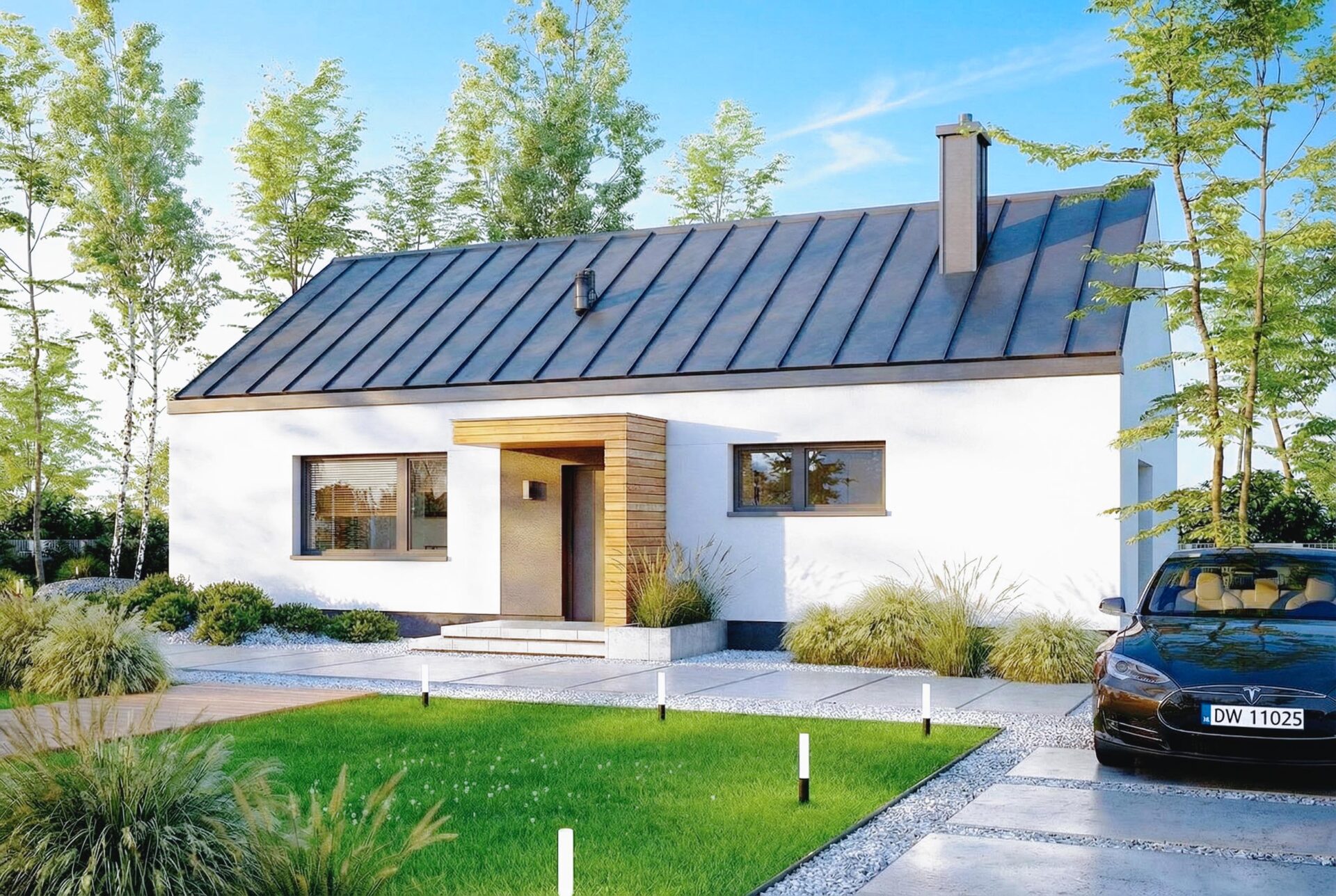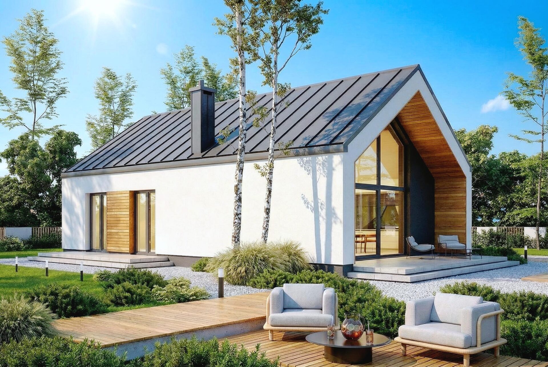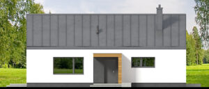 Armonia to propozycja domu w stylu nowoczesnej stodoły. Nowoczesny budynek o dwuspadowym, bezokapowym dachu wyróżnia się efektowną formą i atrakcyjnie przeszkloną elewacją ogrodową, która nadaje mu lekkości. Antracytowy tynk i drewno harmonijnie współgrają ze sobą, tworząc spójną kompozycję. Rozległe przeszklenia sięgające połaci dachu to jeden z największych atutów domu, wypełniając wnętrze światłem i harmonijnie łączą je z otoczeniem.