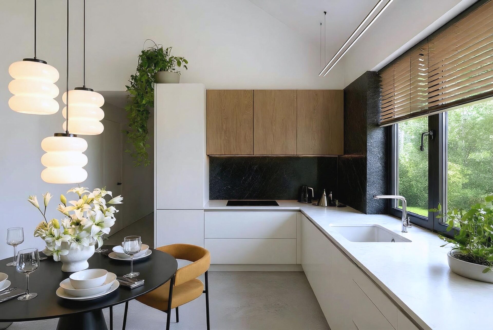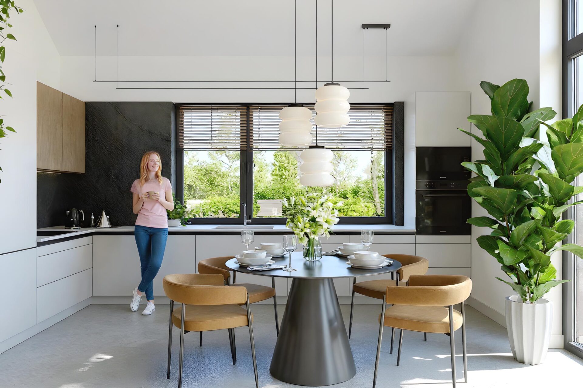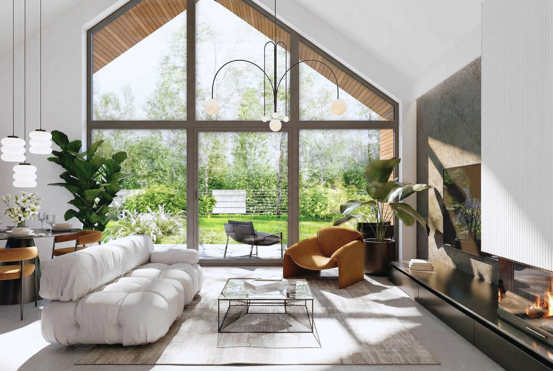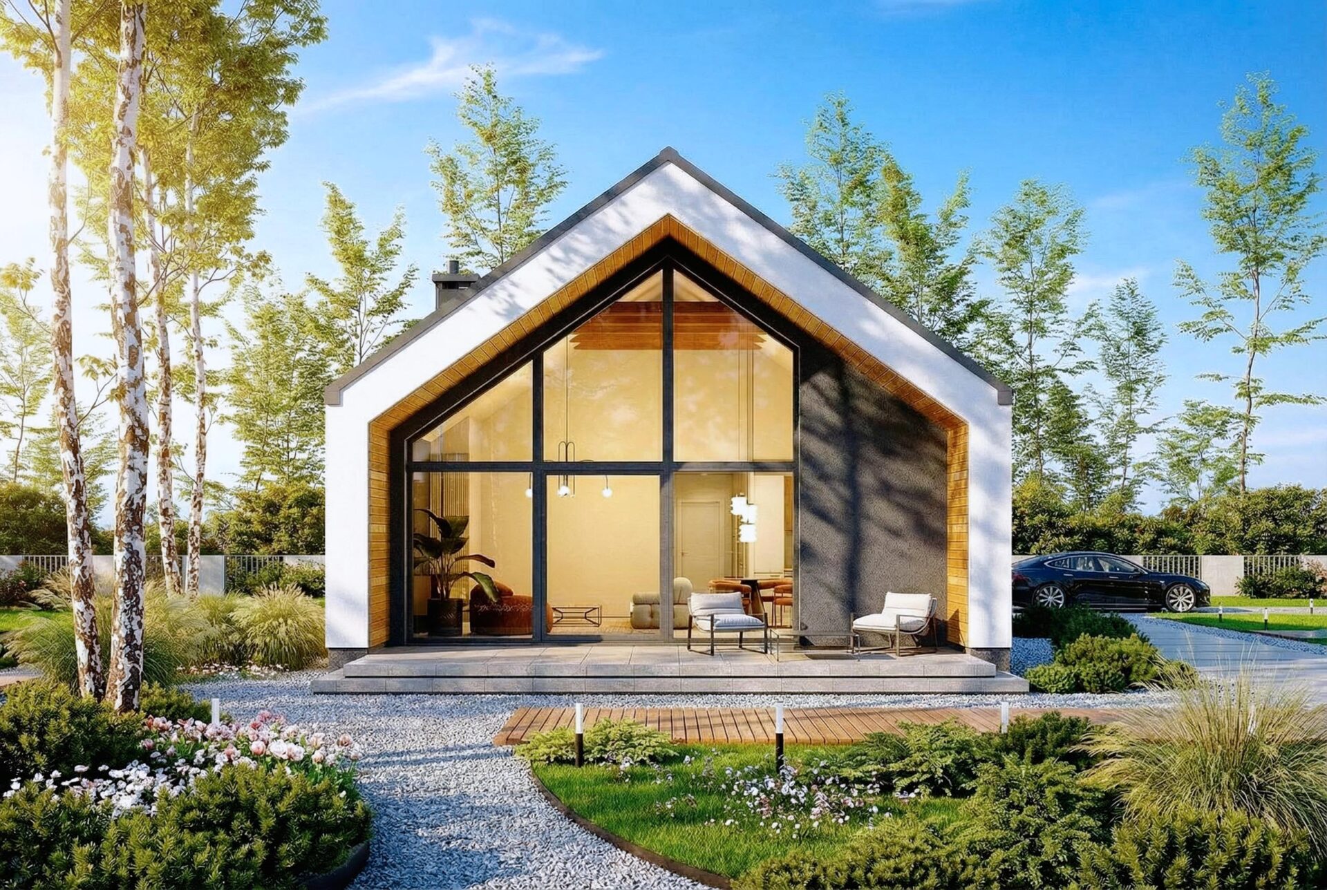 Armonia to propozycja domu w stylu nowoczesnej stodoły. Nowoczesny budynek o dwuspadowym, bezokapowym dachu wyróżnia się efektowną formą i atrakcyjnie przeszkloną elewacją ogrodową, która nadaje mu lekkości. Antracytowy tynk i drewno harmonijnie współgrają ze sobą, tworząc spójną kompozycję. Rozległe przeszklenia sięgające połaci dachu to jeden z największych atutów domu, wypełniając wnętrze światłem i harmonijnie łączą je z otoczeniem.