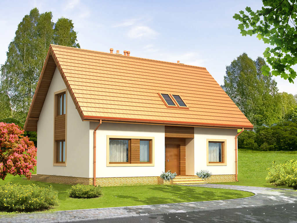 Ciekawy detal architektoniczny i ciepła kolorystyka elewacji – zawarte w prostej formie , sprawiają że dom ma atrakcyjny wygląd, a do tego jest prosty i tani w budowie.