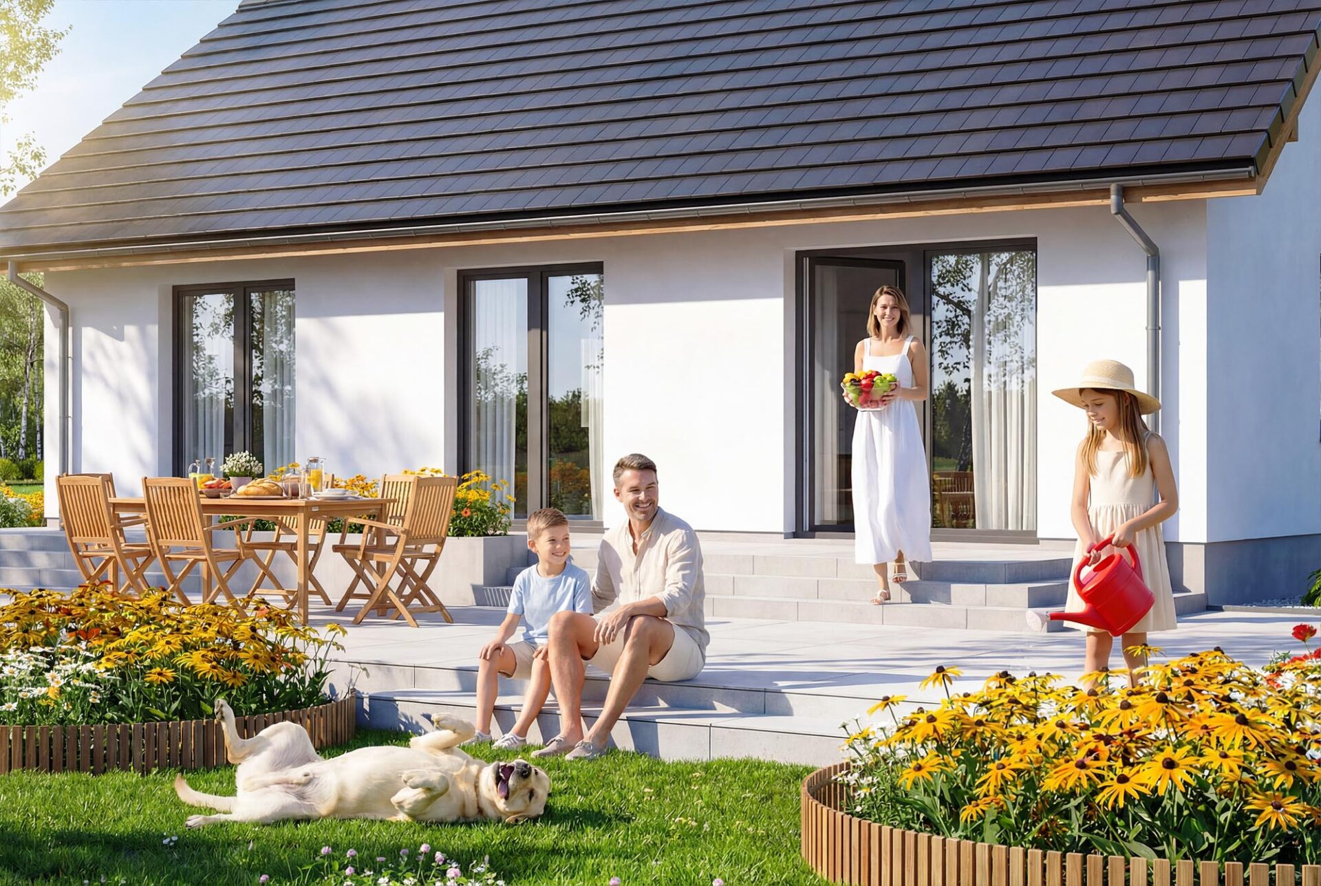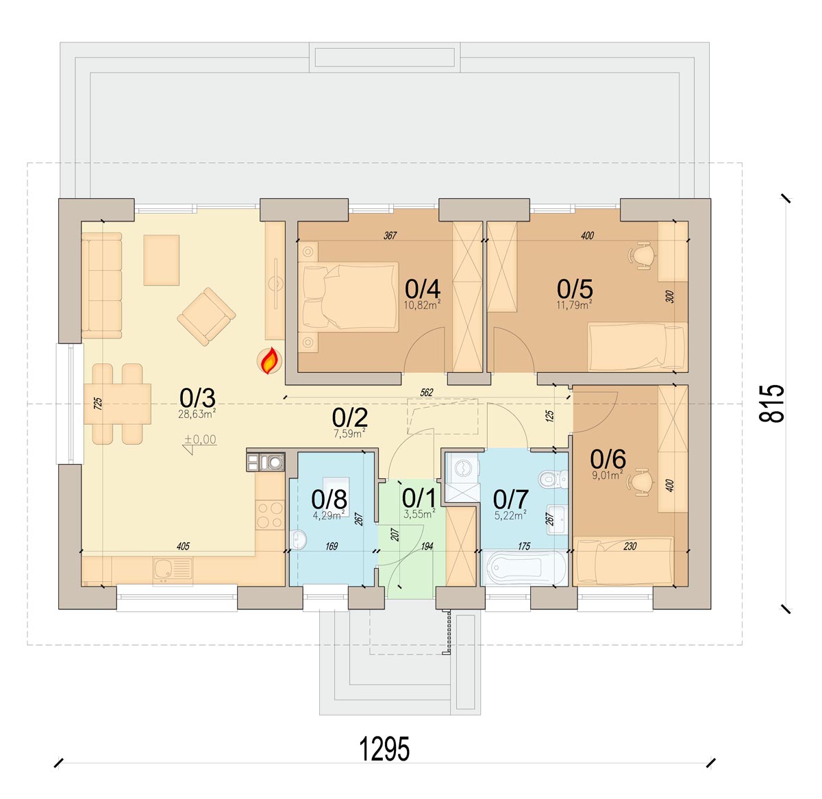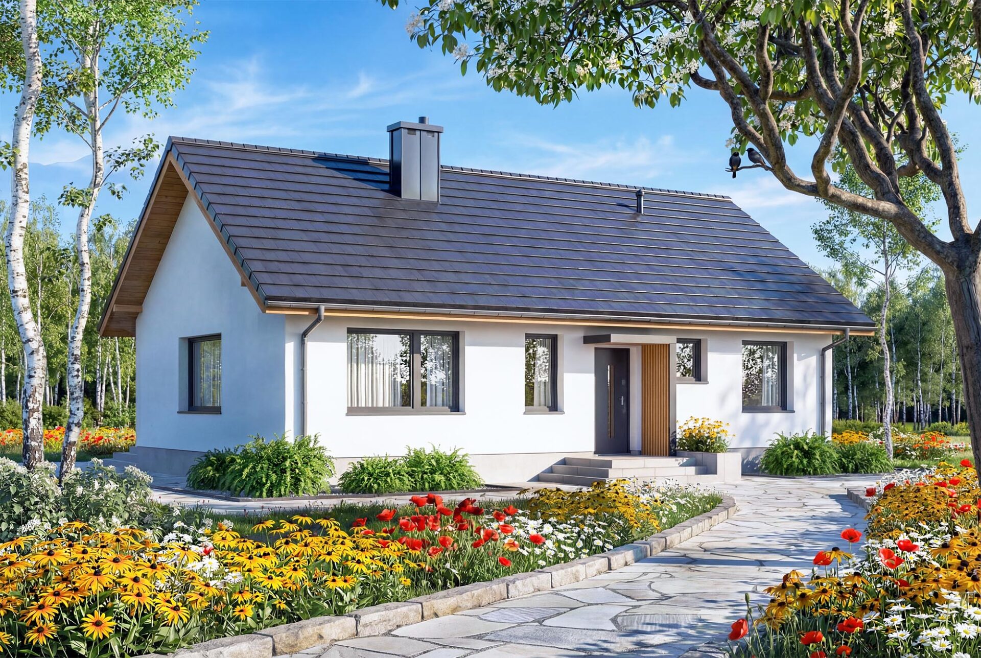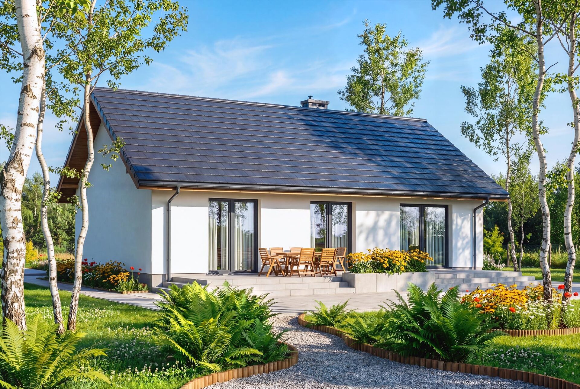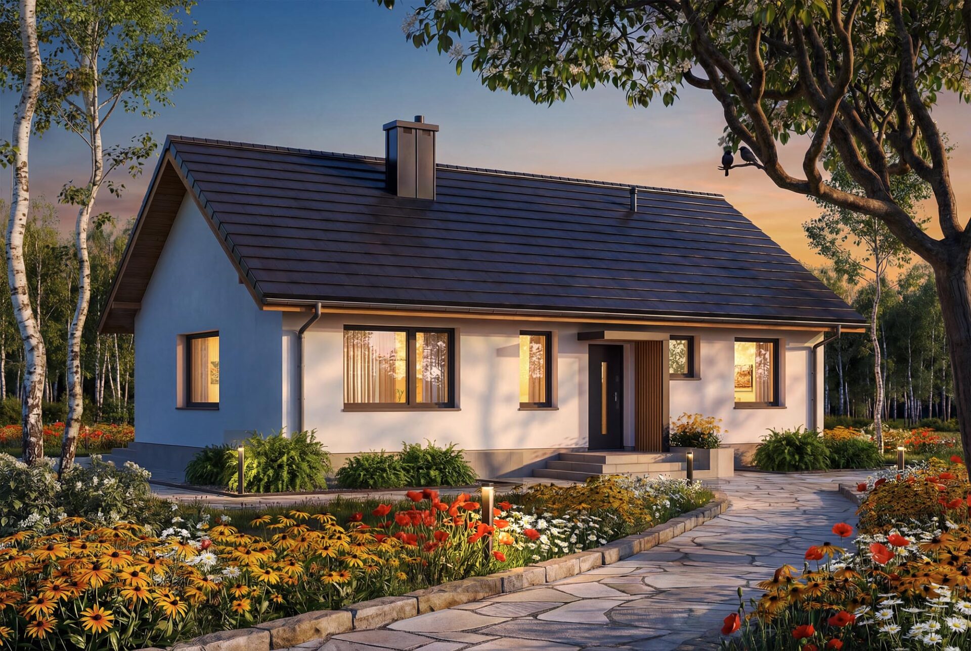 Bambino mini to projekt komfortowego i przytulnego domu jednorodzinnego z przemyślanym układem funkcjonalnym, utrzymanego w tradycyjnej formie. Jasna, subtelna kolorystyka tynków nadaje bryle lekkości i świeżości, jednocześnie doskonale wpisując się w każde otoczenie. Prosta, czysta linia elewacji sprawia, że budynek prezentuje się elegancko i nowocześnie, a jednocześnie jest niezwykle uniwersalny – łatwy do personalizacji według indywidualnych gustów przyszłych mieszkańców. Sercem domu jest przestronny salon połączony z jadalnią i aneksem kuchennym, który dzięki dużym przeszkleniom naturalnie łączy się z ogrodem, optycznie powiększając przestrzeń wypoczynkową. W projekcie znajdują się trzy ustawne sypialnie oraz funkcjonalna łazienka, co zapewnia pełną intymność każdemu z członków rodziny. Aby można było wykorzystać poddasze, w korytarzu zaprojektowano otwór w stropie na schody spuszczane. Kotłownie funkcjonalnie oddzielono od części mieszkalnej poprzez wiatrołap. Zaprojektowano w niej ogrzewanie na paliwo stałe, oraz instalację gazową co ułatwi na etapie adaptacji zmianę źródła ogrzewania na gazowe. Prosta bryła i nieskomplikowana konstrukcja ułatwiają i przyspieszają budowę, a zastosowane rozwiązania energooszczędne pozwalają obniżyć koszty eksploatacji, bez zwiększania kosztów realizacji. To projekt, który nie tylko świetnie wygląda – ale również doskonale się w nim mieszka.