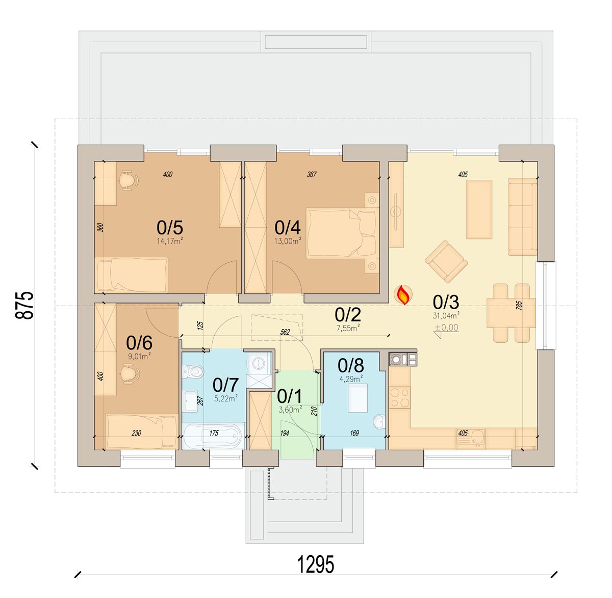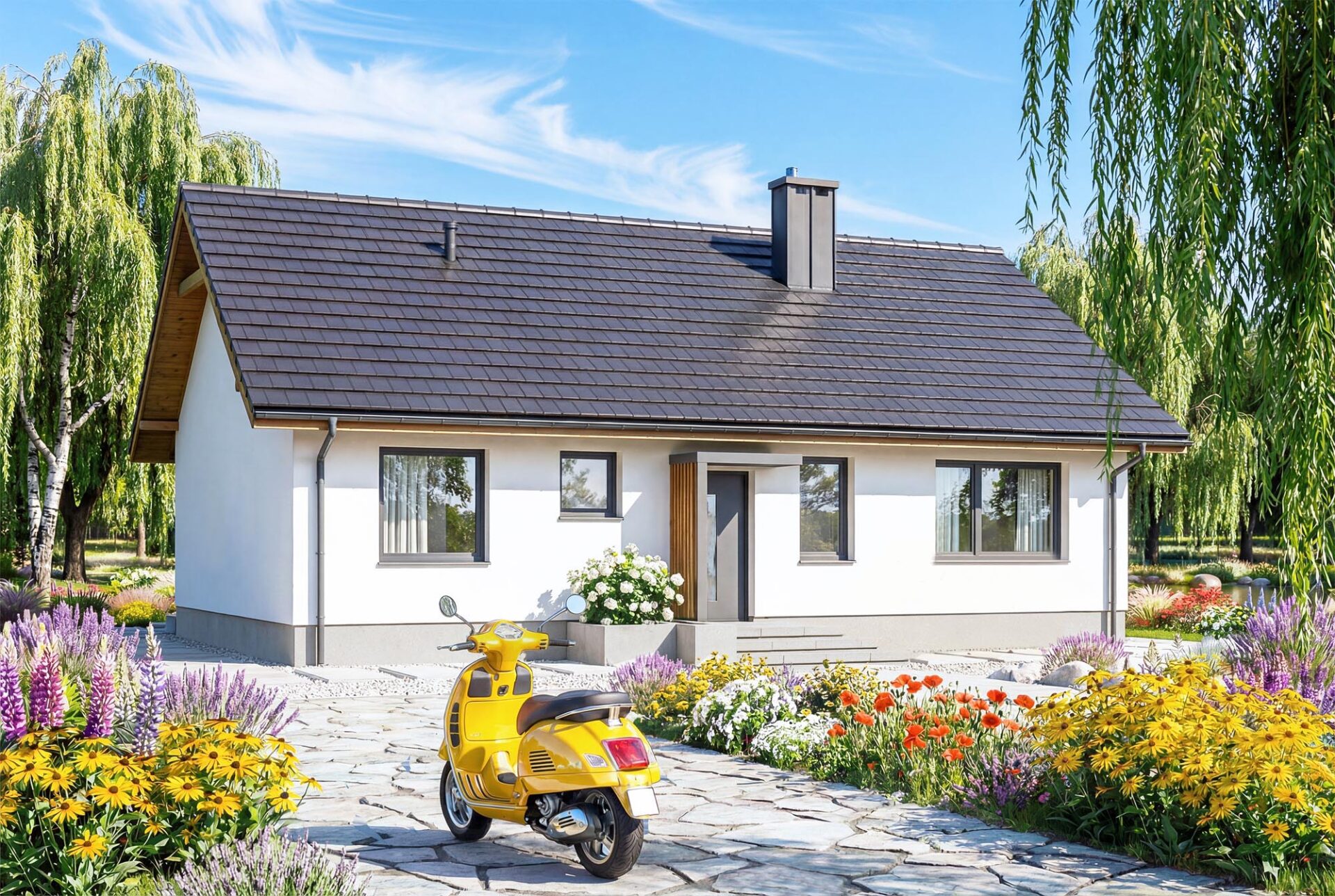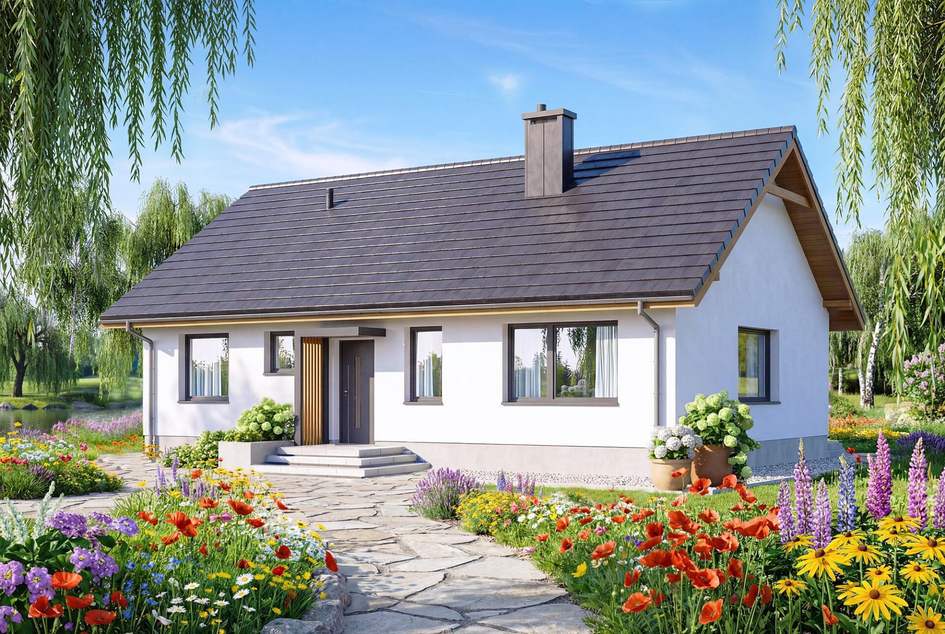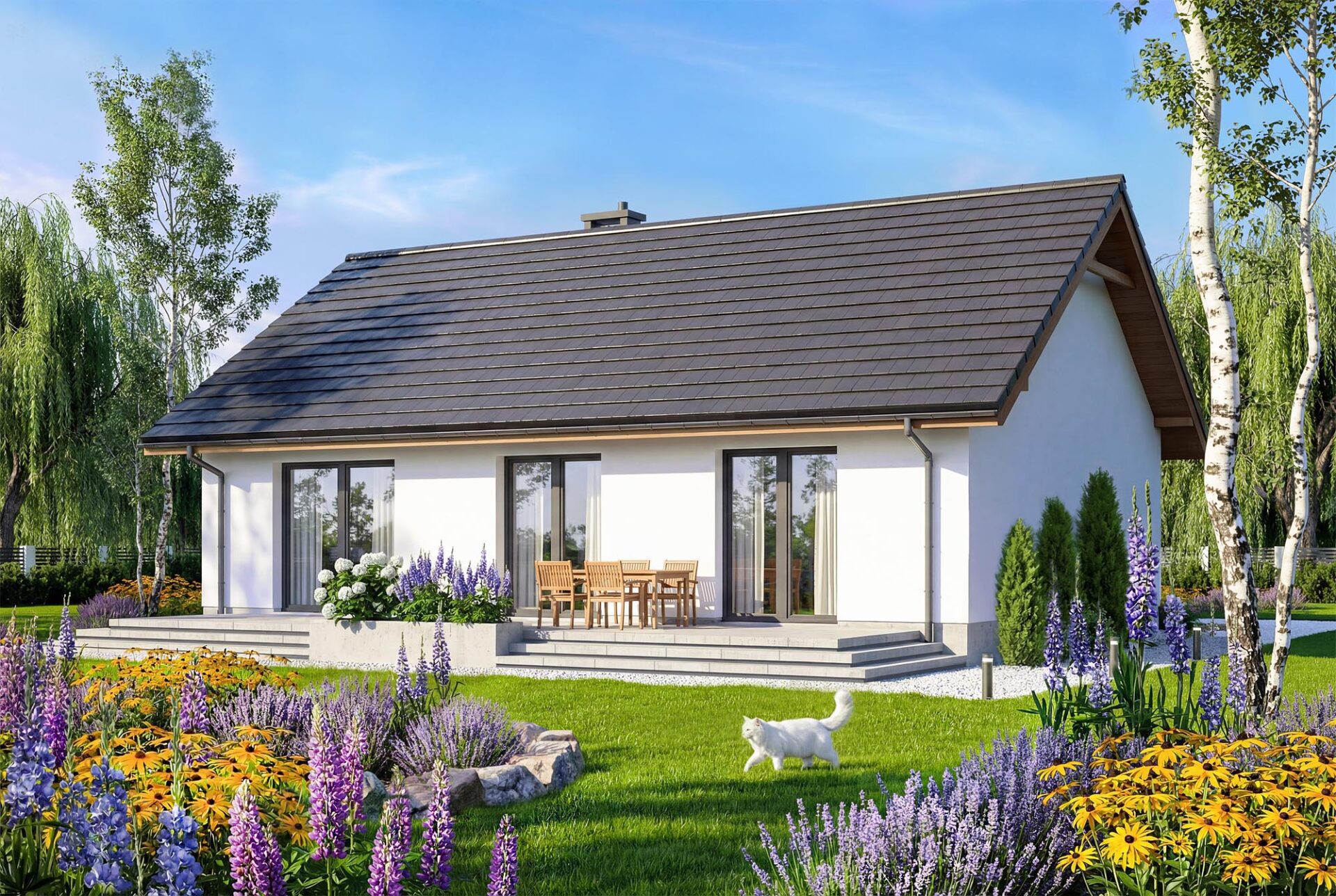 Bambino to projekt komfortowego i przytulnego domu jednorodzinnego z przemyślanym układem funkcjonalnym, utrzymanego w tradycyjnej formie. Jasna, subtelna kolorystyka tynków nadaje bryle lekkości i świeżości, jednocześnie doskonale wpisując się w każde otoczenie. Prosta, czysta linia elewacji sprawia, że budynek prezentuje się elegancko i nowocześnie, a jednocześnie jest niezwykle uniwersalny – łatwy do personalizacji według indywidualnych gustów przyszłych mieszkańców. Sercem domu jest przestronny salon połączony z jadalnią i aneksem kuchennym, który dzięki dużym przeszkleniom naturalnie łączy się z ogrodem, optycznie powiększając przestrzeń wypoczynkową. W projekcie znajdują się trzy ustawne sypialnie oraz funkcjonalna łazienka, co zapewnia pełną intymność każdemu z członków rodziny. Aby można było wykorzystać poddasze, w korytarzu zaprojektowano otwór w stropie na schody spuszczane. Kotłownie funkcjonalnie oddzielono od części mieszkalnej poprzez wiatrołap. Zaprojektowano w niej ogrzewanie na paliwo stałe, oraz instalację gazową co ułatwi na etapie adaptacji zmianę źródła ogrzewania na gazowe. Prosta bryła i nieskomplikowana konstrukcja ułatwiają i przyspieszają budowę, a zastosowane rozwiązania energooszczędne pozwalają obniżyć koszty eksploatacji, bez zwiększania kosztów realizacji. To projekt, który nie tylko świetnie wygląda – ale również doskonale się w nim mieszka.