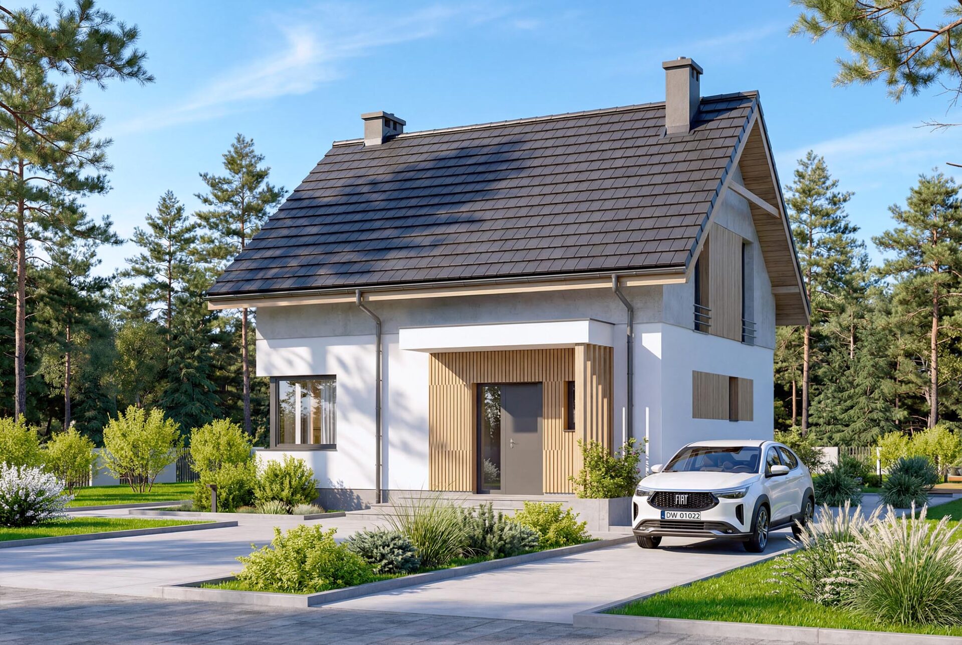 Chili to mały, nowoczesny domek. Prosta forma w połączeniu z efektownym wejściem i ciekawie zakomponowanymi materiałami na elewacji , sprawiają że dom wygląda bardzo atrakcyjnie.