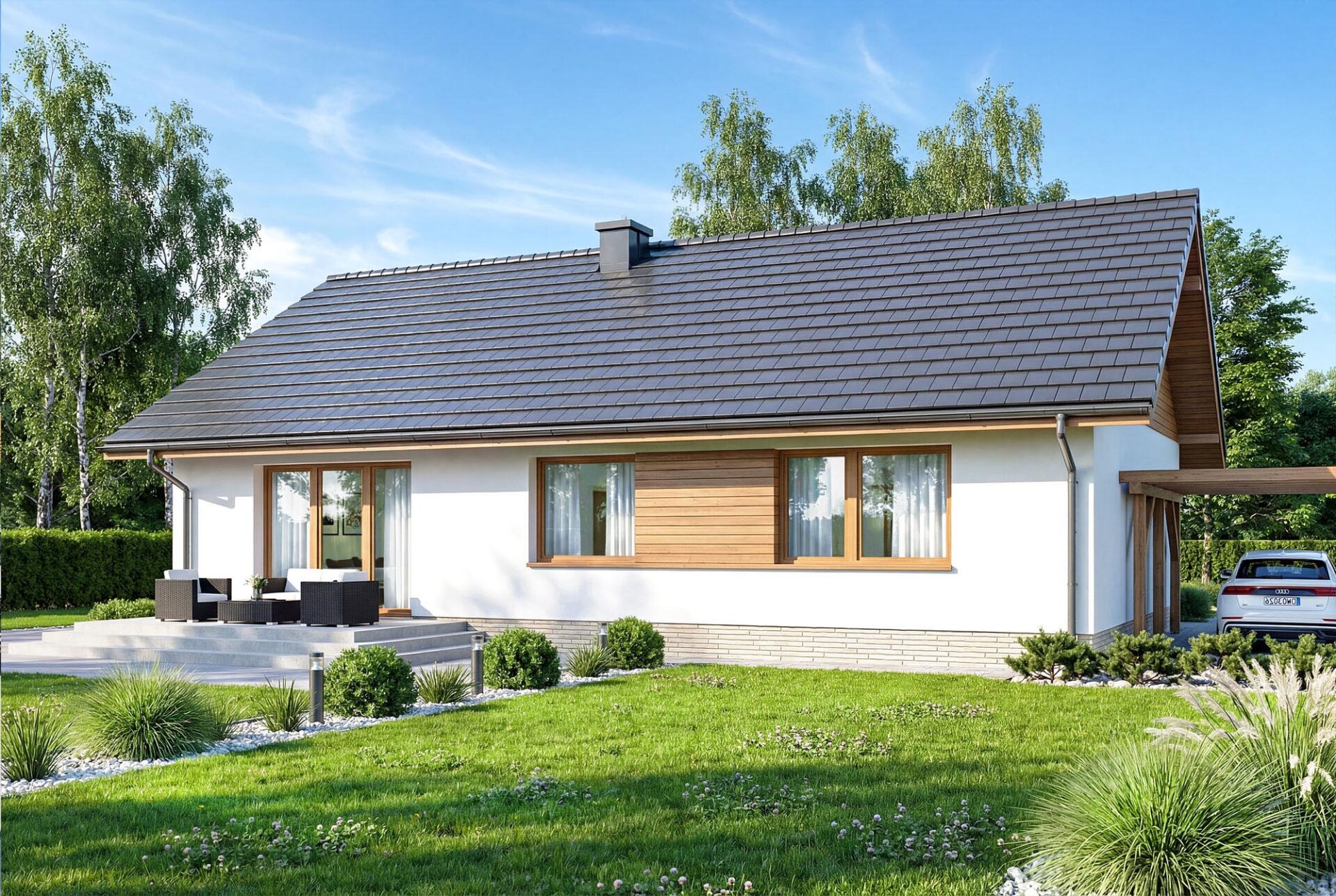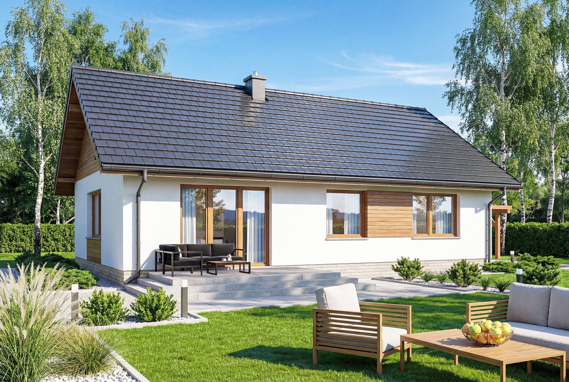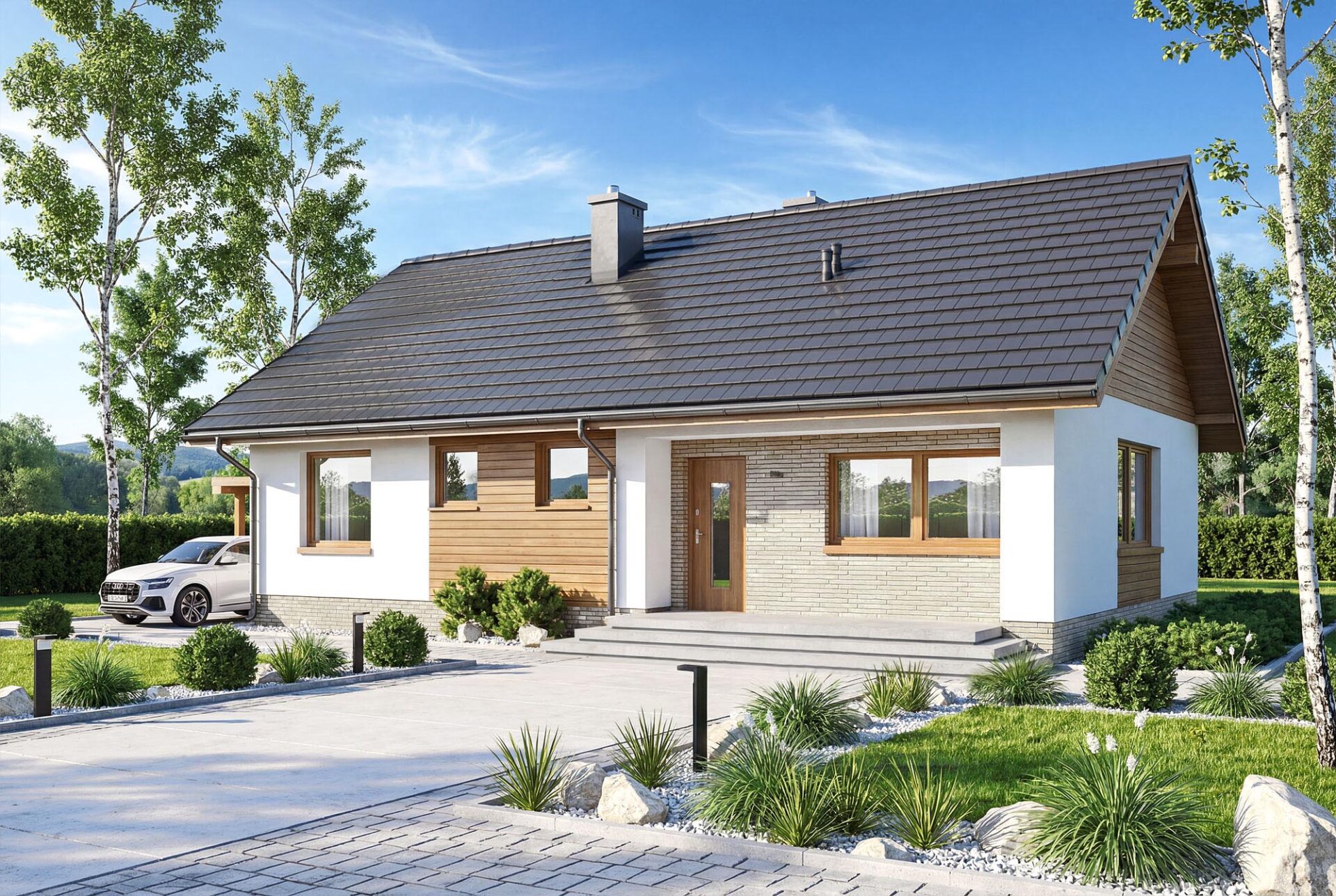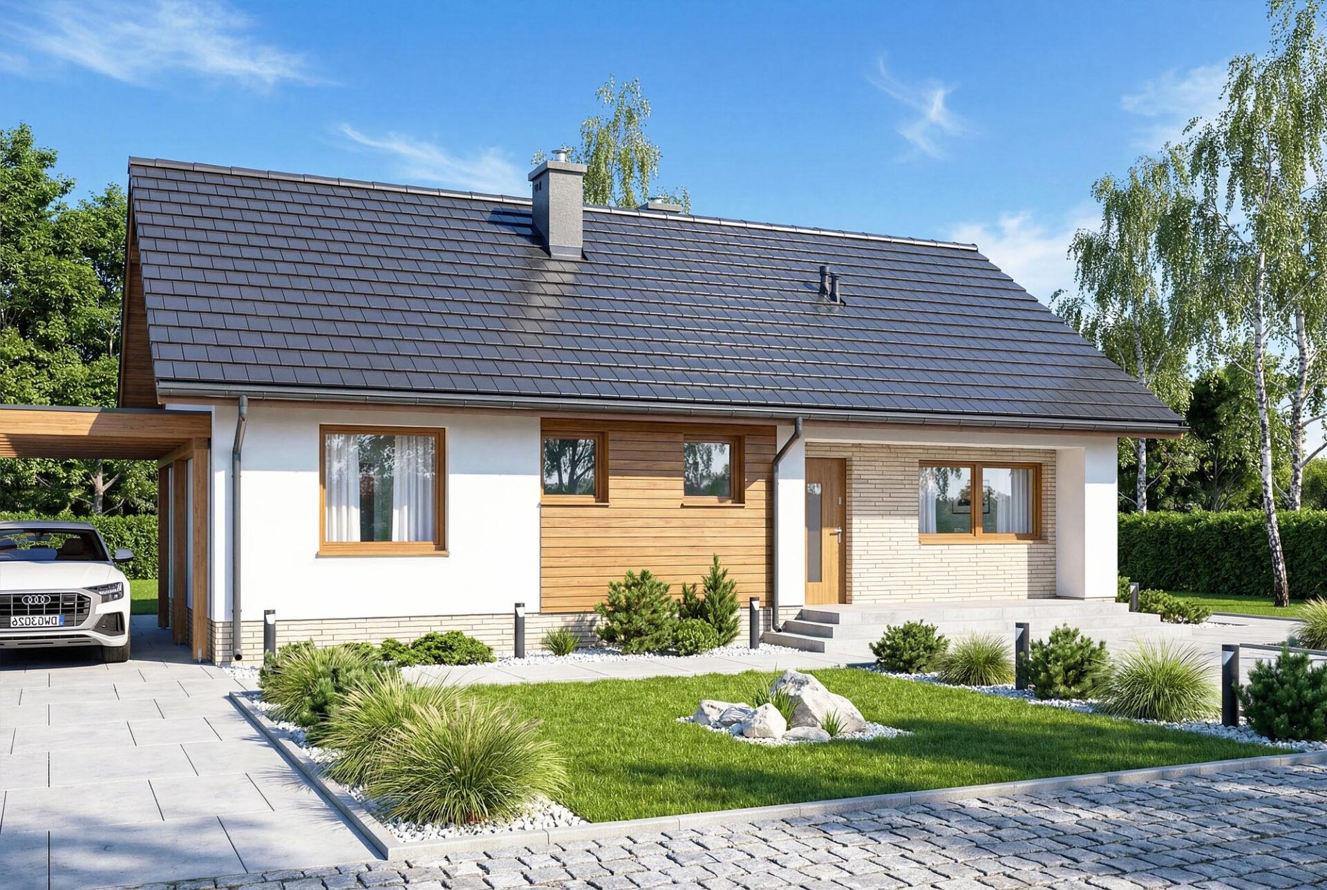 Doppio to projekt małego domu parterowego. Klasyczna forma i naturalne materiały, nadają mu ciepłego i przytulnego charakteru. Spokojne linie, oraz ciekawie zaprojektowana elewacja, sprawiają, że dom zwraca na siebie uwagę dyskretną elegancją i świetnie wpisuje się w otoczenie.