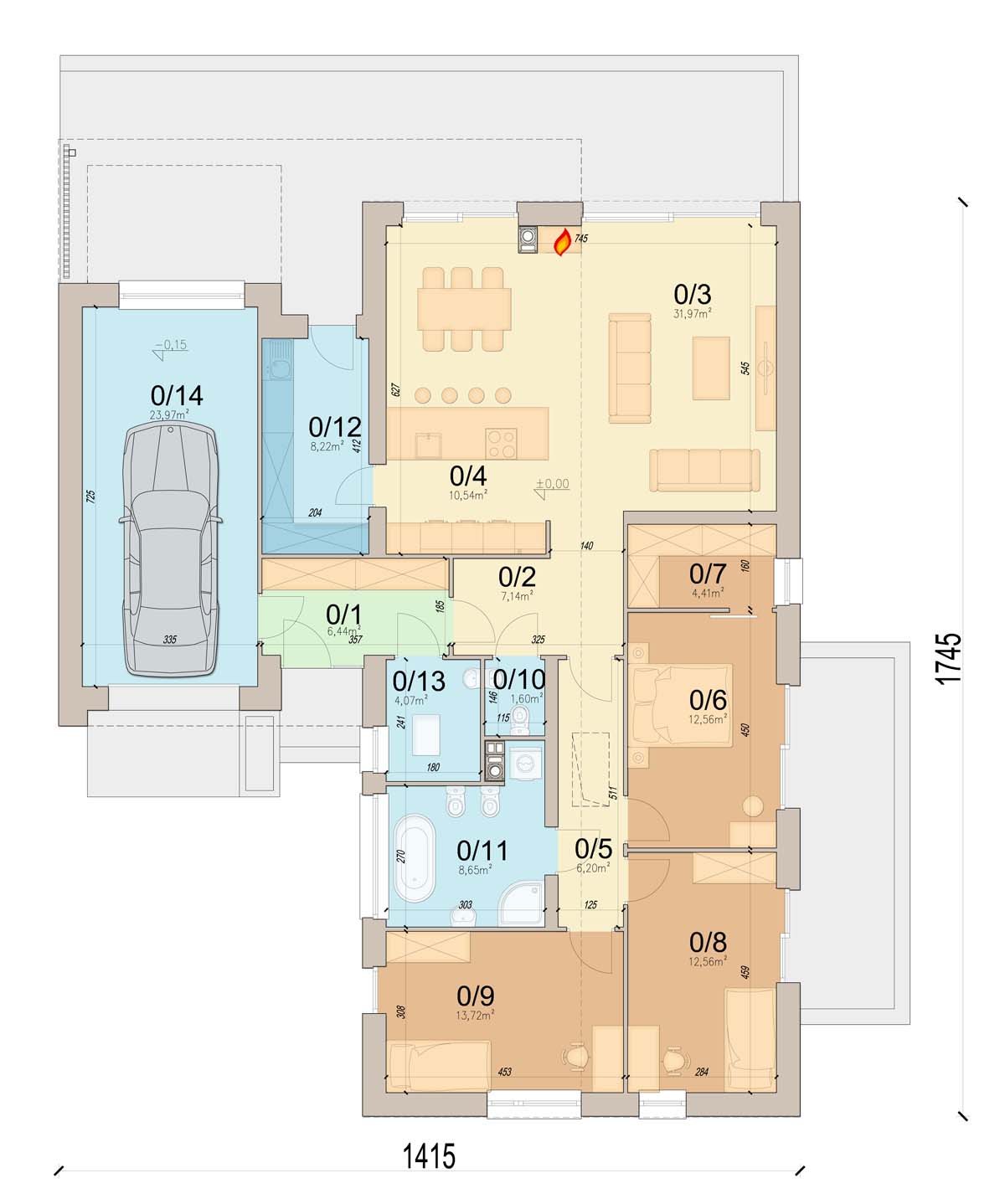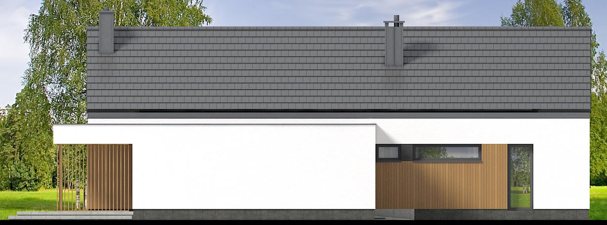 garaż oddzielony jest od części mieszkalnej wiatrołapem. Dodatkowe pomieszczenie ze zlewozmywakiem jest świetnym rozwiązaniem w organizacji przestrzeni domu. Wyjście na ogród oraz połączenie z kuchnią sprawia że idealnie sprawdzi się jako pomieszczenie gospodarcze oraz spiżarnia. W kotłowni zaprojektowano ogrzewanie na paliwo stałe, oraz instalację gazową co ułatwi na etapie adaptacji zmianę źródła ogrzewania na gazowe.
