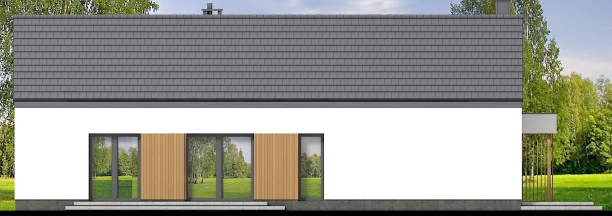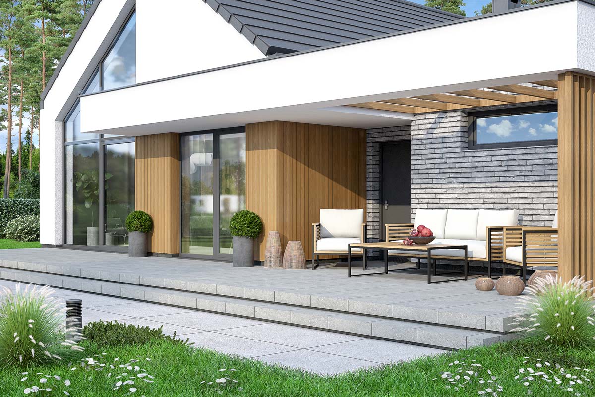 Budynek przyciąga wzrok swoją prostą, lecz elegancką formą. Kompozycja jasnego tynku, drewnianych okładzin i kamiennych detali nadaje mu wyjątkowy styl. Imponujące, wysokie przeszklenie od strony ogrodu wpuszcza mnóstwo naturalnego światła, tworząc niezwykle otwartą przestrzeń. Przydomowa strefa relaksu na świeżym powietrzu doskonale nadaje się do wypoczynku, rodzinnych obiadów czy spotkań towarzyskich.