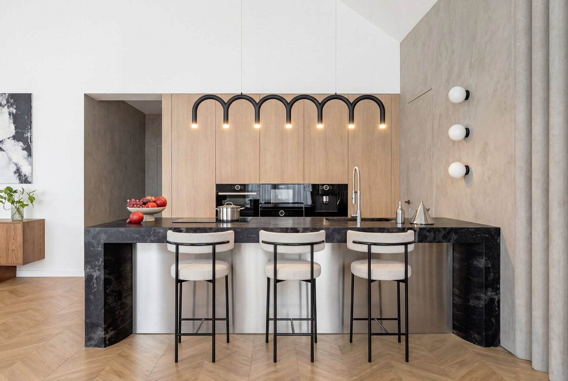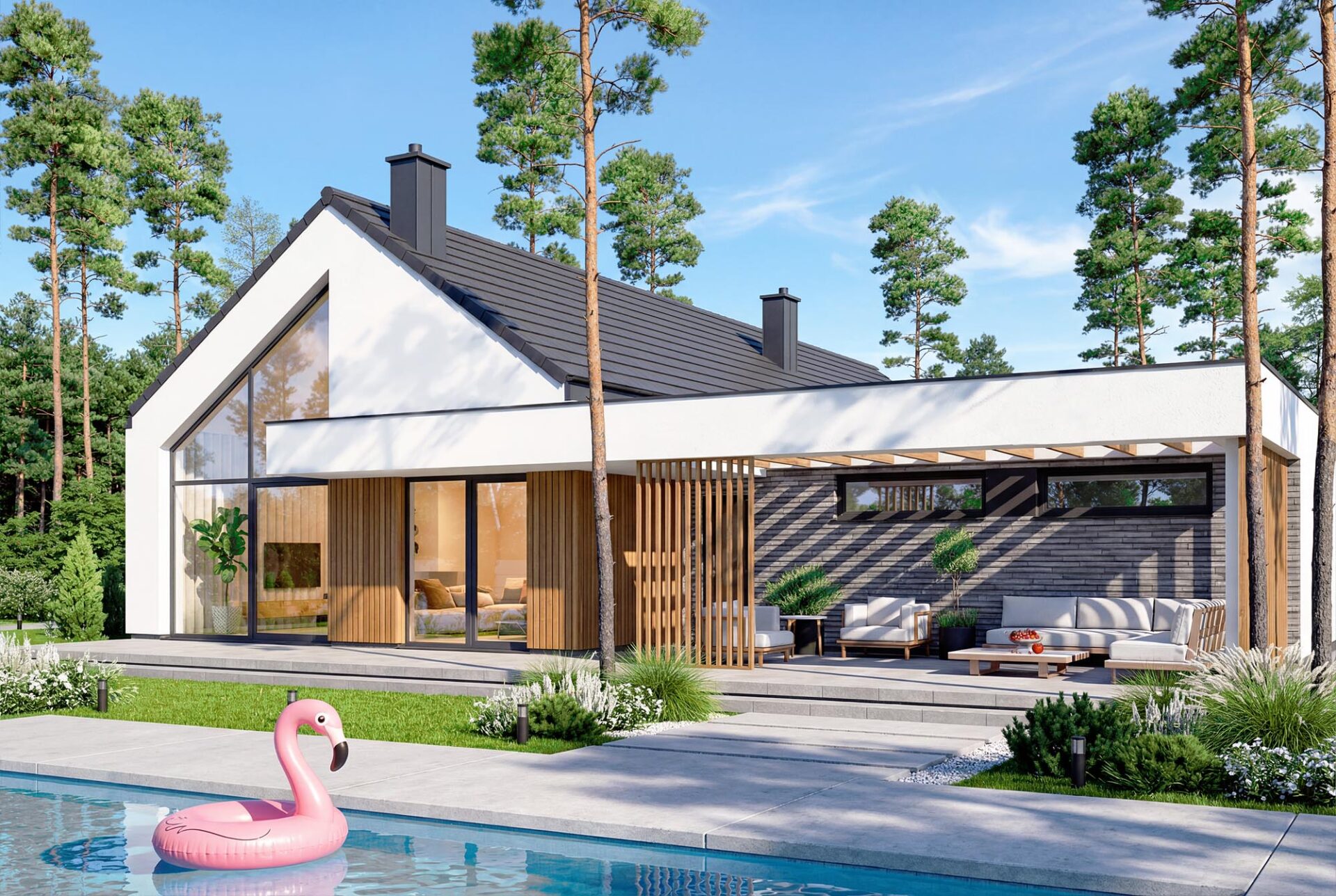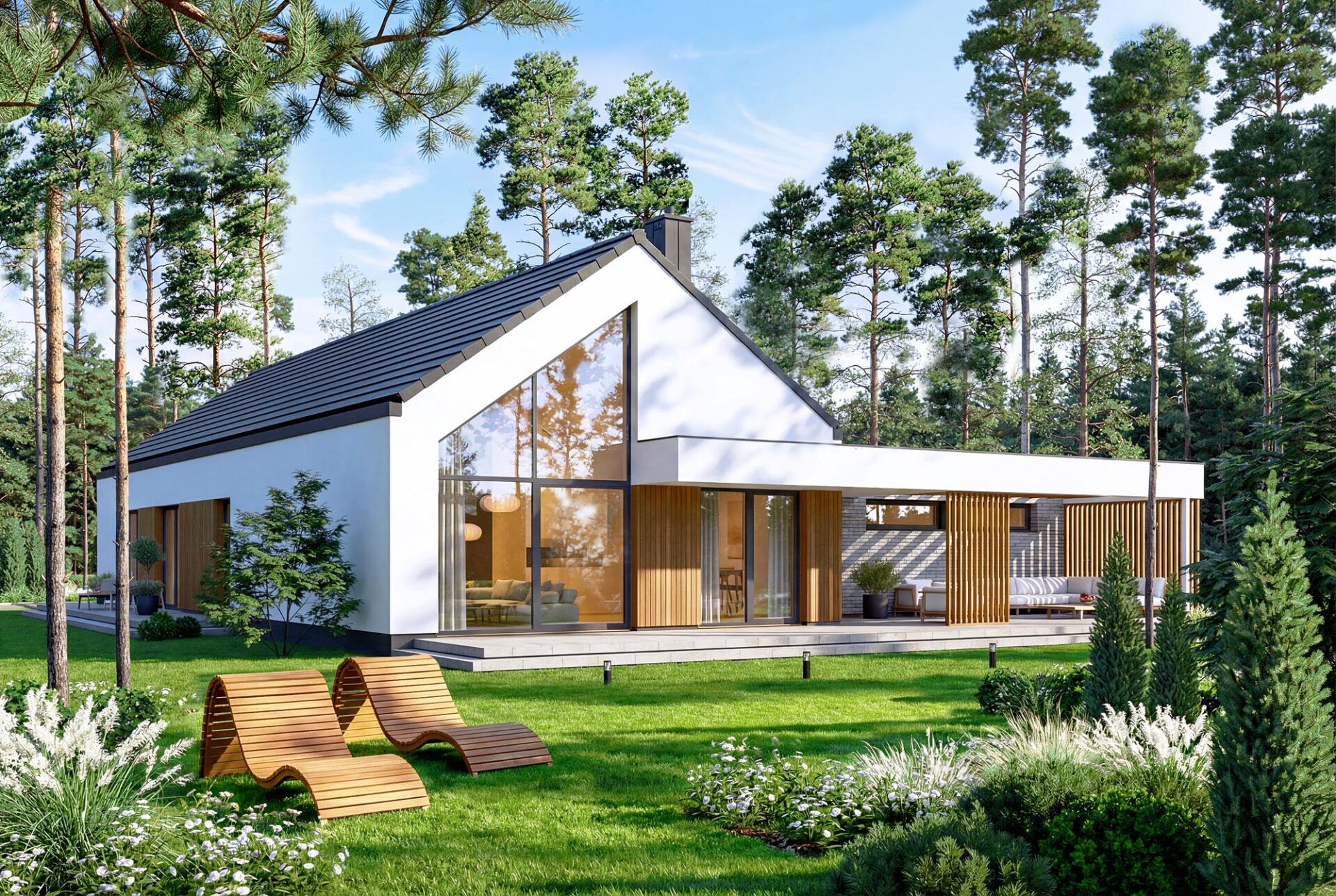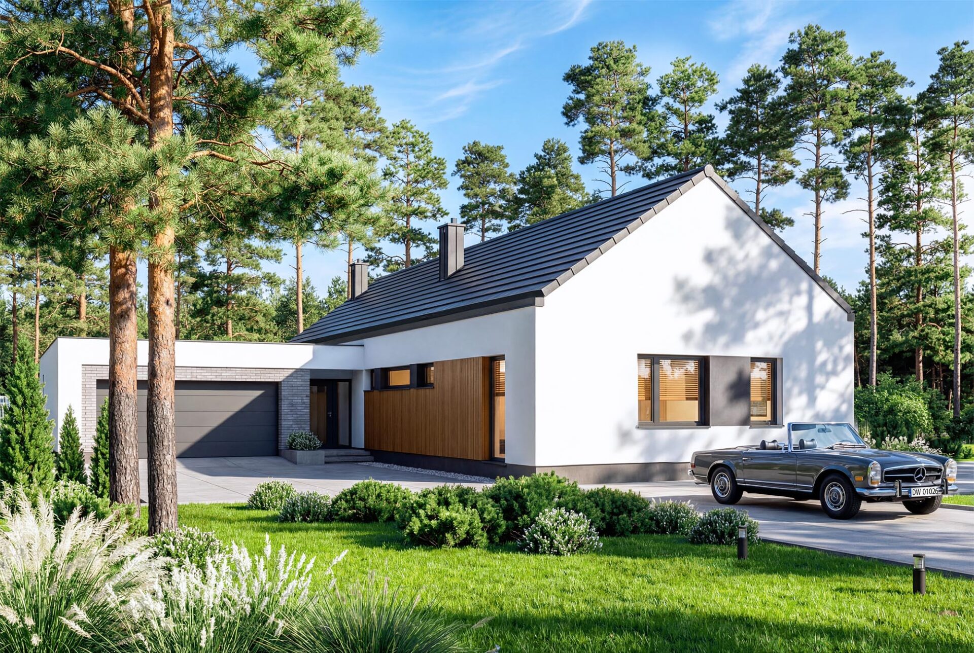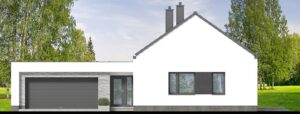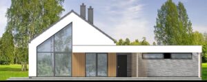 Gustav 3 plus to propozycja dla osób, które szukają balansu między klasyczną estetyką a nowoczesną funkcjonalnością. Minimalistyczna bryła garażu w połączeniu z tradycyjną formą domu tworzy ponadczasową całość, którą podkreśla szlachetna elewacja z jasnego tynku, drewna i kamienia. Wnętrze zachwyca przestronnością. Salon połączony z jadalnią to imponująca, wysoka przestrzeń otwarta aż po połacie dachu. Dzięki spektakularnym przeszkleniom od strony ogrodu granica między wnętrzem a naturą zaciera się, a dom wypełnia naturalne światło. To idealne miejsce na rodzinne obiady i wieczorny relaks. Projekt oferuje cztery komfortowe pokoje, w tym wyjątkową sypialnię główną z własną garderobą i łazienką. Układ uzupełniają dwie ogólnodostępne łazienki, co gwarantuje wygodę wszystkim domownikom. Dwustanowiskowy garaż z bezpośrednim przejściem do domu oraz dodatkowe pomieszczenie gospodarcze ze zlewem ułatwiają codzienną organizację. Dom posiada kotłownię w której zaprojektowano ogrzewanie na paliwo stałe, oraz instalację gazową co ułatwi na etapie adaptacji zmianę źródła ogrzewania na gazowe. Zastosowane w projekcie rozwiązania energooszczędne – na poziomie ekonomicznie uzasadnionym, zapewnią niskie koszty eksploatacji i nie zwiększą kosztów budowy. Gustav 3 plus to perfekcyjne połączenie tradycji z nowoczesnością – idealny wybór dla osób poszukujących wyjątkowego, przemyślanego projektu domu.