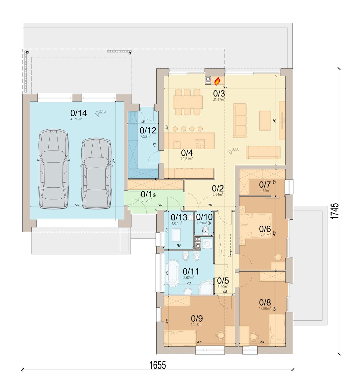 garaż oddzielony jest od części mieszkalnej wiatrołapem. Dodatkowe pomieszczenie ze zlewozmywakiem jest świetnym rozwiązaniem w organizacji przestrzeni domu. Wyjście na ogród oraz połączenie z kuchnią sprawia że idealnie sprawdzi się jako pomieszczenie gospodarcze ,oraz spiżarnia. W kotłowni zaprojektowano ogrzewanie na paliwo stałe, oraz instalację gazową co ułatwi na etapie adaptacji zmianę źródła ogrzewania na gazowe.