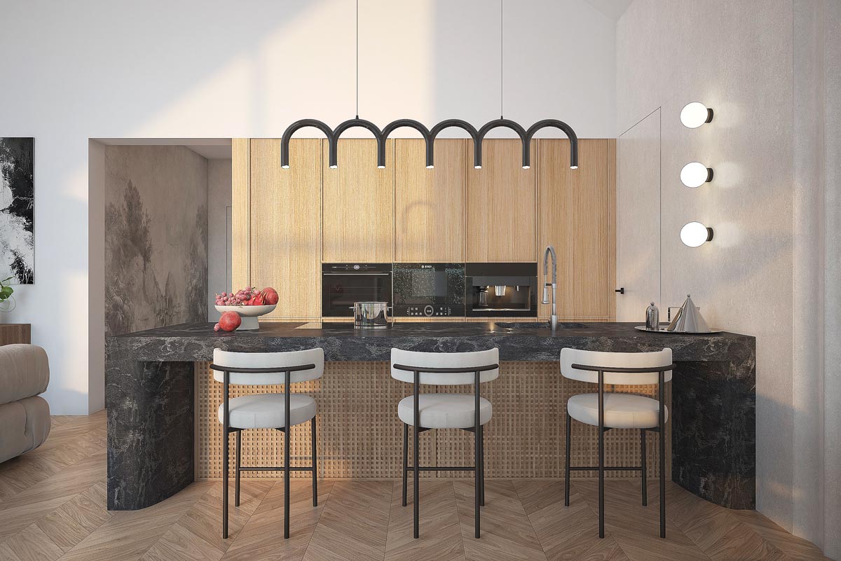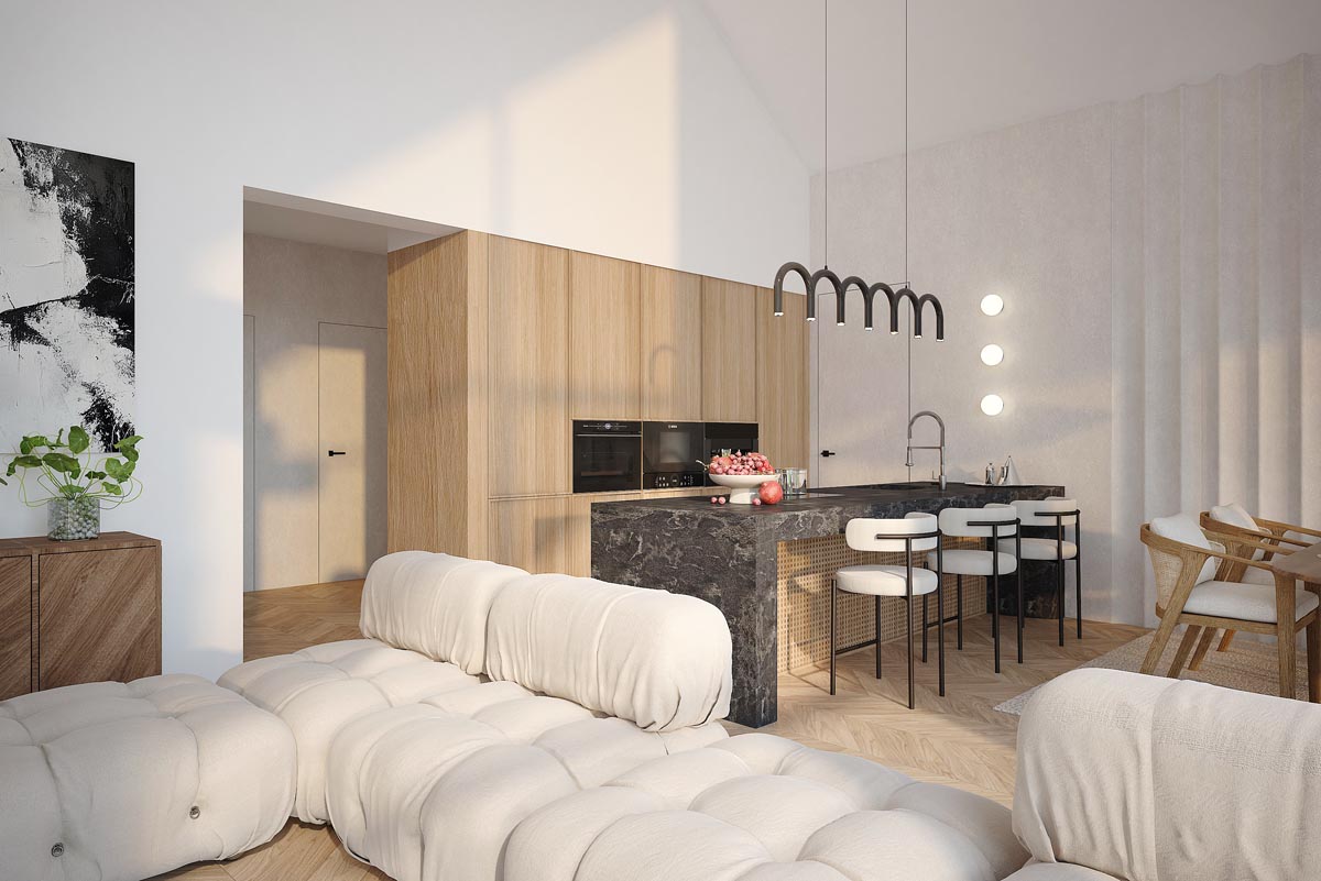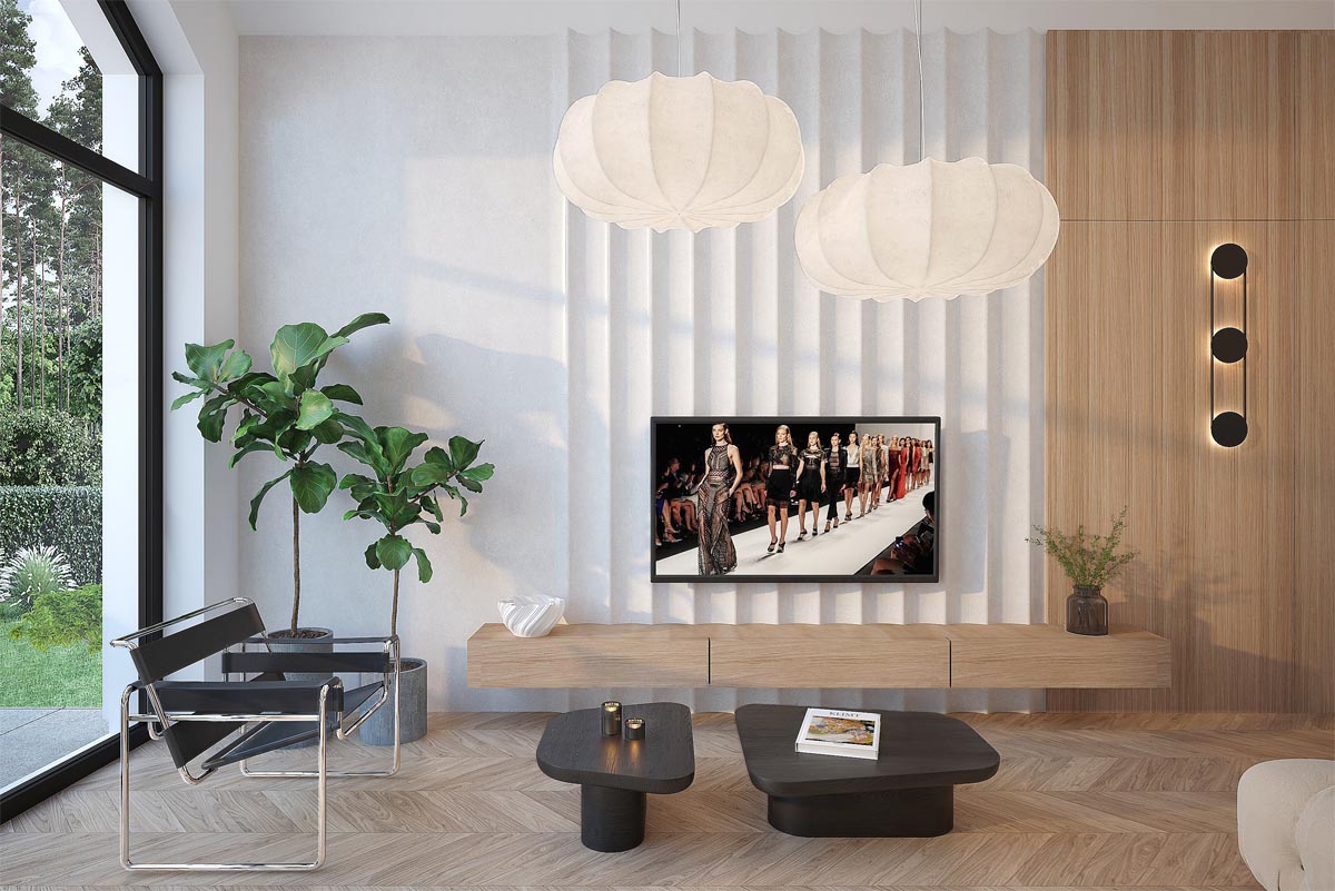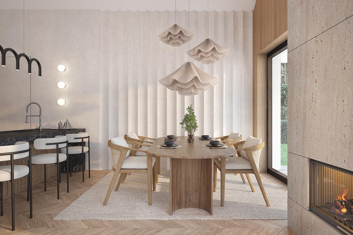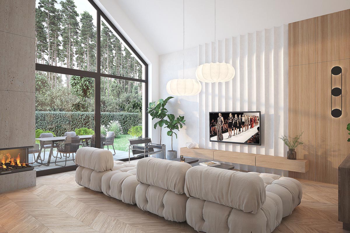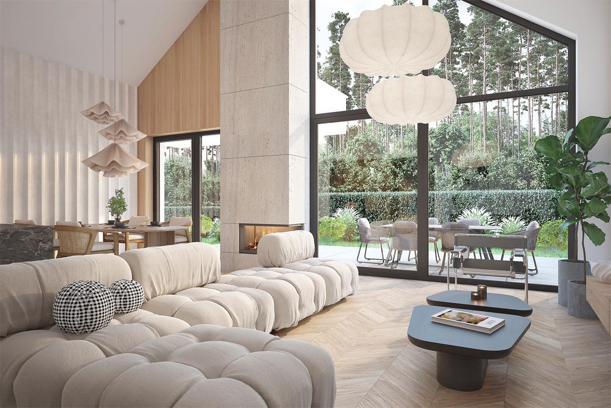 Budynek przyciąga wzrok swoją prostą i elegancką formą. Kompozycja jasnego tynku, drewnianych okładzin i kamiennych detali nadaje mu wyjątkowy styl. Imponujące, wysokie przeszklenie od strony ogrodu wpuszcza mnóstwo naturalnego światła, tworząc niezwykle otwartą przestrzeń. Przydomowa strefa relaksu na świeżym powietrzu doskonale nadaje się do wypoczynku, rodzinnych obiadów czy spotkań towarzyskich.