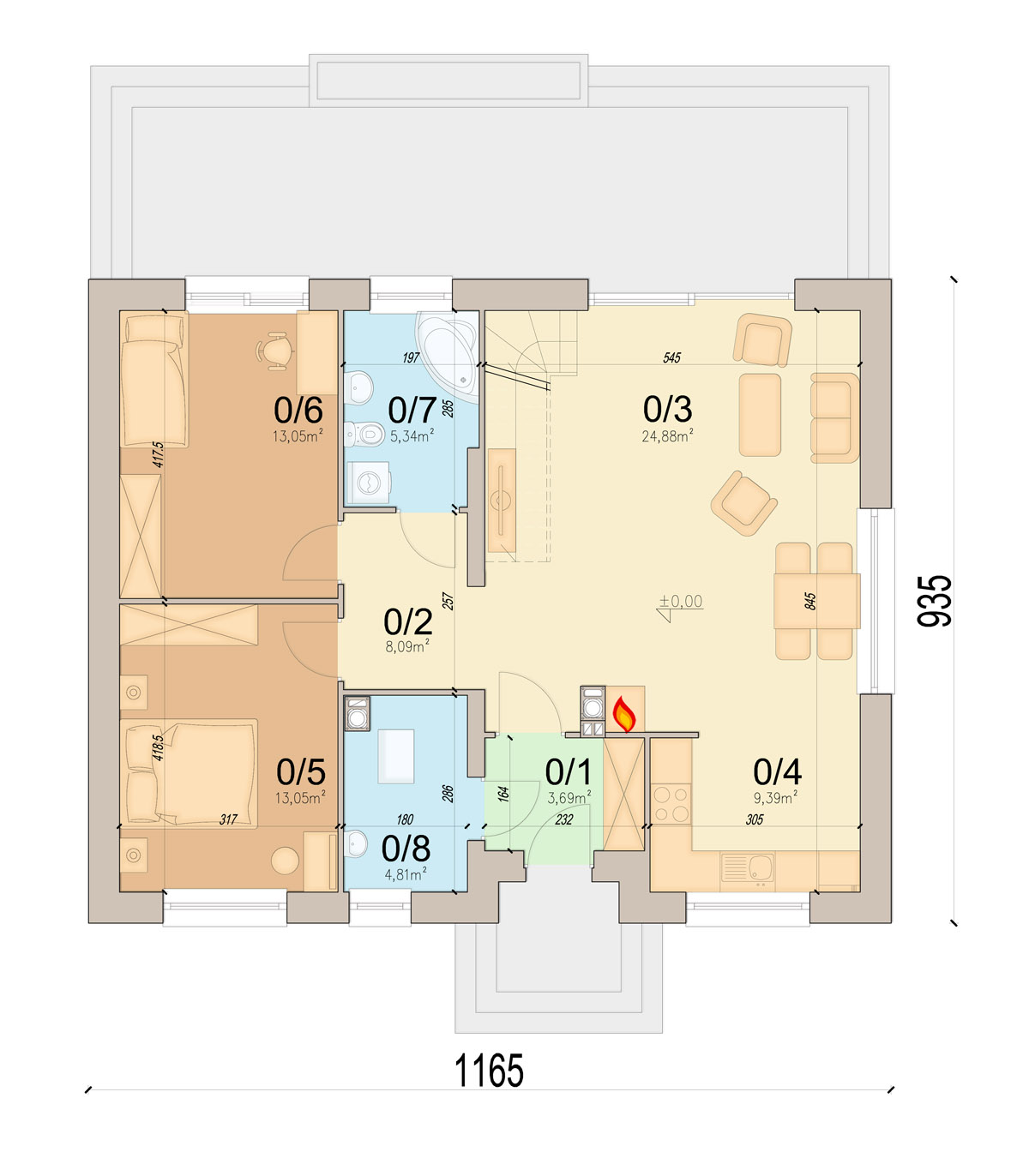 W projekcie przewidziano kotłownie na paliwo stałe , która, co ważne, oddzielona jest od części mieszkalnej wiatrołapem.