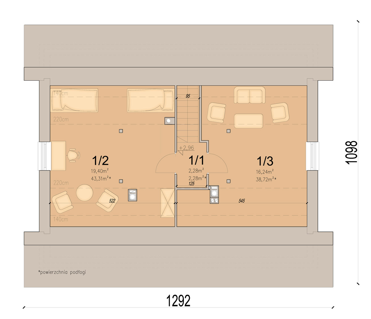 Dom został zaprojektowany w taki sposób, aby bez większych zmian i nakładów, można było wydzielić na poddaszu dodatkowe pokoje, oraz łazienkę.