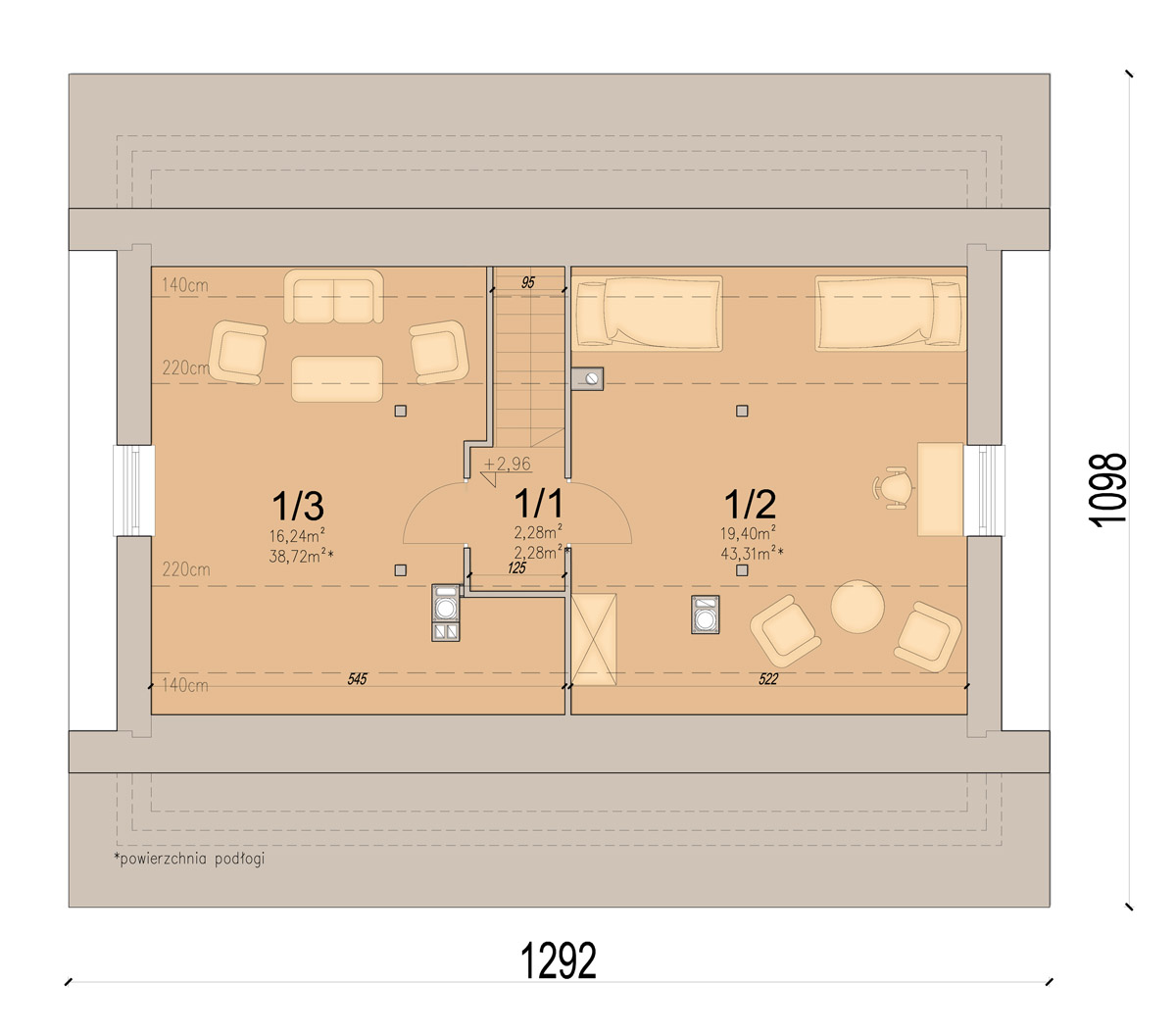 Dom został zaprojektowany w taki sposób, aby bez większych zmian i nakładów, można było wydzielić na poddaszu dodatkowe pokoje, oraz łazienkę.