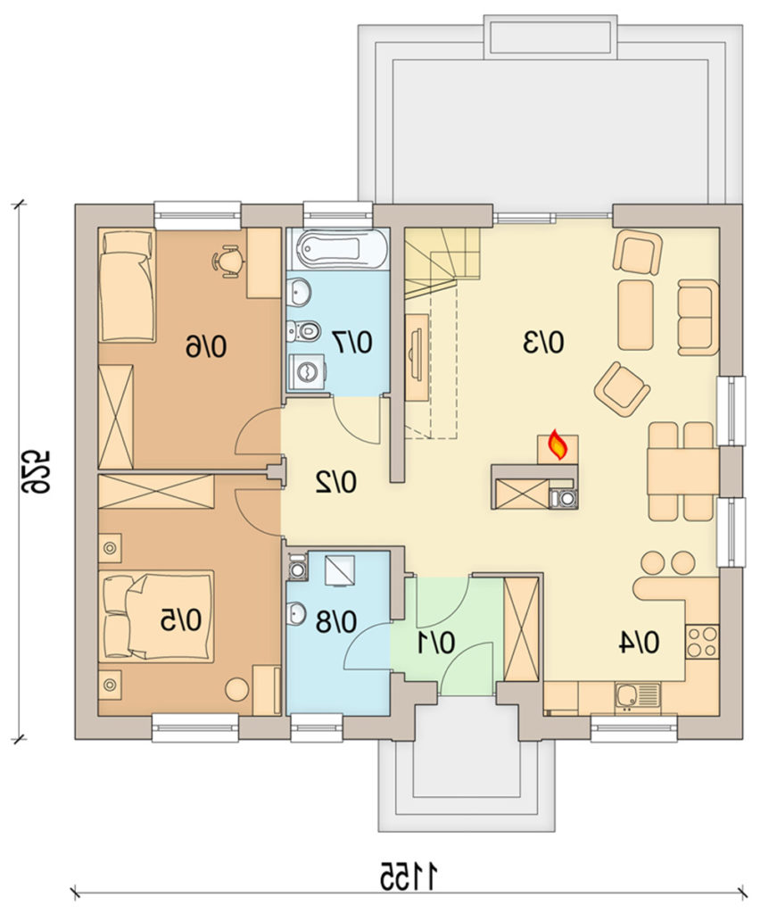 W centrum domowego ogniska zaprojektowano kominek. Jego zabudowa wydziela w części parteru hol, salon z jadalnią, oraz kuchnię. Dodatkowo na parterze zaprojektowano dwa duże pokoje, łazienkę, oraz kotłownię dostępną z wiatrołapu.
