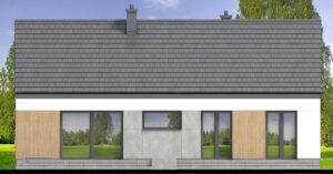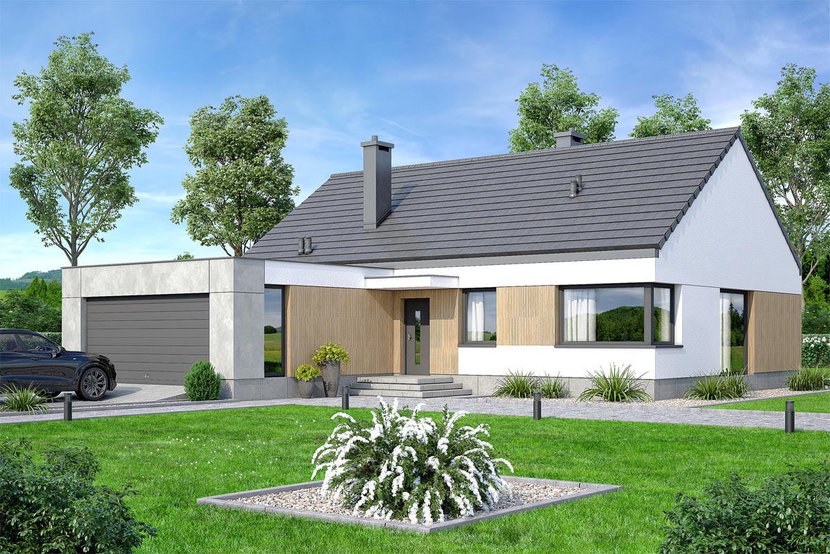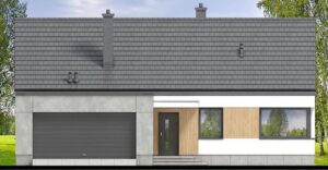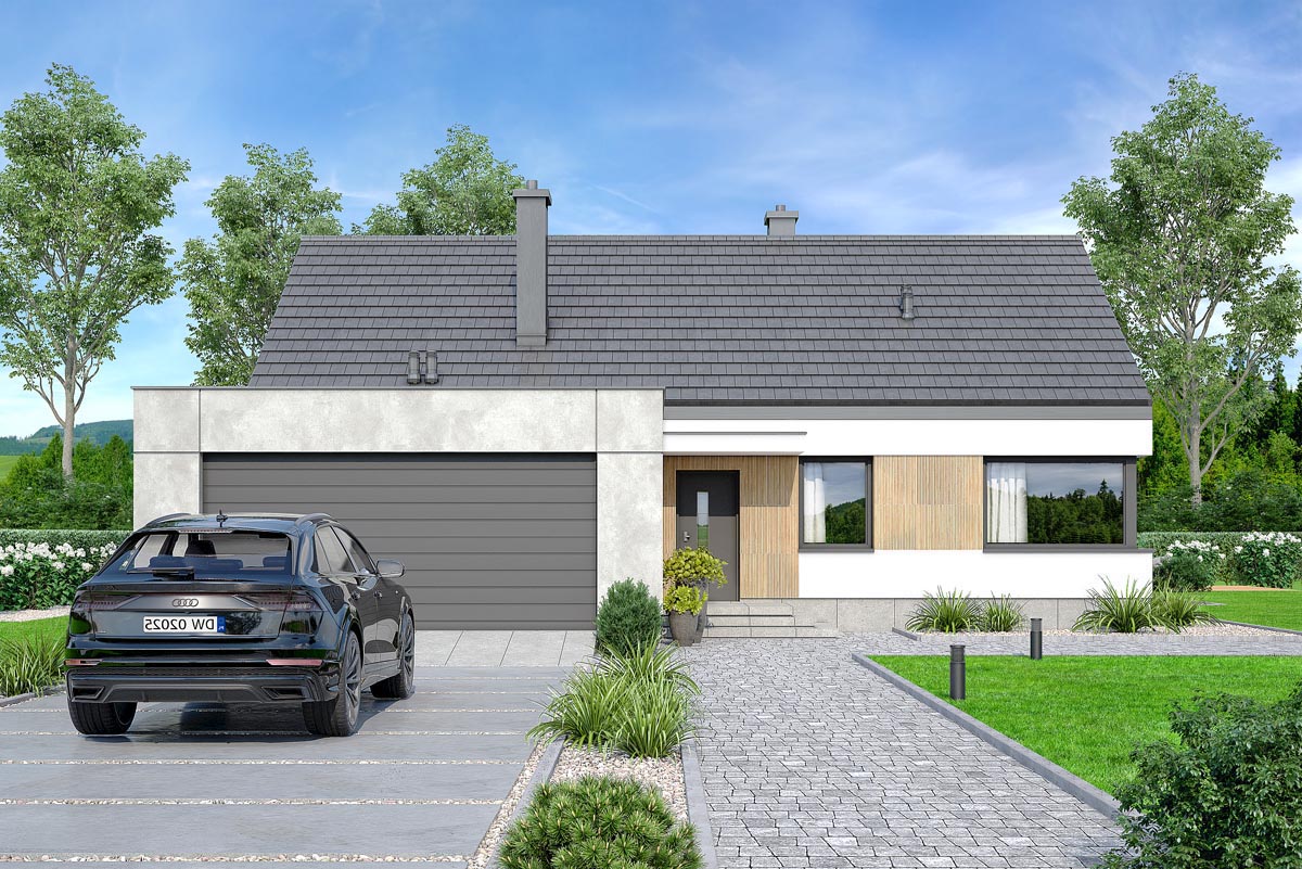 Współczesny wygląd i nowoczesna forma sprawiają, że świetnie wpisuje się w każde otoczenie. Uwagę zwraca ciekawie zaprojektowana elewacja. Subtelne połączenie materiałów betonu, kamienia i drewna, tworzy elegancki styl i niepowtarzalny charakter.