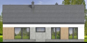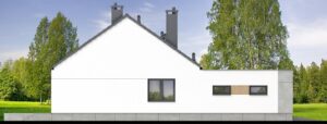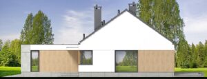 Jednym z głównych atutów projektu jest przestronny salon połączony z jadalnią, który otwiera się na ogród dzięki panoramicznemu oknu. Duża kuchnia z narożnym oknem zapewnia doskonałe doświetlenie i funkcjonalność. Dom oferuje trzy komfortowe sypialnie oraz dodatkowy gabinet – idealny jako domowe biuro lub pokój gościnny.