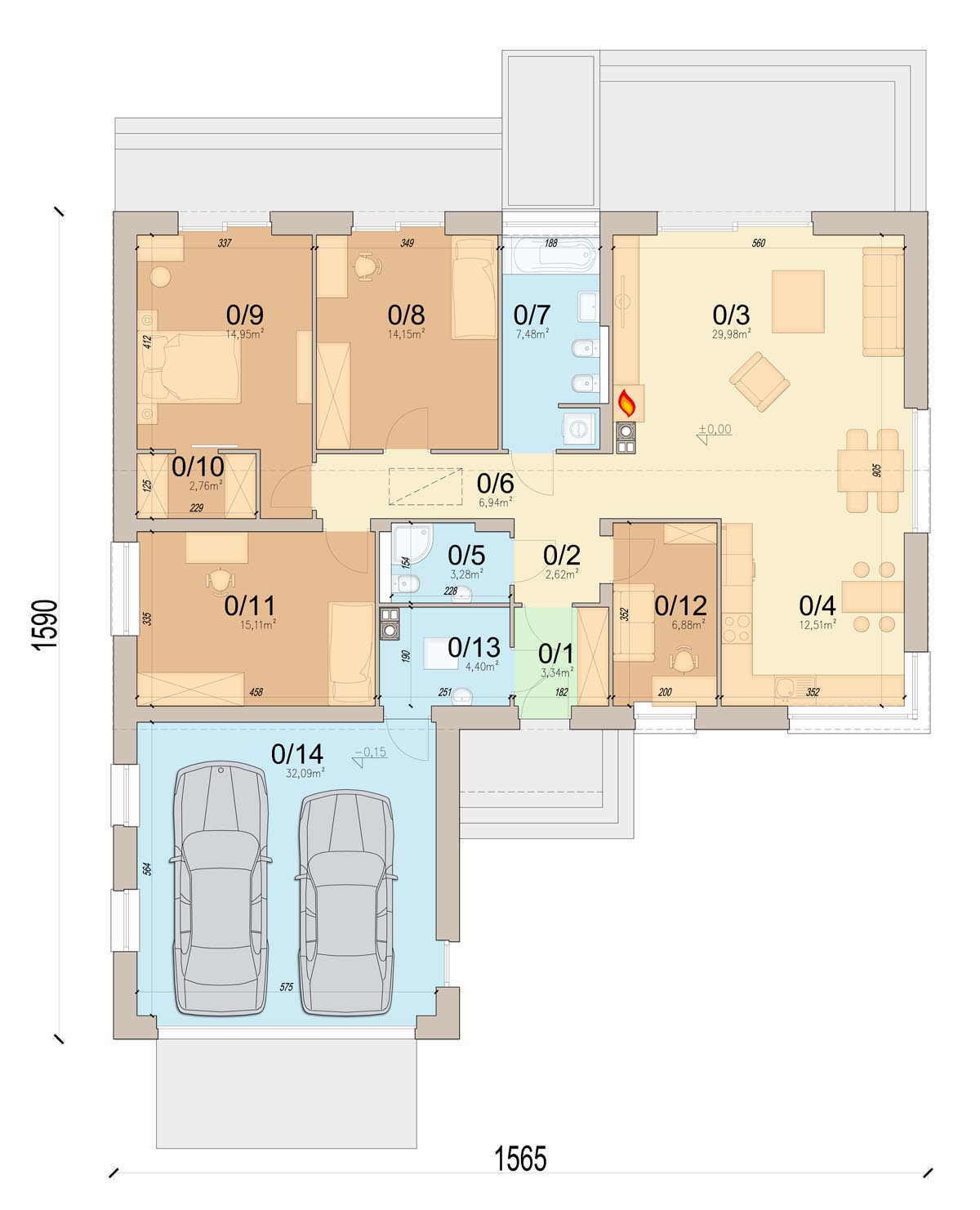 Strefa dzienna i nocna zostały wyraźnie oddzielone – sypialnie znajdują się za korytarzem, co zapewnia mieszkańcom prywatność i wygodę. Projekt przewiduje dwie łazienki: jedną z kabiną prysznicową, drugą z wanną. W głównej łazience przewidziano miejsce na pralkę i suszarkę w zabudowie. Dzięki takiemu rozwiązaniu pralka nie musi znajdować się w kotłowni, która w przypadku zastosowaniu kotła na paliwo stałe jest pomieszczeniem brudnym.