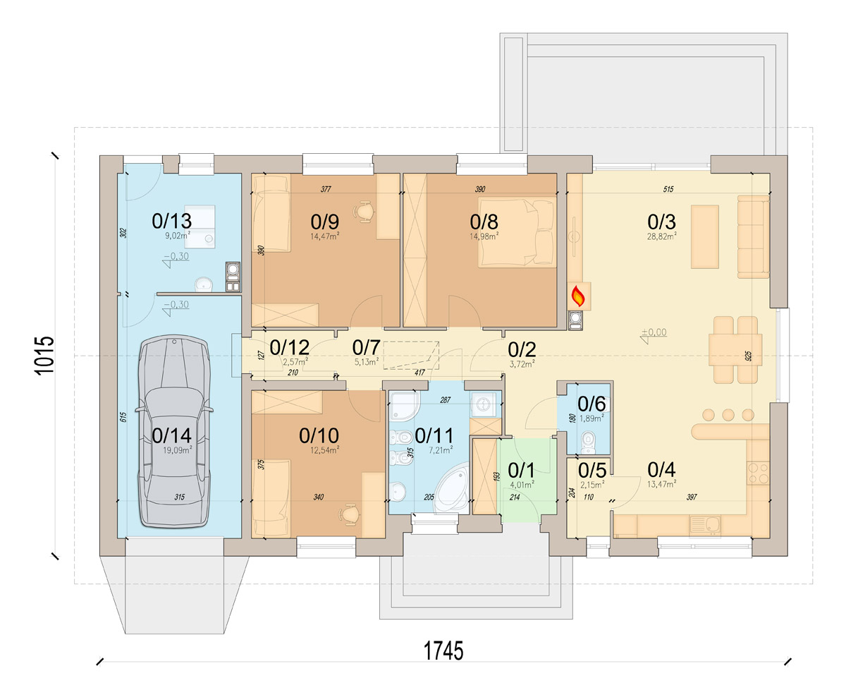 W projekcie przewidziano otwarty salon z jadalnią, oraz dużą kuchnię ze spiżarnią. Dom posiada wiatrołap z miejscem na szafę, oraz dodatkową toaletę. Na uwagę zasługuje również duża łazienka z wydzielonym miejscem na pralkę w zabudowie.