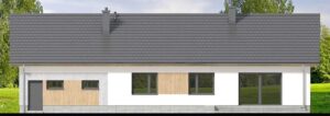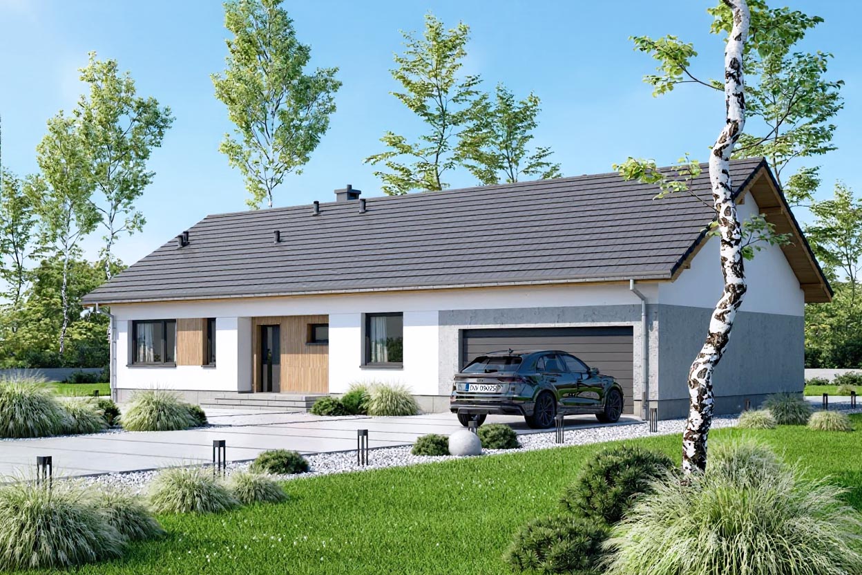 Mokka 20 plus 2 s2 to mały uroczy dom parterowy, który świetnie wpisuje się w każde otoczenie, a zarazem posiada swój oryginalny styl. Elewacje projektu zachwycają elegancką prostotą i subtelną nowoczesnością. Stonowana kolorystyka – biel elewacji połączona z ciepłym drewnem, betonowymi wstawkami oraz szarym dachem – nadaje bryle ponadczasowy charakter.