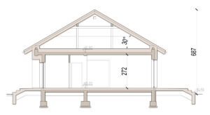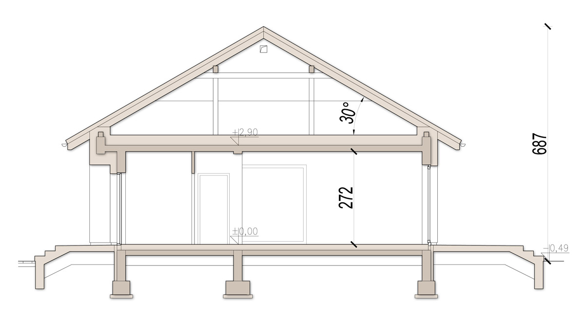 Fundamenty żelbetowe, ściany nośne i działowe z pustaków ceramicznych, strop żelbetowy, konstrukcja dachu drewniana, pokrycie dachu: blacha, dachówka ceramiczna lub betonowa