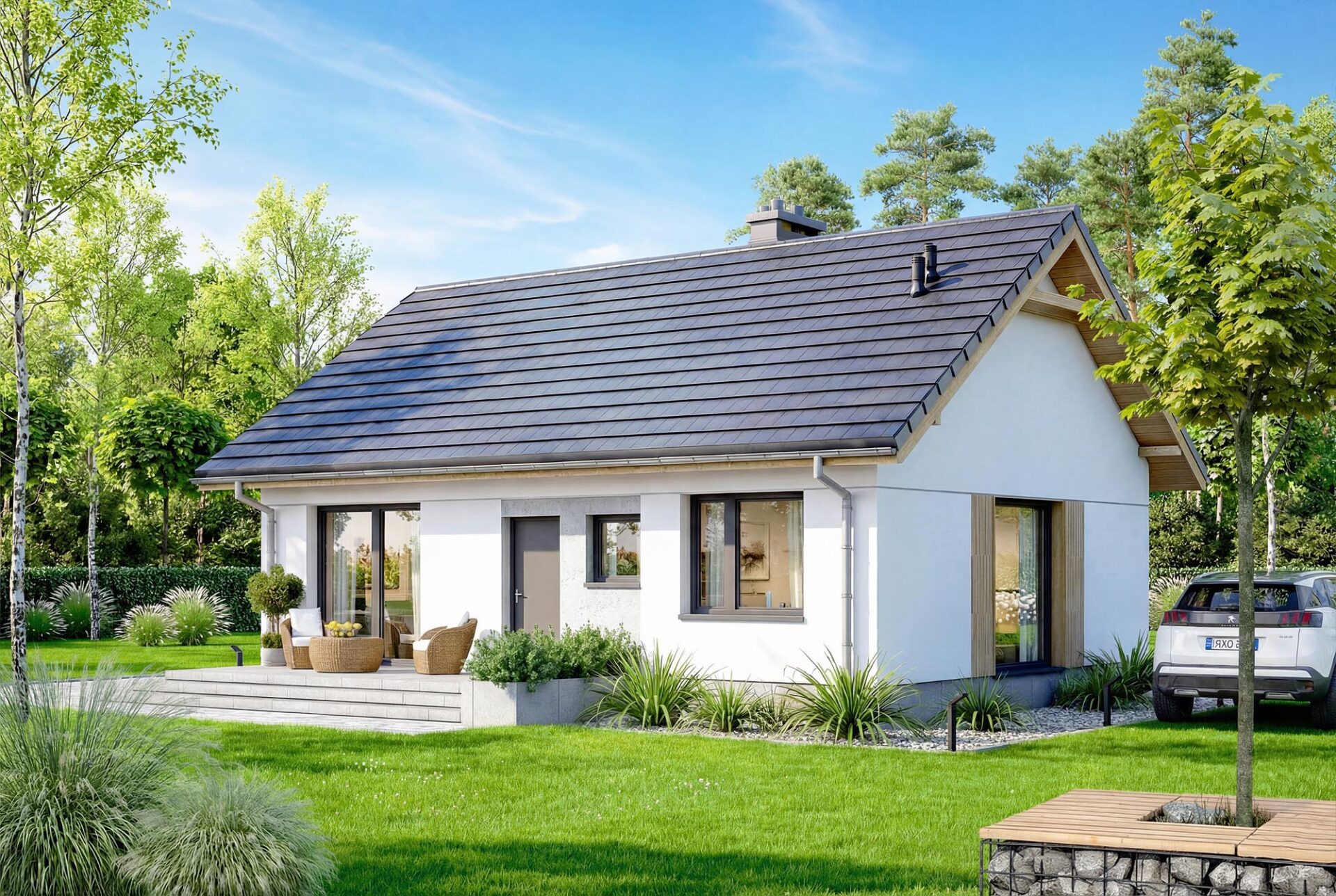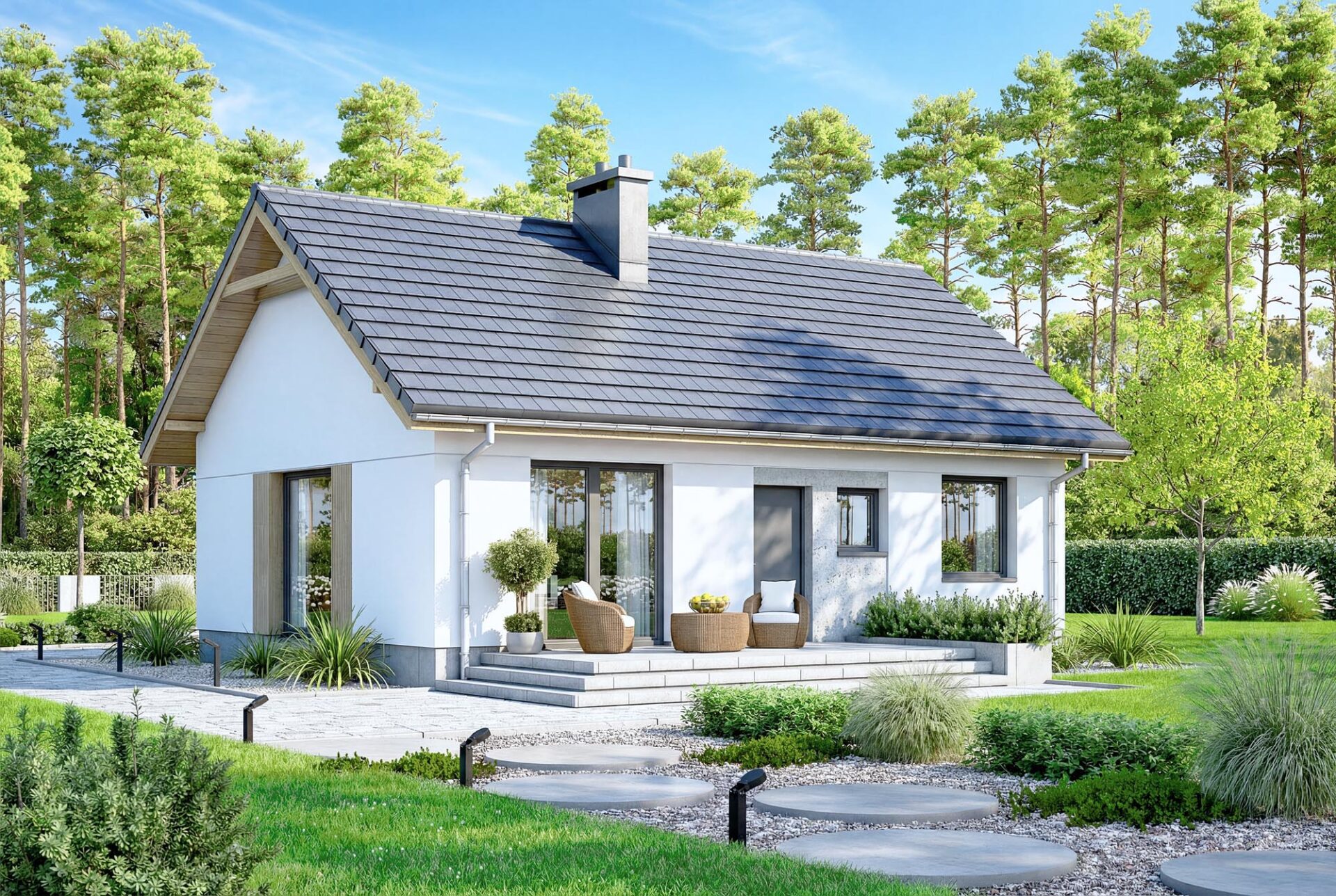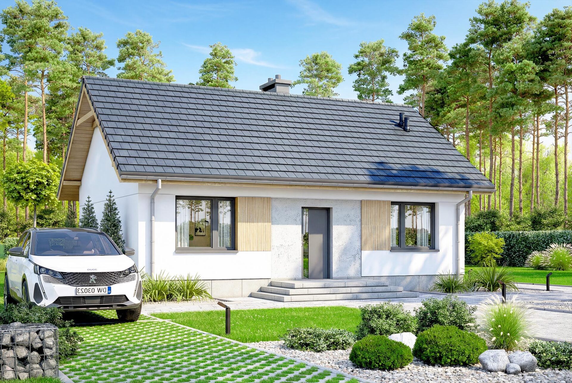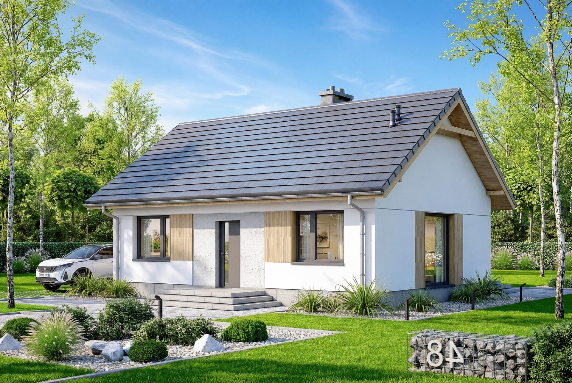 Nektarynka to projekt małego domu parterowego. Dzięki bardzo prostej formie jest tani i łatwy w budowie. Mimo niewielkich rozmiarów , dom posiada duży salon z miejscem na jadalnię , ustawną kuchnię, oraz dwa komfortowe pokoje. W wiatrołapie przewidziano miejsce na dużą szafę.