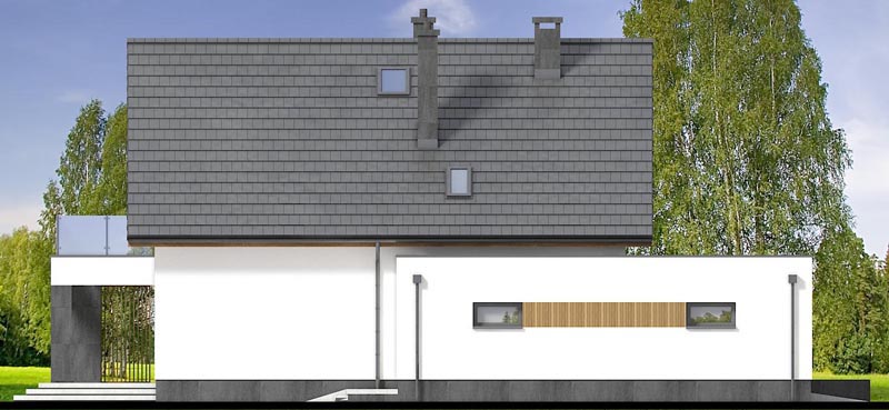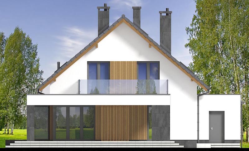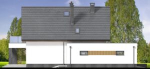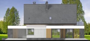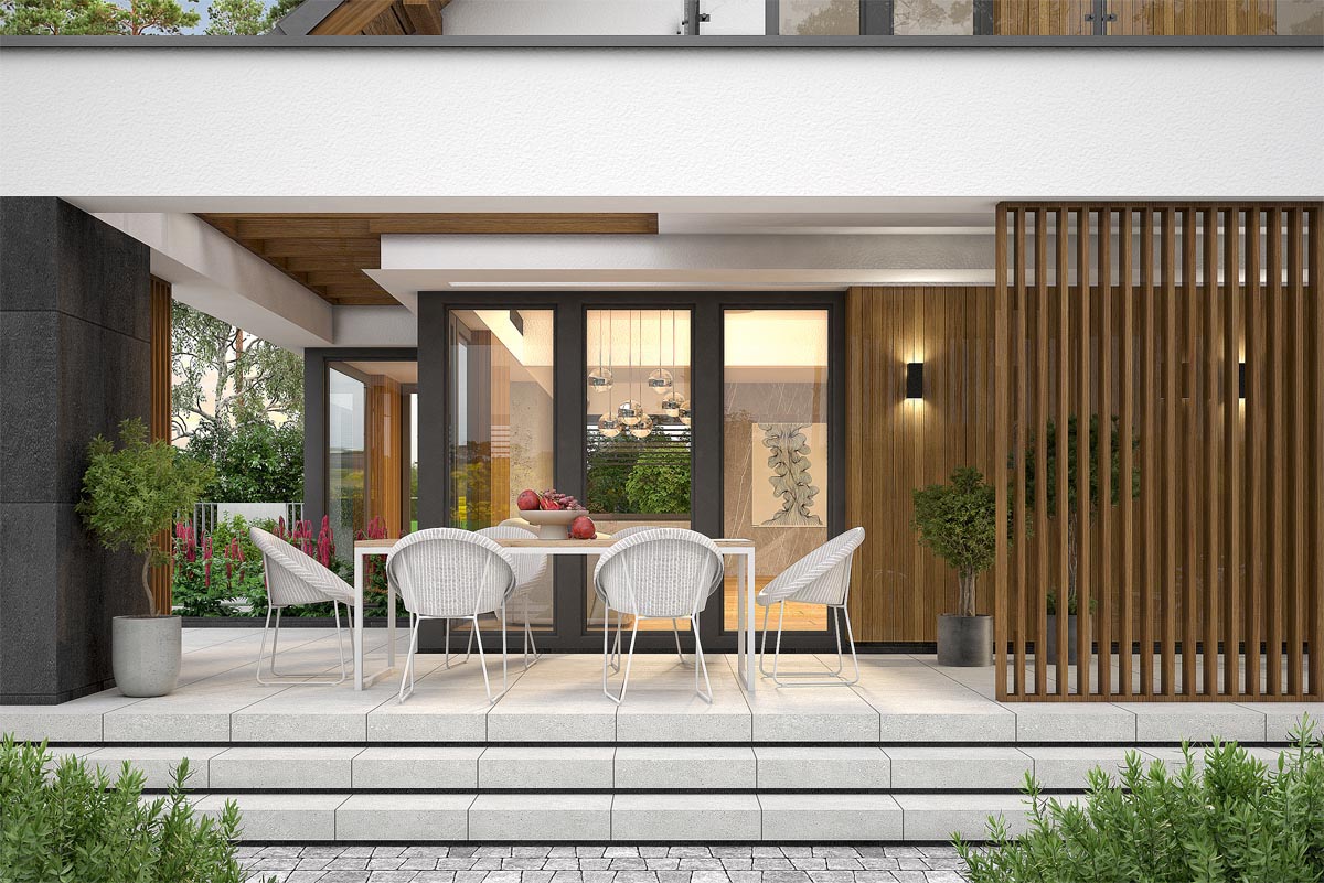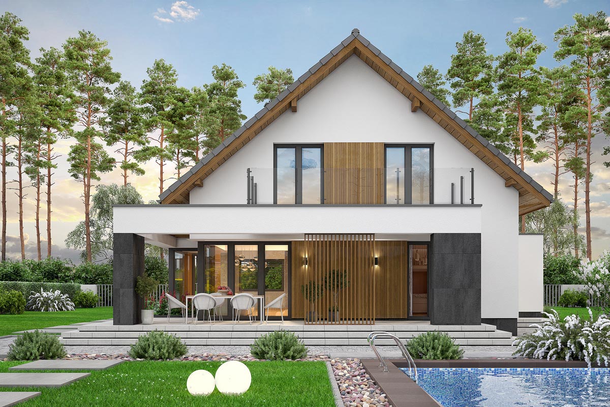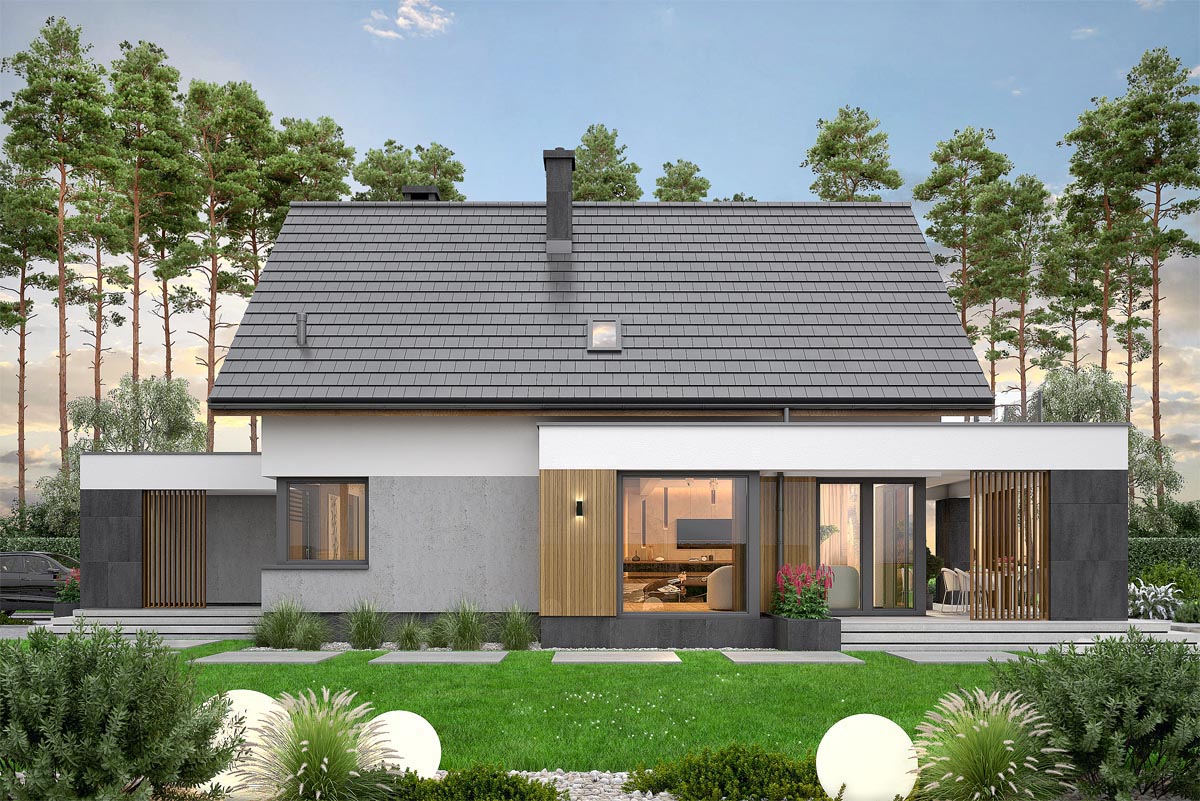 Od tyłu dom zachwyca przeszklonym salonem, z którego rozpościera się widok na taras i ogród. Subtelne drewniane panele dodają elewacji przytulności i stylu, a zadaszenie nad częścią tarasową zapewnia komfortowy wypoczynek w każdą pogodę.