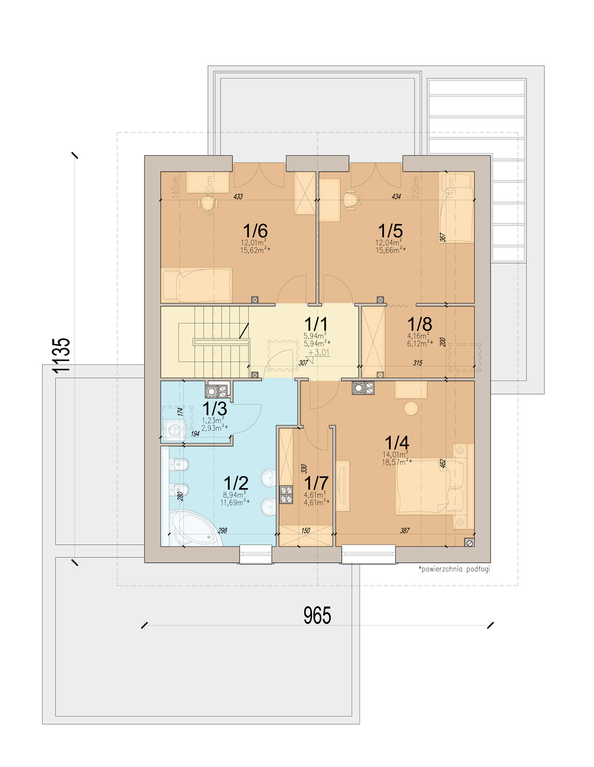 Poddasze oferuje trzy ustawne sypialnie, łazienkę z pralnią, oraz dwie garderoby.