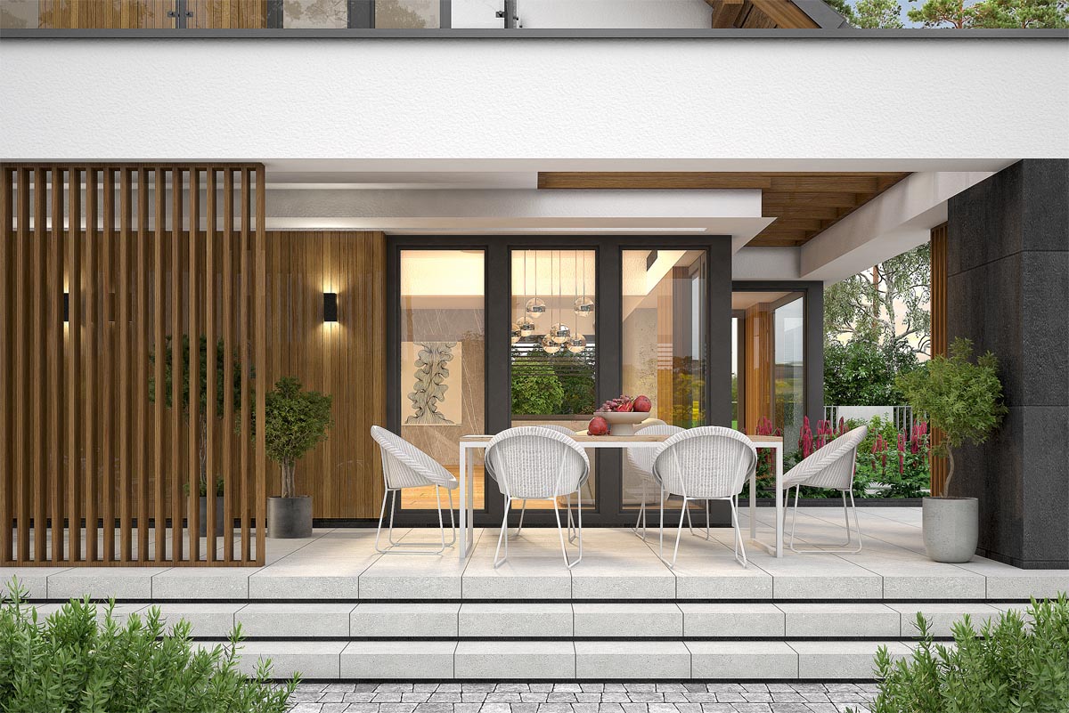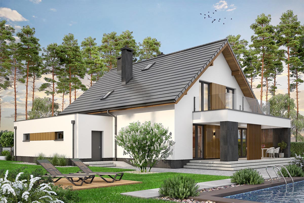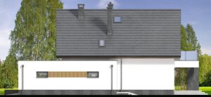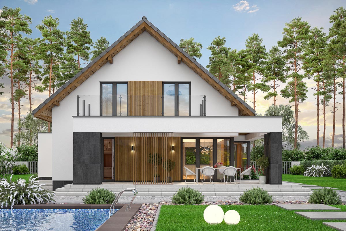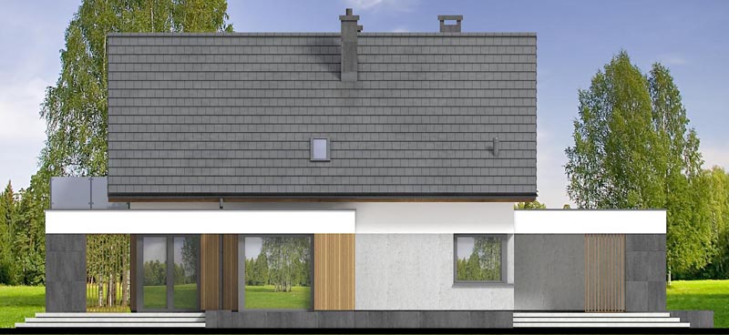 Od tyłu dom zachwyca przeszklonym salonem, z którego rozpościera się widok na taras i ogród. Subtelne drewniane panele dodają elewacji przytulności i stylu, a zadaszenie nad częścią tarasową zapewnia komfortowy wypoczynek w każdą pogodę.