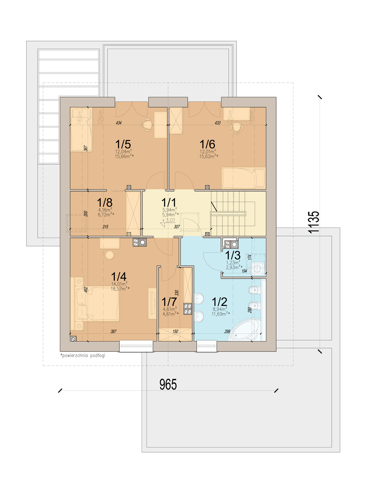 Poddasze oferuje trzy ustawne sypialnie, łazienkę z pralnią, oraz dwie garderoby.