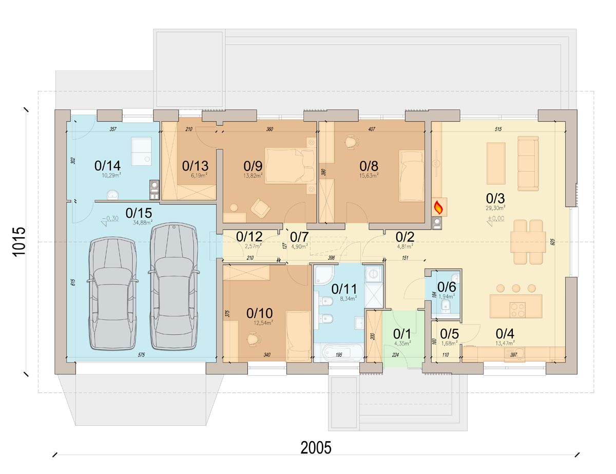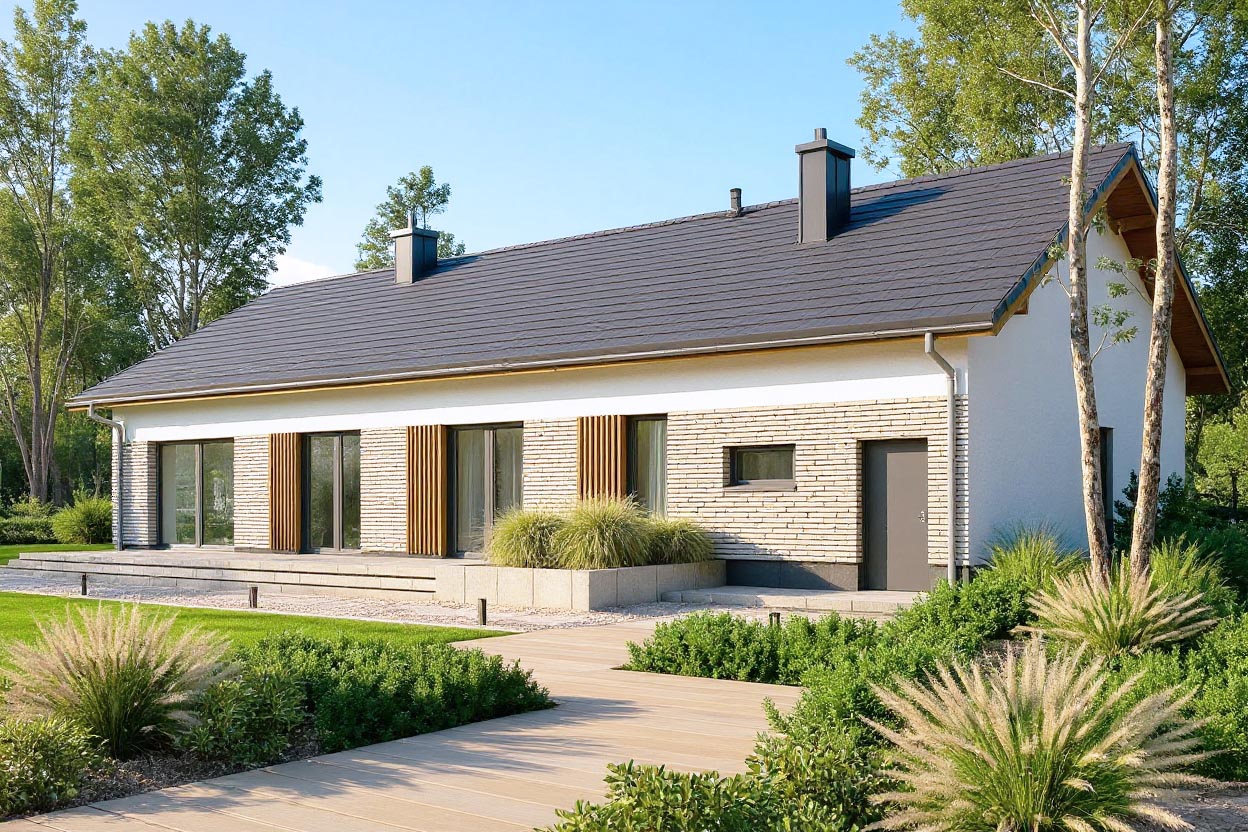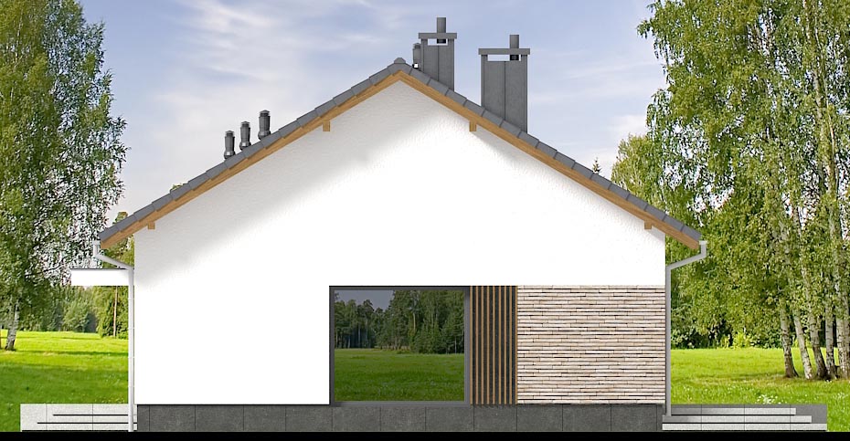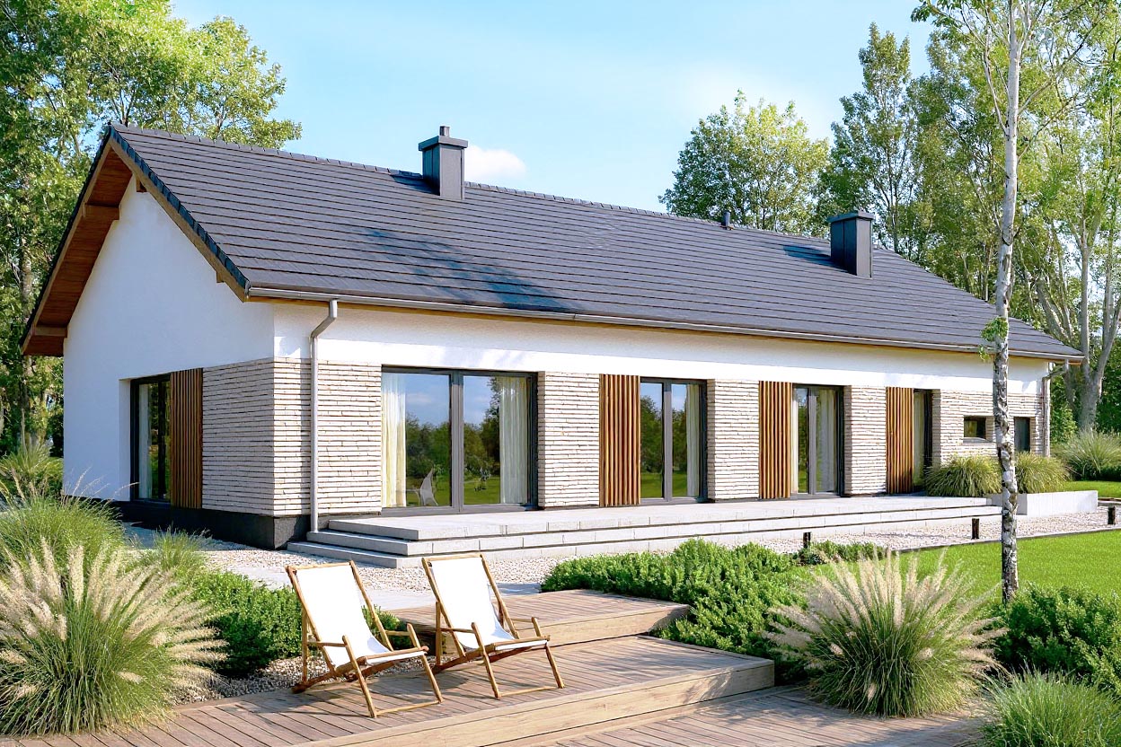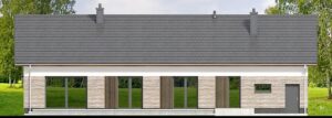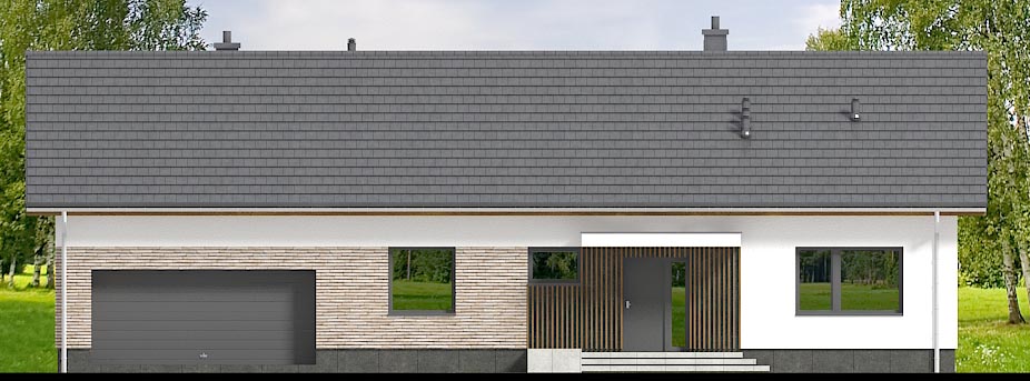 Pigwa to nowoczesny dom parterowy z garażem dwustanowiskowym, doskonały dla 4–5 osobowej rodziny. Elewacje to połączenie jasnego i ciemnego tynku,cegły, oraz drewna w postaci lameli, które razem tworzą harmonijną i przyjazną całość.
