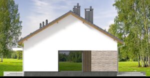 Wnętrze domu zaprojektowano z myślą o komforcie codziennego życia. Salon z wygodnym miejscem do wypoczynku, jadalnia oraz kominek, który nadaje wnętrzu ciepły i przytulny klimat. Z salonem łączy się otwarta kuchnia, która daje swobodę aranżacyjną i ułatwia codzienne gotowanie oraz kontakt z resztą domowników. Do dyspozycji mieszkańców przewidziano trzy ustawne pokoje, z czego jeden posiada prywatną garderobę. W domu znajduję się przestronna łazienka oraz osobna toaleta, co znacząco podnosi komfort użytkowania. Aby można było wykorzystać poddasze, w korytarzu wyznaczono otwór w stropie na schody spuszczane. Dom wyposażono w garaż dwustanowiskowy i kotłownię, oddzieloną od strefy mieszkalnej. Zaprojektowano w niej ogrzewanie na paliwo stałe, oraz instalację gazową co ułatwi na etapie adaptacji zmianę źródła ogrzewania na gazowe.
