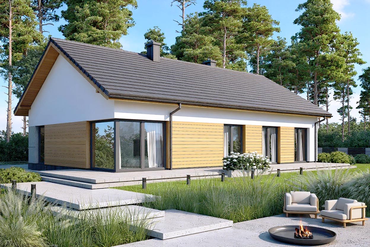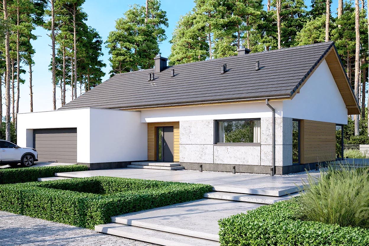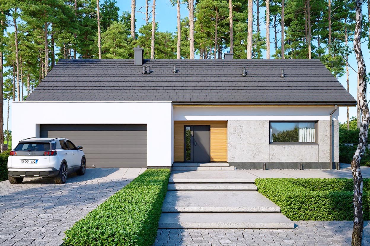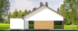 Elewacje projektu zachwycają elegancką prostotą i subtelną nowoczesnością. Harmonijne połączenie jasnego tynku z naturalnymi materiałami wykończeniowymi. Od strony ogrodu imponujące przeszklenia od podłogi do sufitu otwierają wnętrze na zieleń, optycznie powiększając przestrzeń i tworząc płynne przejście między domem a tarasem.