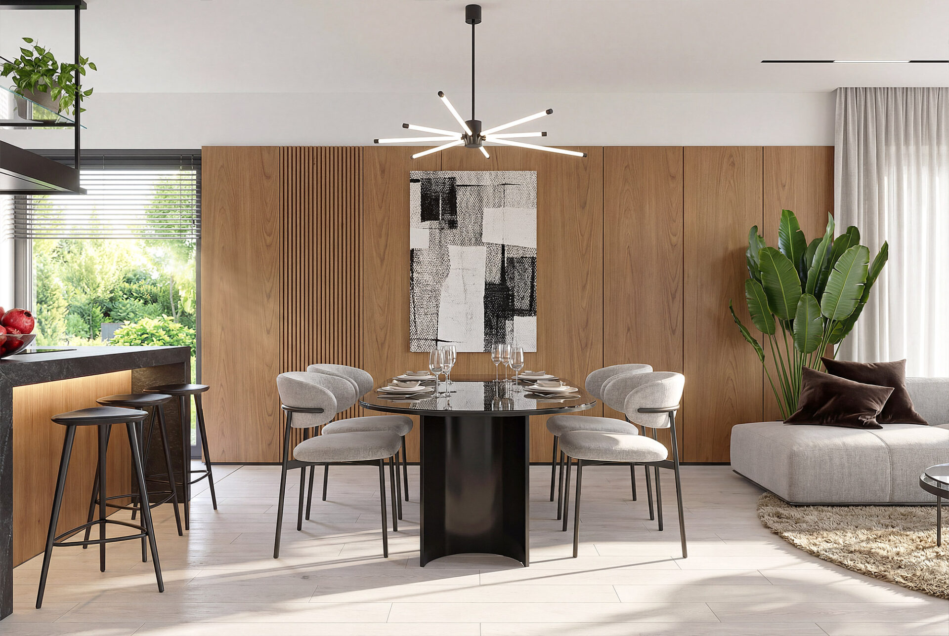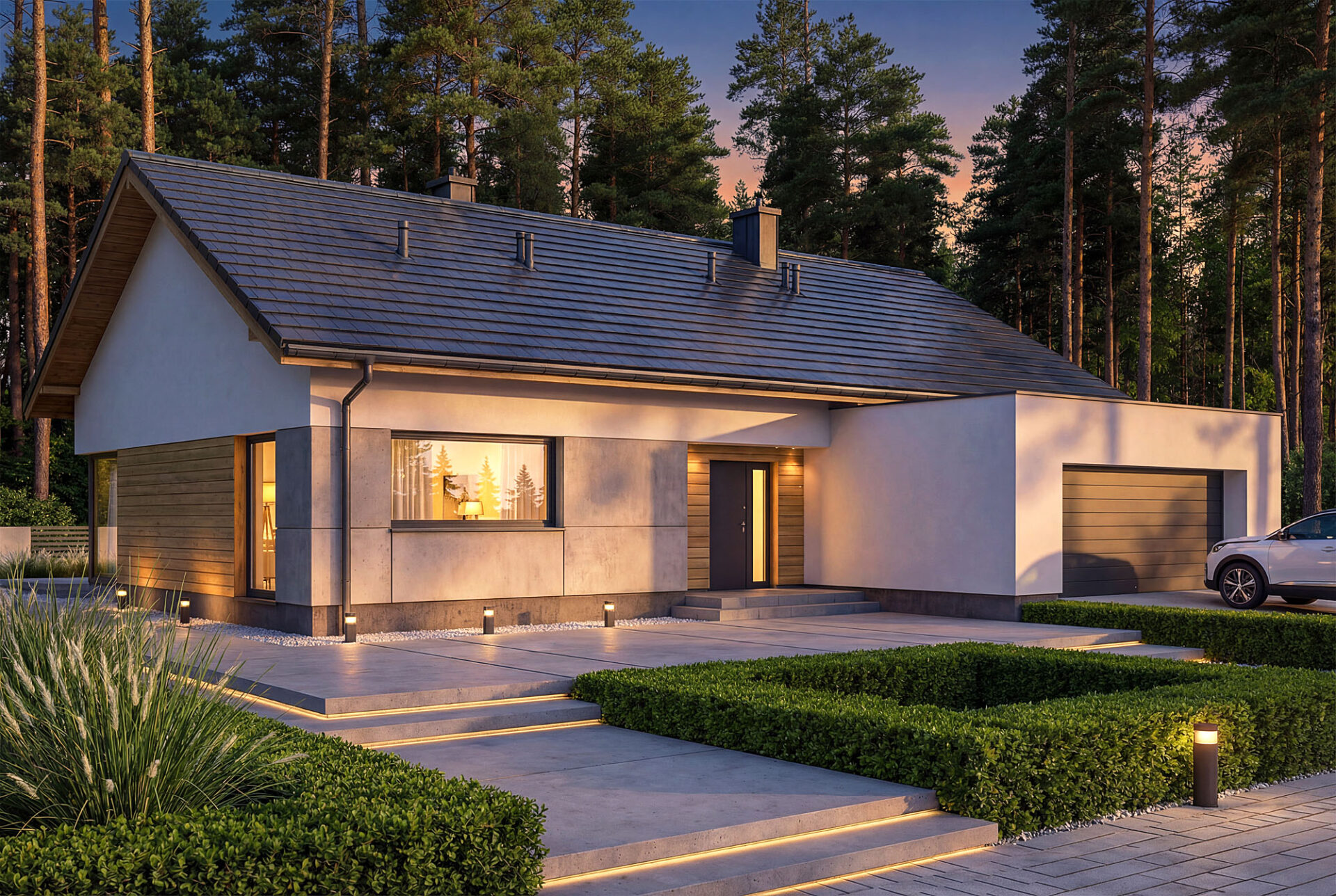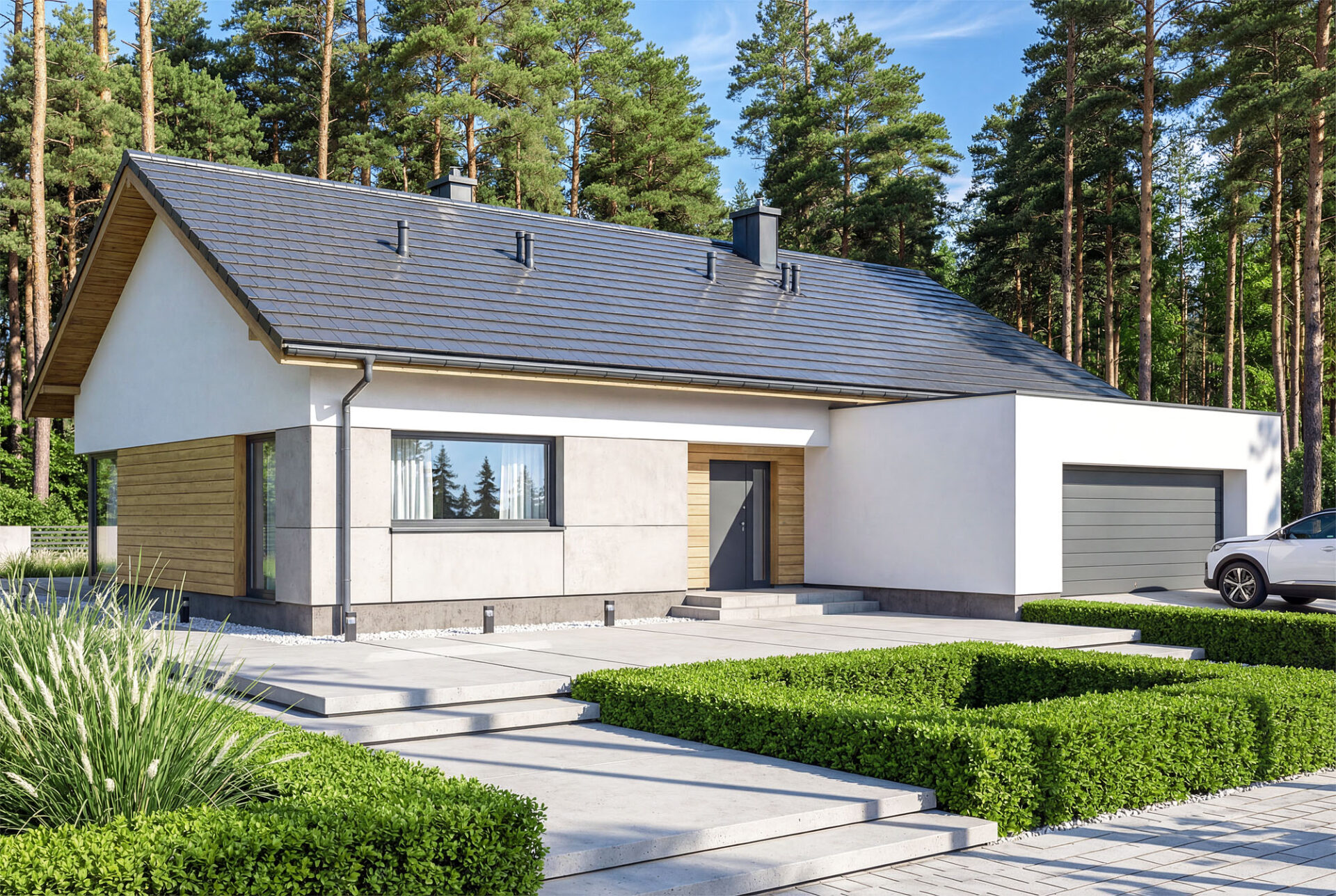 Elewacje projektu zachwycają elegancką prostotą i subtelną nowoczesnością. Harmonijne połączenie jasnego tynku z naturalnymi materiałami wykończeniowymi. Od strony ogrodu imponujące przeszklenia od podłogi do sufitu otwierają wnętrze na zieleń, optycznie powiększając przestrzeń i tworząc płynne przejście między domem a tarasem.