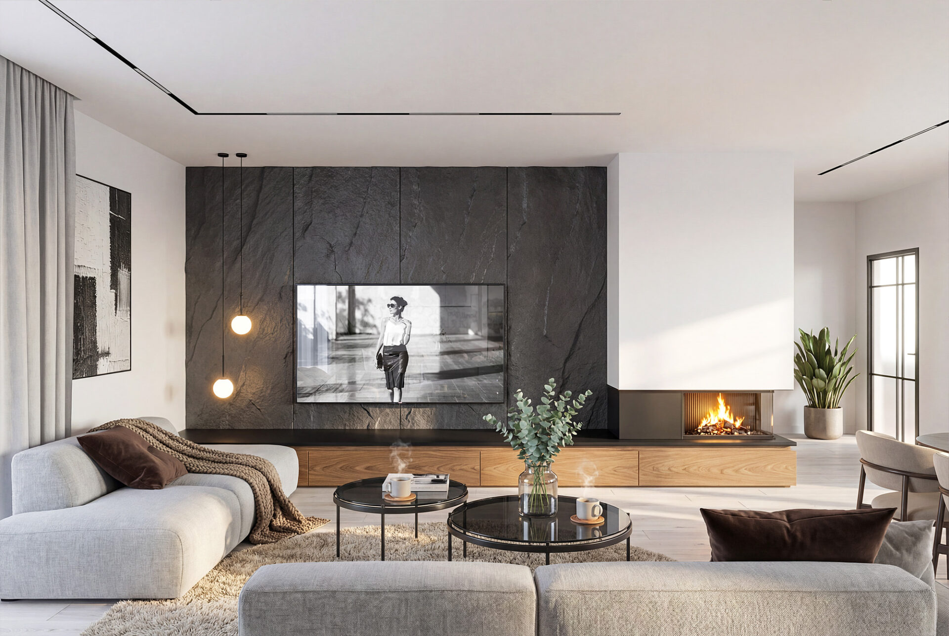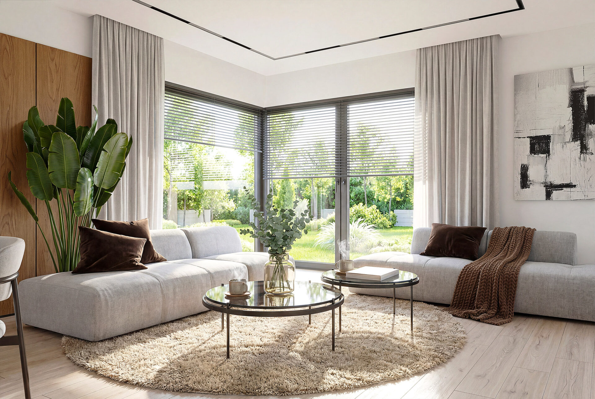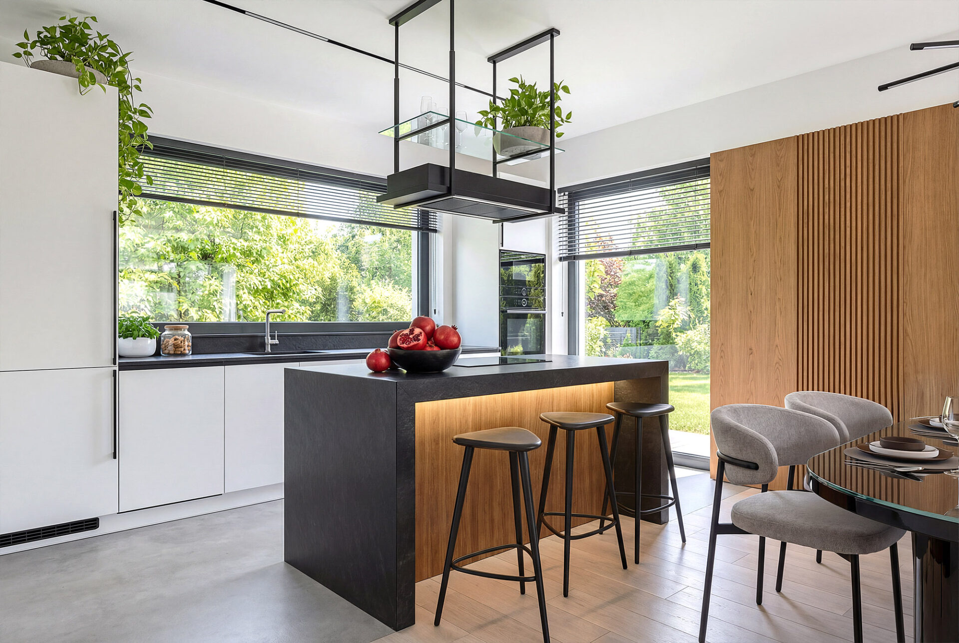 Elewacje projektu zachwycają elegancką prostotą i subtelną nowoczesnością. Harmonijne połączenie jasnego tynku z naturalnymi materiałami wykończeniowymi. Od strony ogrodu imponujące przeszklenia od podłogi do sufitu otwierają wnętrze na zieleń, optycznie powiększając przestrzeń i tworząc płynne przejście między domem a tarasem.