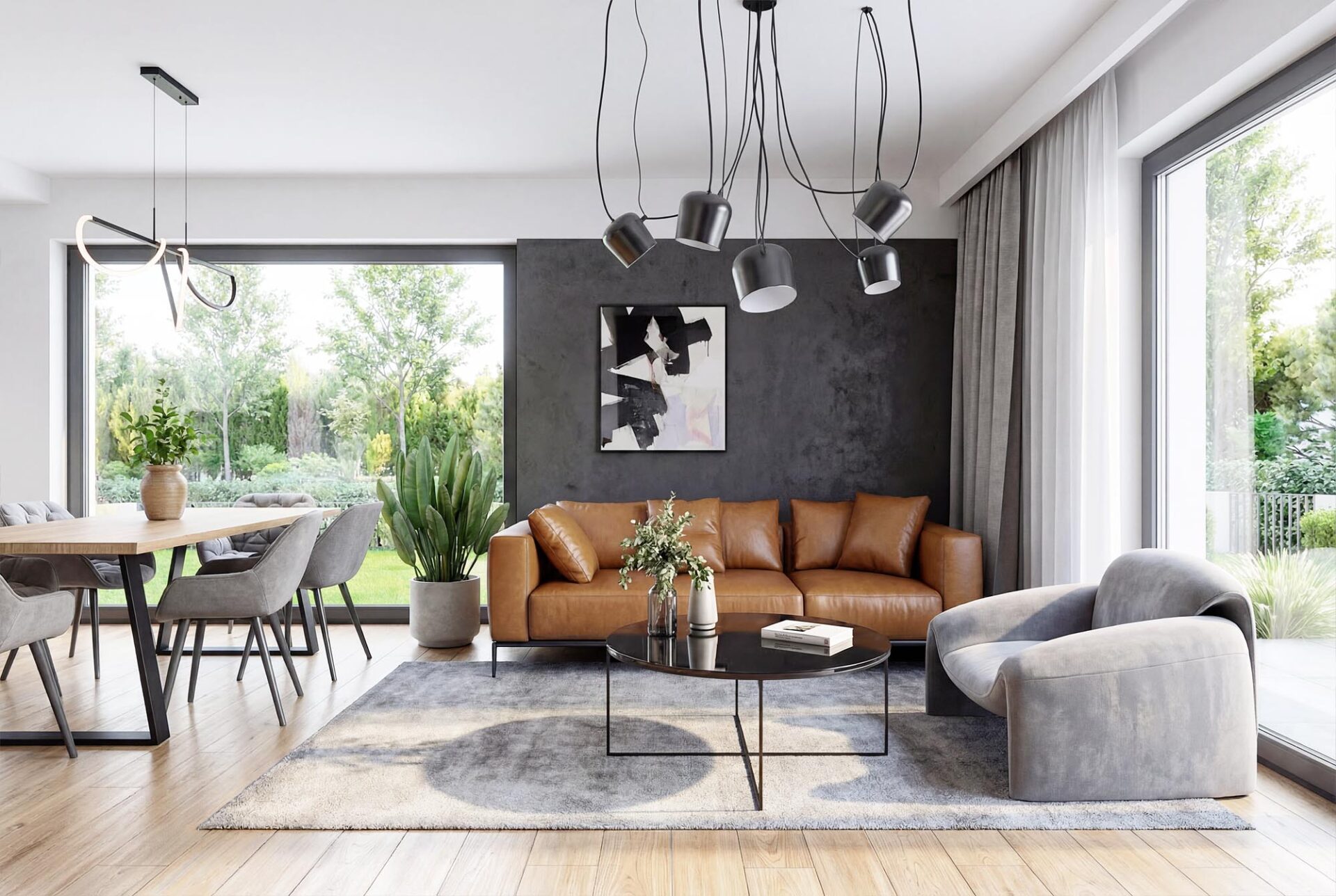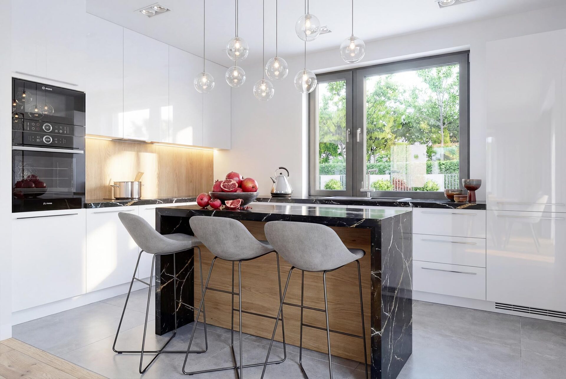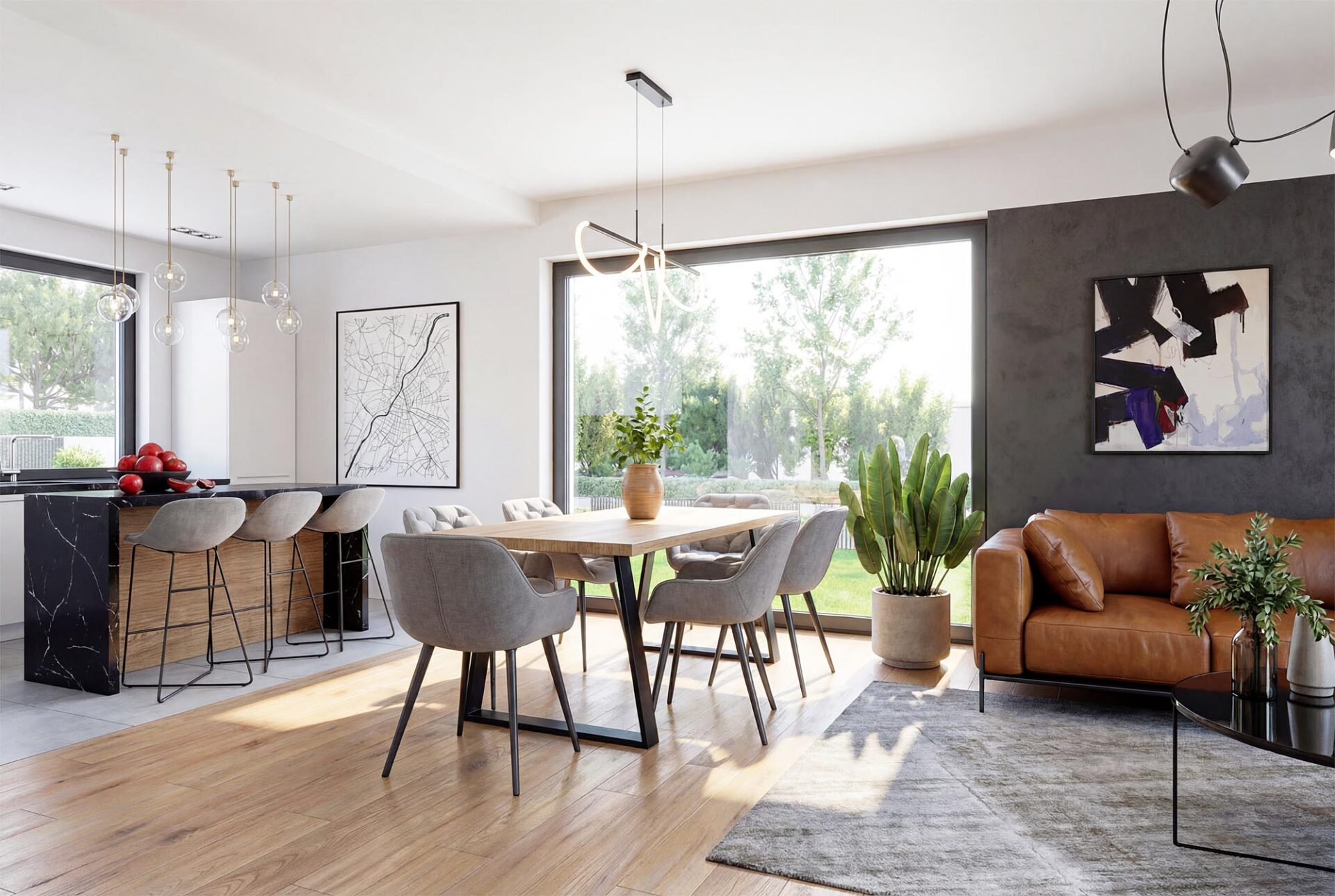Dużym atutem projektu jest przestronny salon otwarty na jadalnię z panoramicznym oknem. Projekt posiada również bardzo efektowną kuchnię z centralnie umieszczona wyspą. Co ważne, przewidziano w niej miejsce na dużą ilość blatów roboczych oraz słup z piekarnikiem.