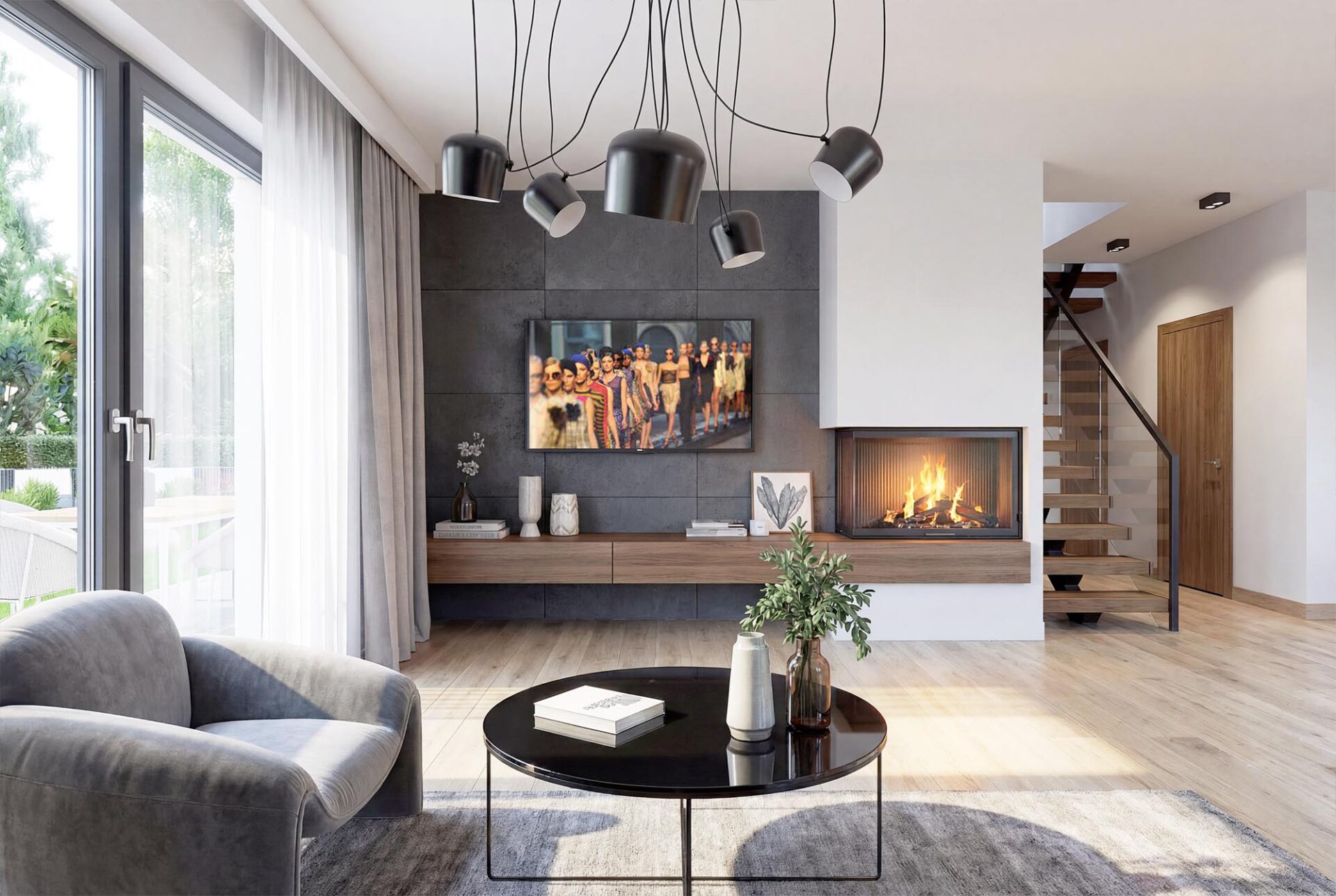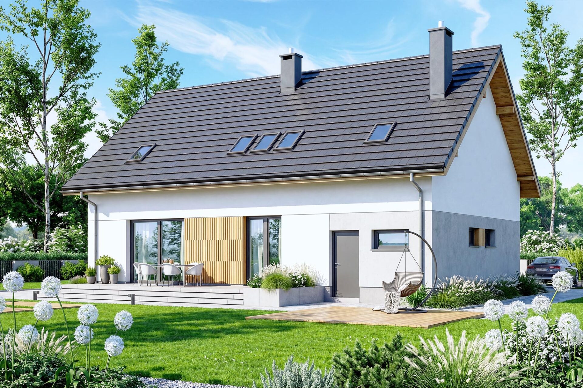 Współczesny wygląd, sprawia że świetnie wpisuje się w każde otoczenie. Uwagę zwraca ciekawie zaprojektowana elewacja. Subtelne połącznie materiałów w stylu betonu, kamienia i drewna , tworzy elegancki styl i niepowtarzalny charakter.
