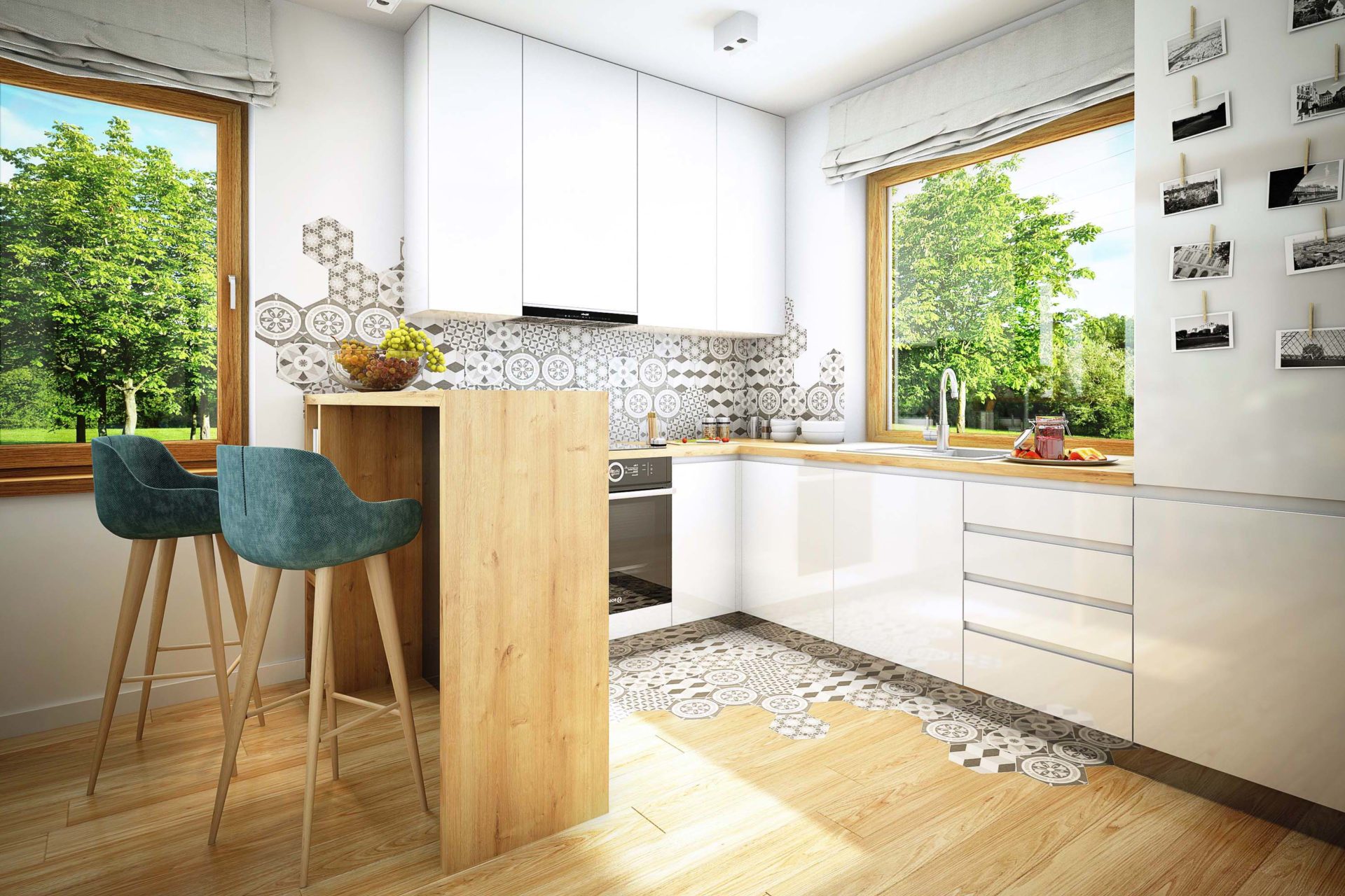 Dużym atutem projektu jest otwarty salon z miejscem na jadalnię i centralnie umieszczonym kominkiem. Kolejną zaletą jest duża kuchnia ze spiżarnią.