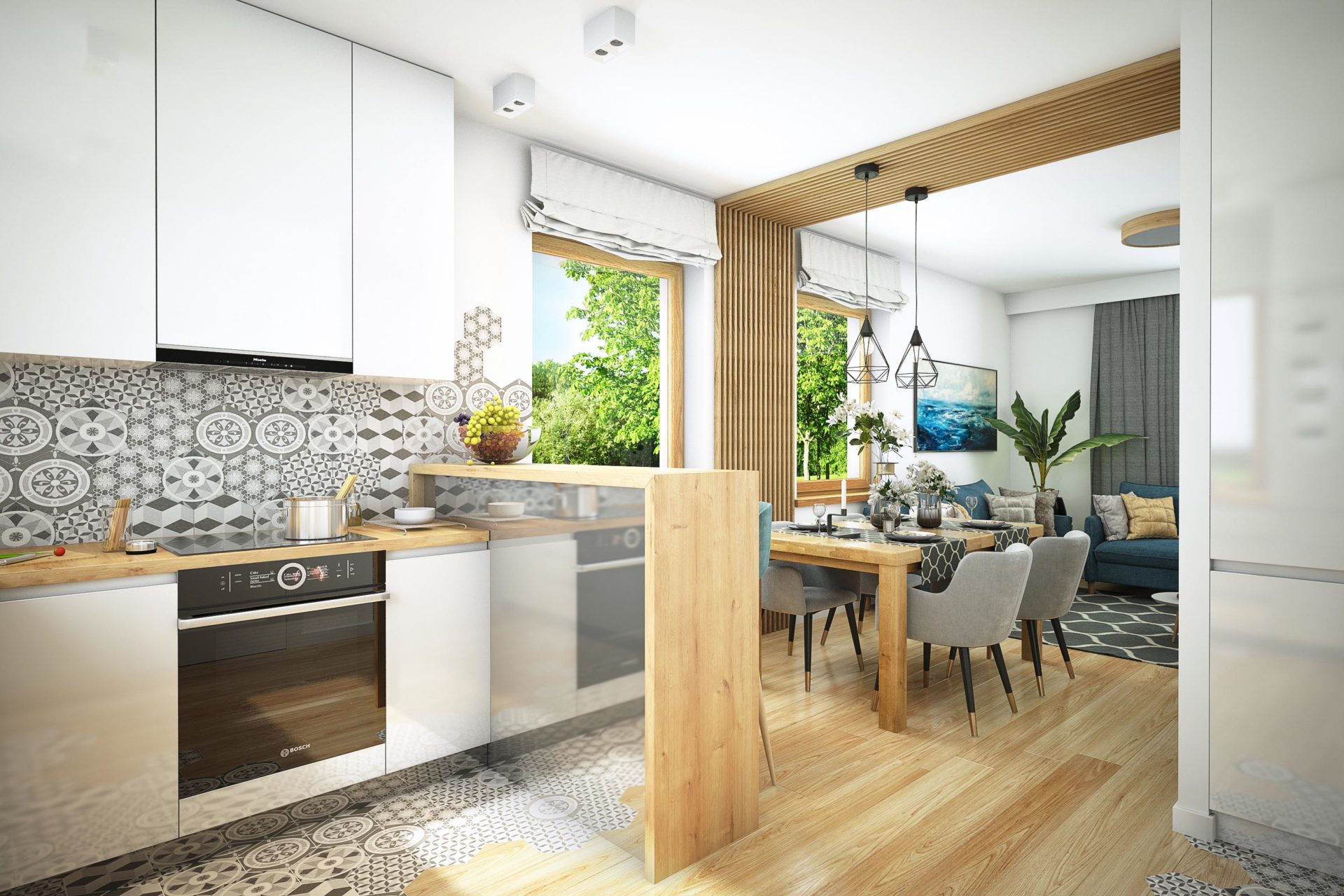 Dużym atutem projektu jest otwarty salon z miejscem na jadalnię i centralnie umieszczonym kominkiem. Kolejną zaletą jest duża kuchnia ze spiżarnią.