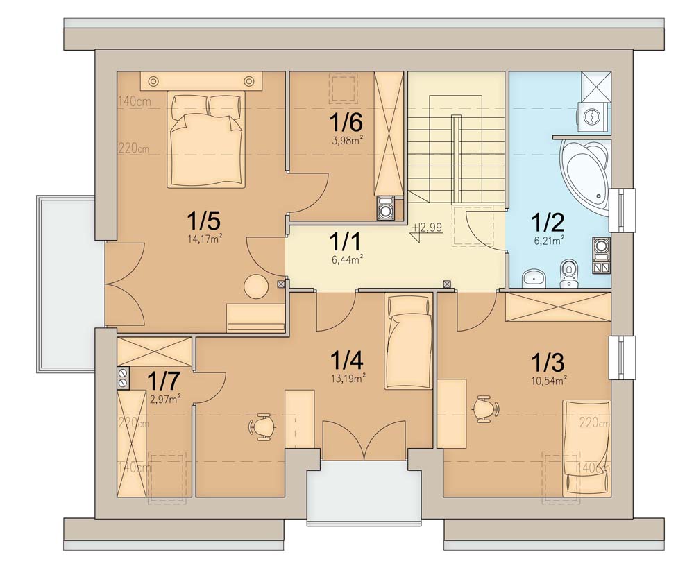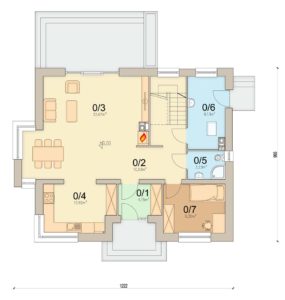 Na wejściu znajduje się wiatrołap z miejscem na dużą szafę. Zapraszająca do wspólnego spędzania czasu otwarta strefa dzienna zachwyca swą niezwykłą przestronnością. Dodatkowym uatrakcyjnieniem jest jadalnia znajdująca się w wykuszu. Atutem jest też obszerna kuchnia z dużą ilością blatów, oraz miejscem na zabudowę. Pomieszczenie to można łatwo wydzielić. W projekcie przewidziano miejsce na wygodne, dwubiegowe schody. Pokój gościnny z dodatkową łazienką na parterze sprawia, że poddasze staje się strefą wyłączną dla domowników. Dom posiada aż dwie garderoby, co z pewnością gwarantuje większy komfort i porządek. W przestrzennej łazience wydzielono miejsce na pralkę. Tofi 4 posiada wysoką ściankę kolankową, co wpływa na zwiększoną wygodę oraz więcej miejsca do wykorzystania. W projekcie uwzględniono też pomieszczenie gospodarcze z bezpośrednim wyjściem na ogród.