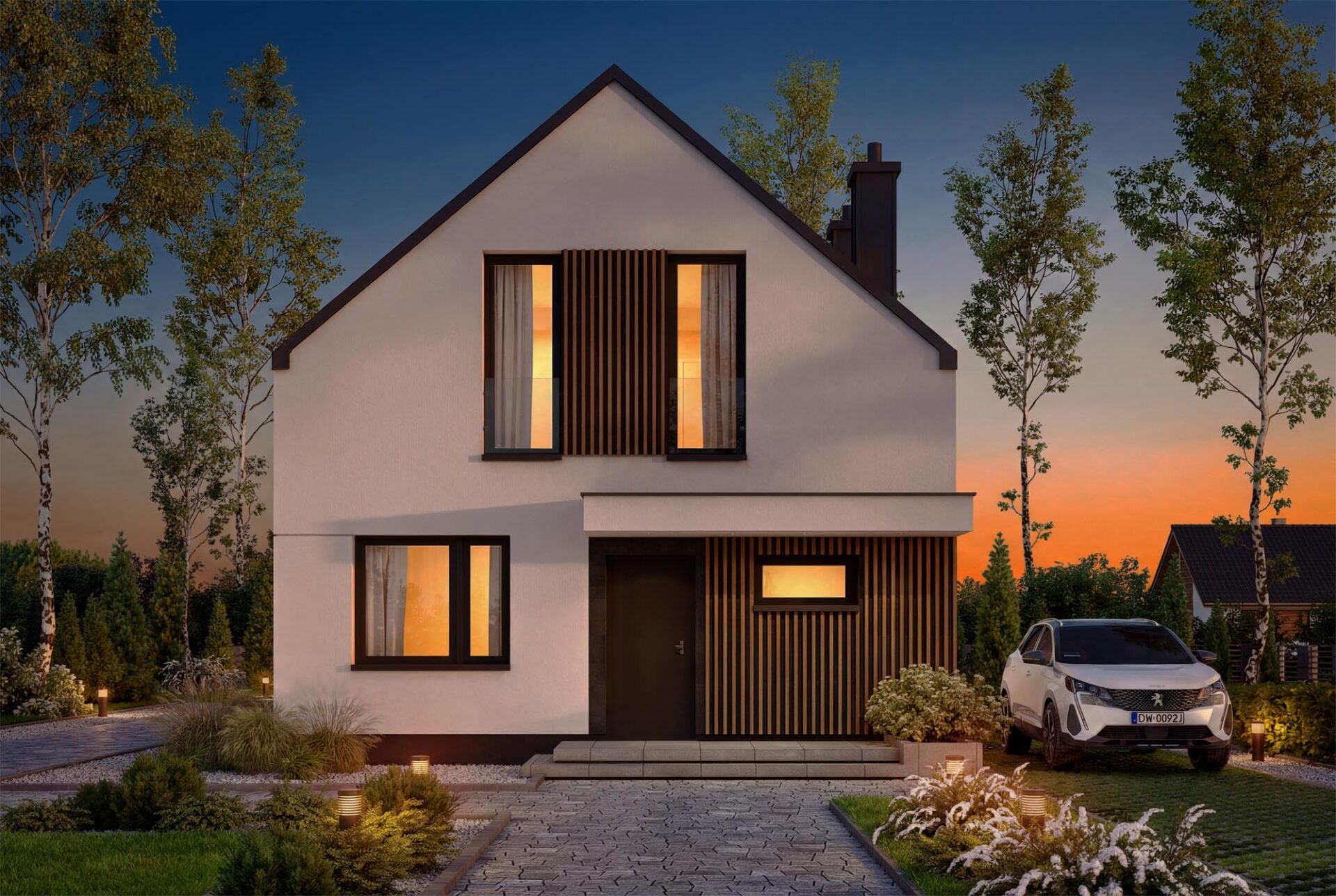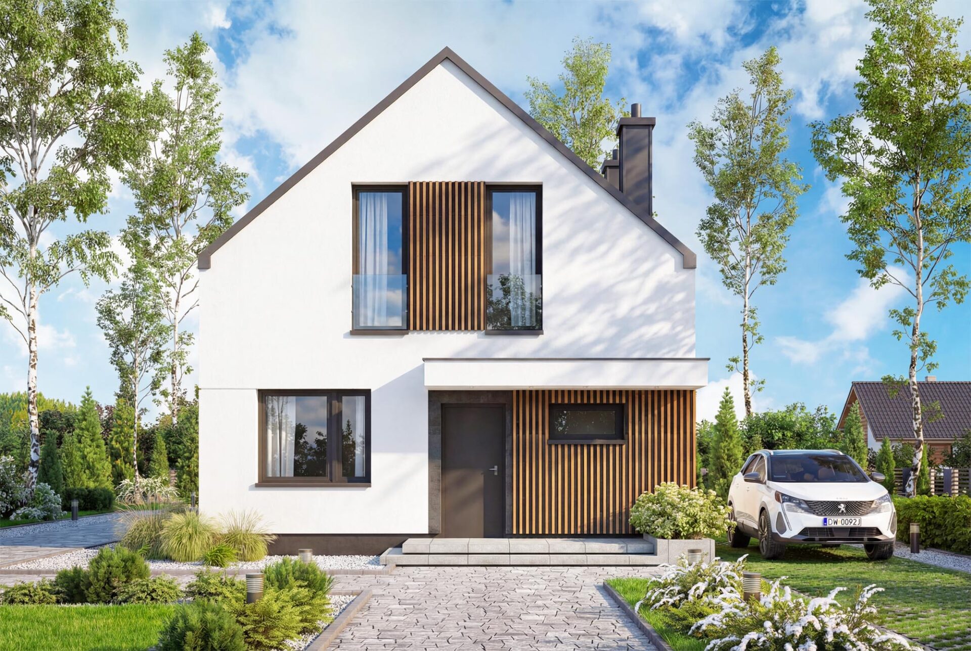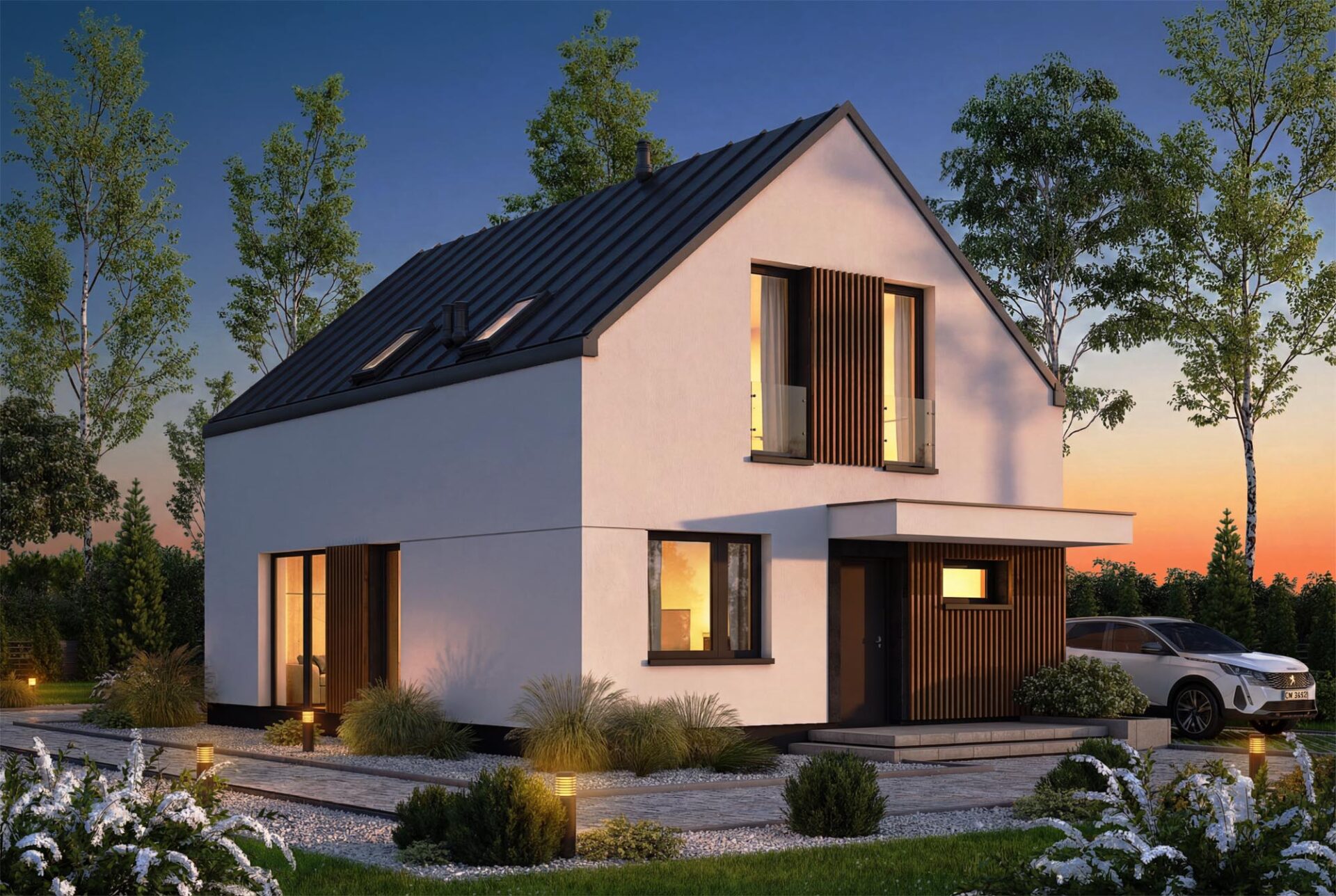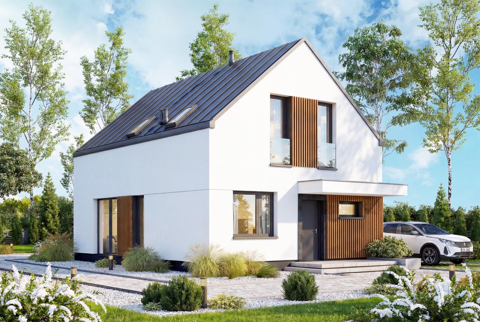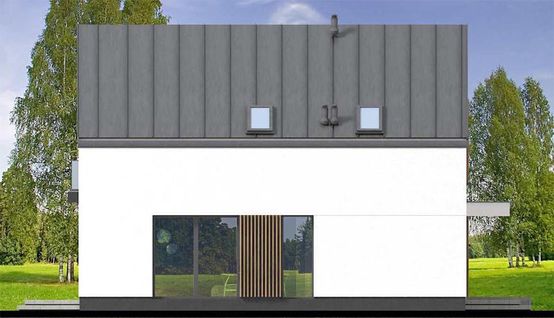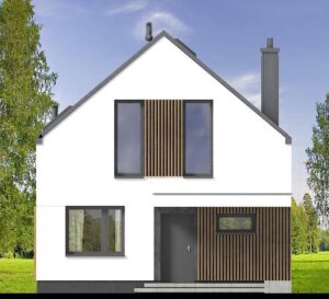 Vincent 4 mini 2 to projekt stworzony z myślą o codziennym komforcie, bliskości domowników i harmonii we wnętrzach. Już od pierwszego spojrzenia budzi zaufanie, łącząc ponadczasową elegancję z nowoczesnym sznytem. Od frontu uwagę przyciąga minimalistyczne zadaszenie wejścia, które nie tylko chroni przed deszczem, ale nadaje domowi wyrazistości. Ciepłe akcenty z pionowego drewna przełamują biel tynku, wprowadzając przytulność i przyjazny klimat. Elewacja ogrodowa posiada imponujące przeszklenia otwierają salon oraz sypialnie na ogród. Wyjście na taras oraz balkon na piętrze to przestrzenie stworzone z myślą o celebrowaniu codzienności. Salon połączony z jadalnią to serce tego domu – przestrzeń pełna światła i ciepła, w której życie toczy się naturalnym rytmem. Otwarta kuchnia sprawia, że przygotowywanie posiłków staje się częścią rodzinnego życia, a nie odizolowanym obowiązkiem. Praktyczny układ pozwala zachować pełną funkcjonalność, jednocześnie dając poczucie przestrzeni. Na parterze znajduje się także dodatkowy pokój – może pełnić rolę gabinetu, pokoju gościnnego. Obok zaplanowano wygodną łazienkę, funkcjonalny wiatrołap z miejscem na szafę oraz kotłownia, którą oddzielono od części mieszkalnej poprzez wiatrołap. Zaprojektowano w niej ogrzewanie na paliwo stałe, oraz instalację gazową co ułatwi na etapie adaptacji zmianę źródła ogrzewania na gazowe. Poddasze to z kolei prywatna strefa domowników – trzy wygodne sypialnie dają poczucie intymności i przestrzeni do odpoczynku, nauki czy pracy. Wygodna łazienka z wanną spełni potrzeby każdego