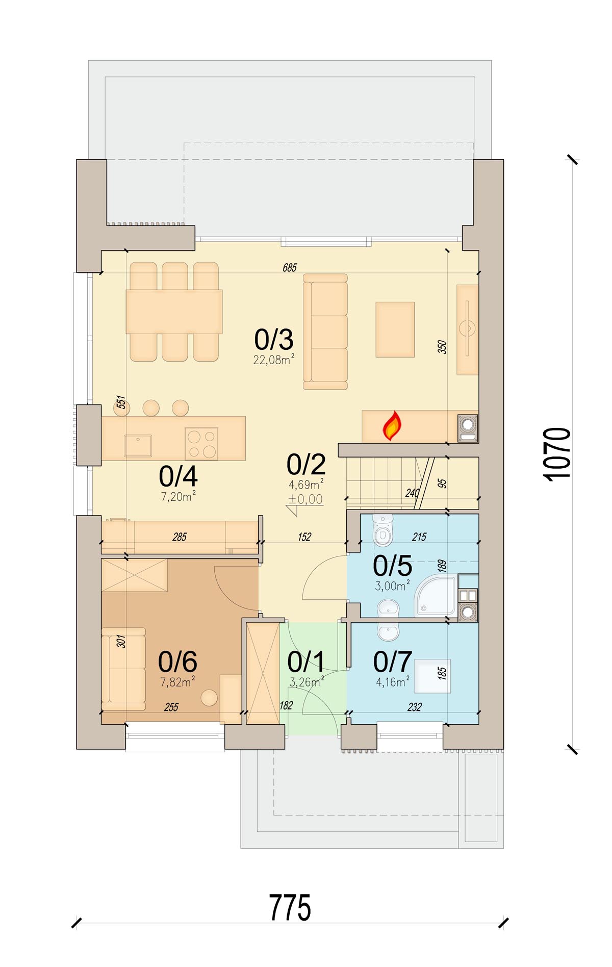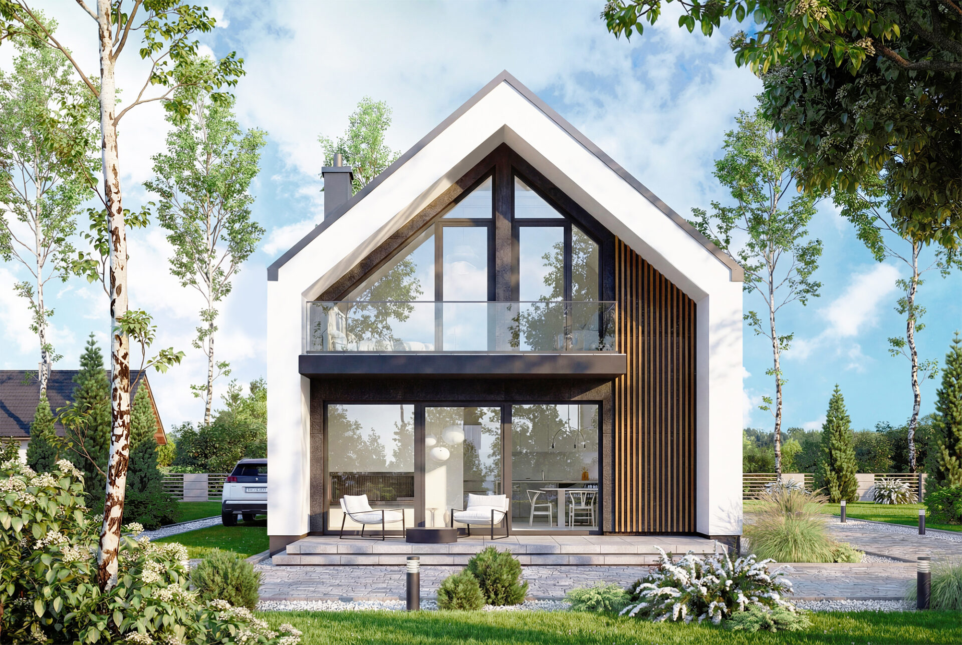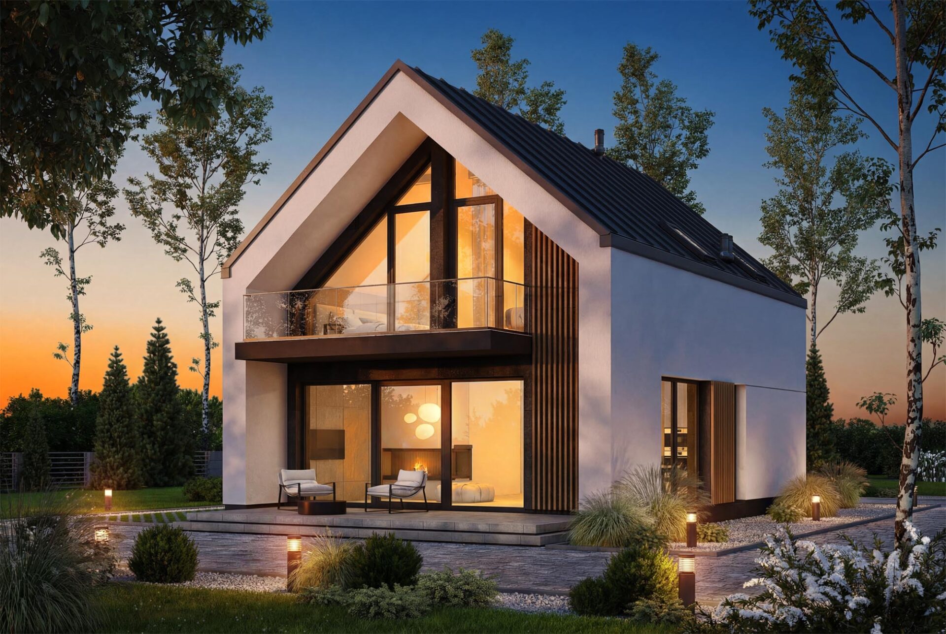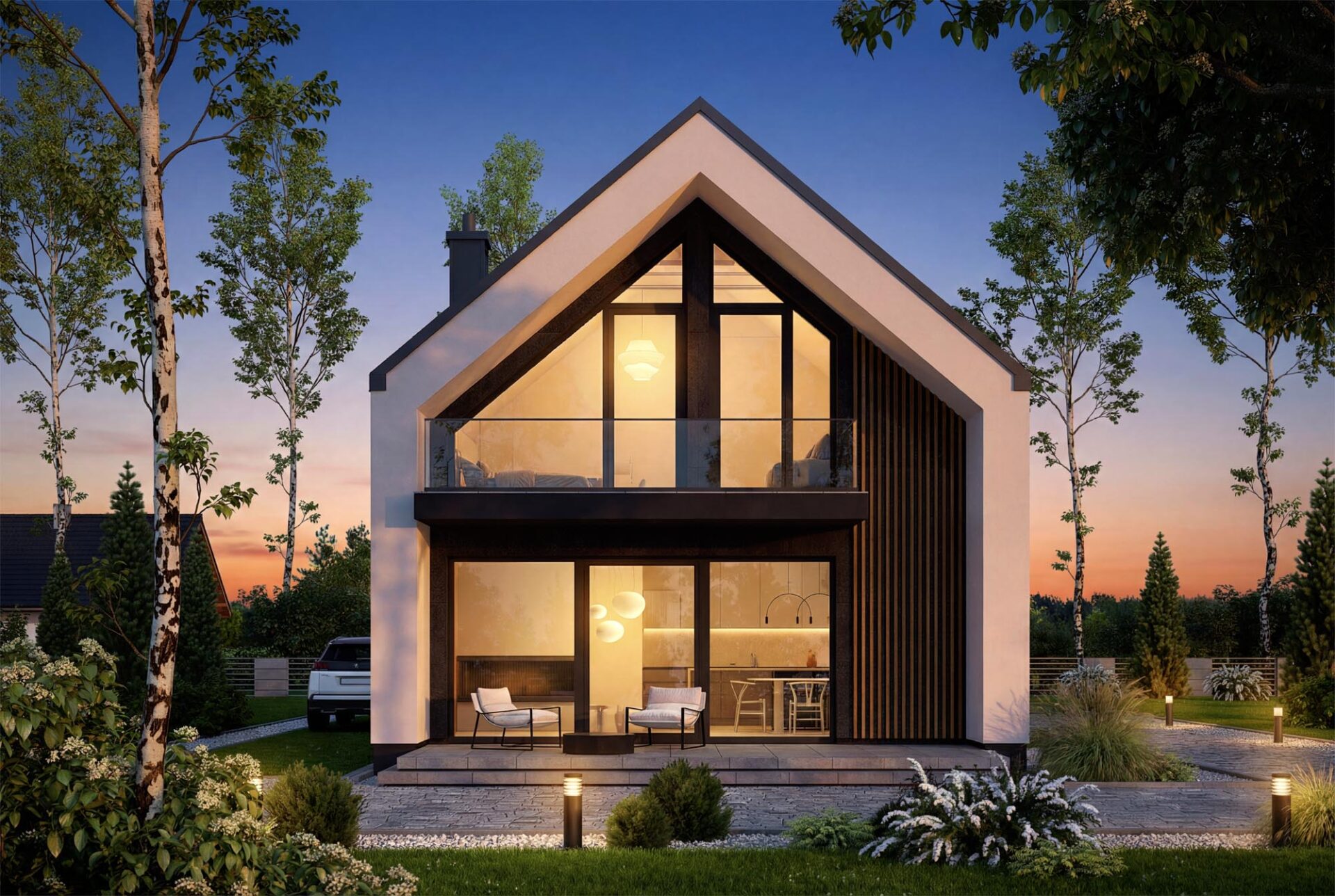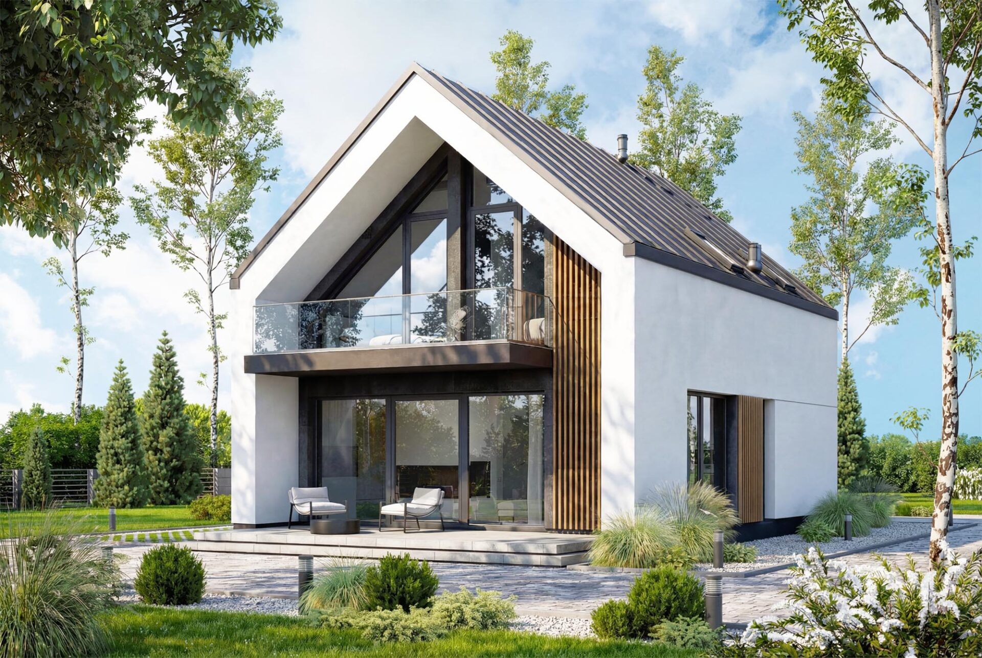 Vincent 4 mini 2 to projekt stworzony z myślą o codziennym komforcie, bliskości domowników i harmonii we wnętrzach. Już od pierwszego spojrzenia budzi zaufanie, łącząc ponadczasową elegancję z nowoczesnym sznytem. Od frontu uwagę przyciąga minimalistyczne zadaszenie wejścia, które nie tylko chroni przed deszczem, ale nadaje domowi wyrazistości. Ciepłe akcenty z pionowego drewna przełamują biel tynku, wprowadzając przytulność i przyjazny klimat. Elewacja ogrodowa posiada imponujące przeszklenia otwierają salon oraz sypialnie na ogród. Wyjście na taras oraz balkon na piętrze to przestrzenie stworzone z myślą o celebrowaniu codzienności. Salon połączony z jadalnią to serce tego domu – przestrzeń pełna światła i ciepła, w której życie toczy się naturalnym rytmem. Otwarta kuchnia sprawia, że przygotowywanie posiłków staje się częścią rodzinnego życia, a nie odizolowanym obowiązkiem. Praktyczny układ pozwala zachować pełną funkcjonalność, jednocześnie dając poczucie przestrzeni. Na parterze znajduje się także dodatkowy pokój – może pełnić rolę gabinetu, pokoju gościnnego. Obok zaplanowano wygodną łazienkę, funkcjonalny wiatrołap z miejscem na szafę oraz kotłownia, którą oddzielono od części mieszkalnej poprzez wiatrołap. Zaprojektowano w niej ogrzewanie na paliwo stałe, oraz instalację gazową co ułatwi na etapie adaptacji zmianę źródła ogrzewania na gazowe. Poddasze to z kolei prywatna strefa domowników – trzy wygodne sypialnie dają poczucie intymności i przestrzeni do odpoczynku, nauki czy pracy. Wygodna łazienka z wanną spełni potrzeby każdego