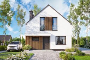 Vincent 4 mini 2 to projekt stworzony z myślą o codziennym komforcie, bliskości domowników i harmonii we wnętrzach. Już od pierwszego spojrzenia budzi zaufanie, łącząc ponadczasową elegancję z nowoczesnym sznytem. Od frontu uwagę przyciąga minimalistyczne zadaszenie wejścia, które nie tylko chroni przed deszczem, ale nadaje domowi wyrazistości. Ciepłe akcenty z pionowego drewna przełamują biel tynku, wprowadzając przytulność i przyjazny klimat. Elewacja ogrodowa posiada imponujące przeszklenia otwierają salon oraz sypialnie na ogród. Wyjście na taras oraz balkon na piętrze to przestrzenie stworzone z myślą o celebrowaniu codzienności. Salon połączony z jadalnią to serce tego domu – przestrzeń pełna światła i ciepła, w której życie toczy się naturalnym rytmem. Otwarta kuchnia sprawia, że przygotowywanie posiłków staje się częścią rodzinnego życia, a nie odizolowanym obowiązkiem.
